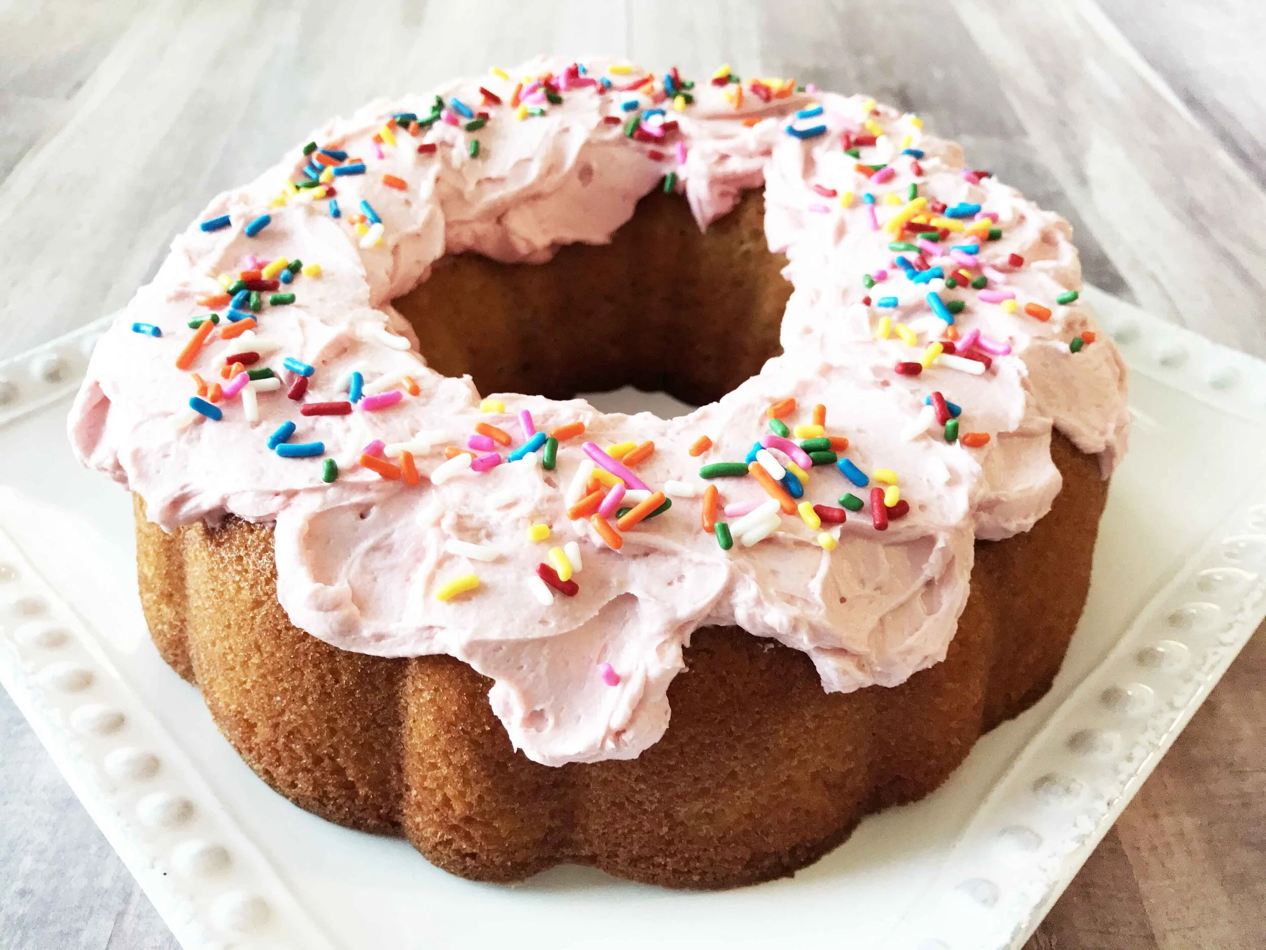I've made this giant donut cake with a from scratch batter that includes LOTS of vanilla and a whole wheat flour. Other than that I subbed in some sugar substitute and an unsweetened almond milk in place of regular milk. With these few swaps I ended up with a more guilt-free cake that tasted amazing.