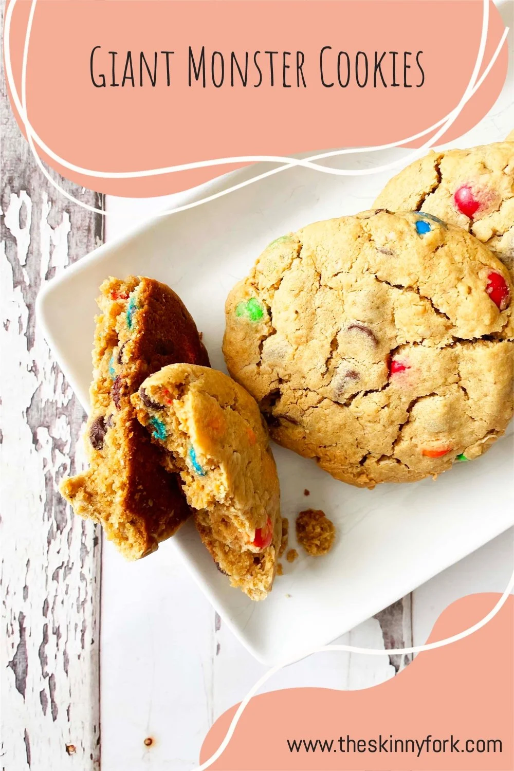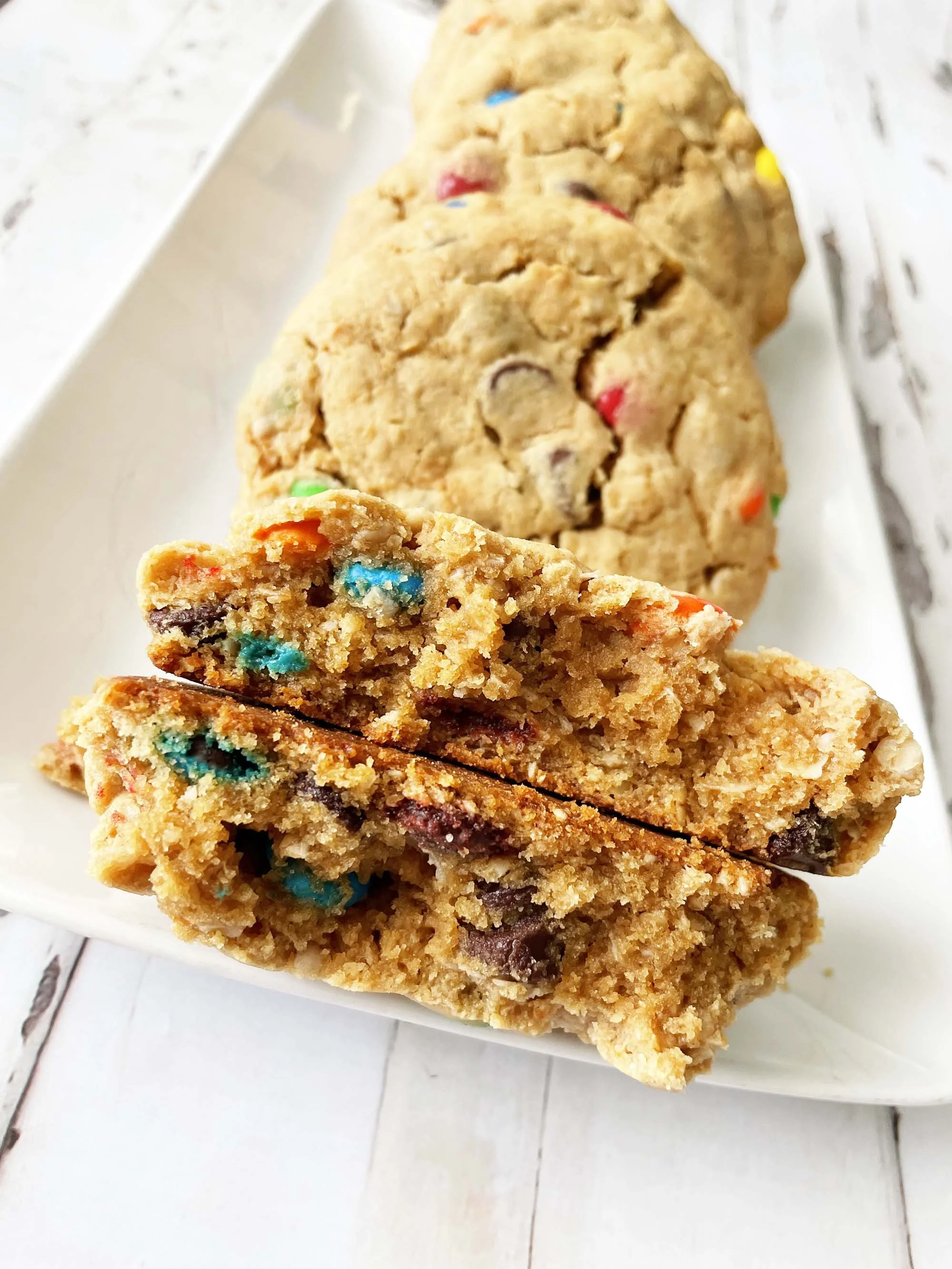 From Cookie Monster Cookies, now to these Giant Monster Cookies! I love making BIG cookies. These Giant Monster Cookies are peanut butter dough based and are loaded up with chocolate chips and M&M’s! They are fairly easy to make and all come together in one bowl with no chilling required, which quite honestly is one of my favorite parts.