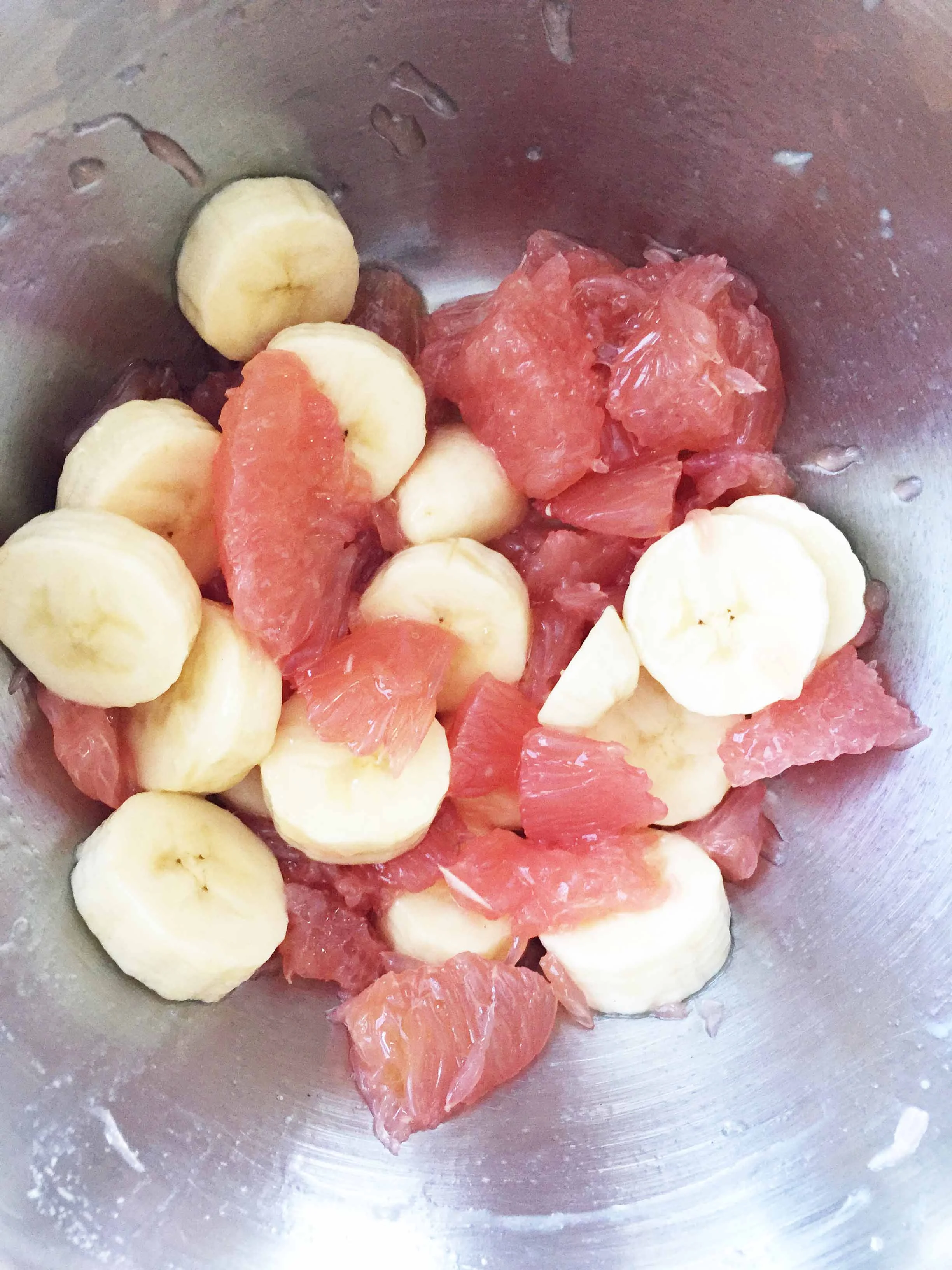 I used the juices of the grapefruit along with some local honey to make a sort of faux fruit cocktail to go atop one into my breakfast bowl. A 'not quite ripe' banana will work best here.