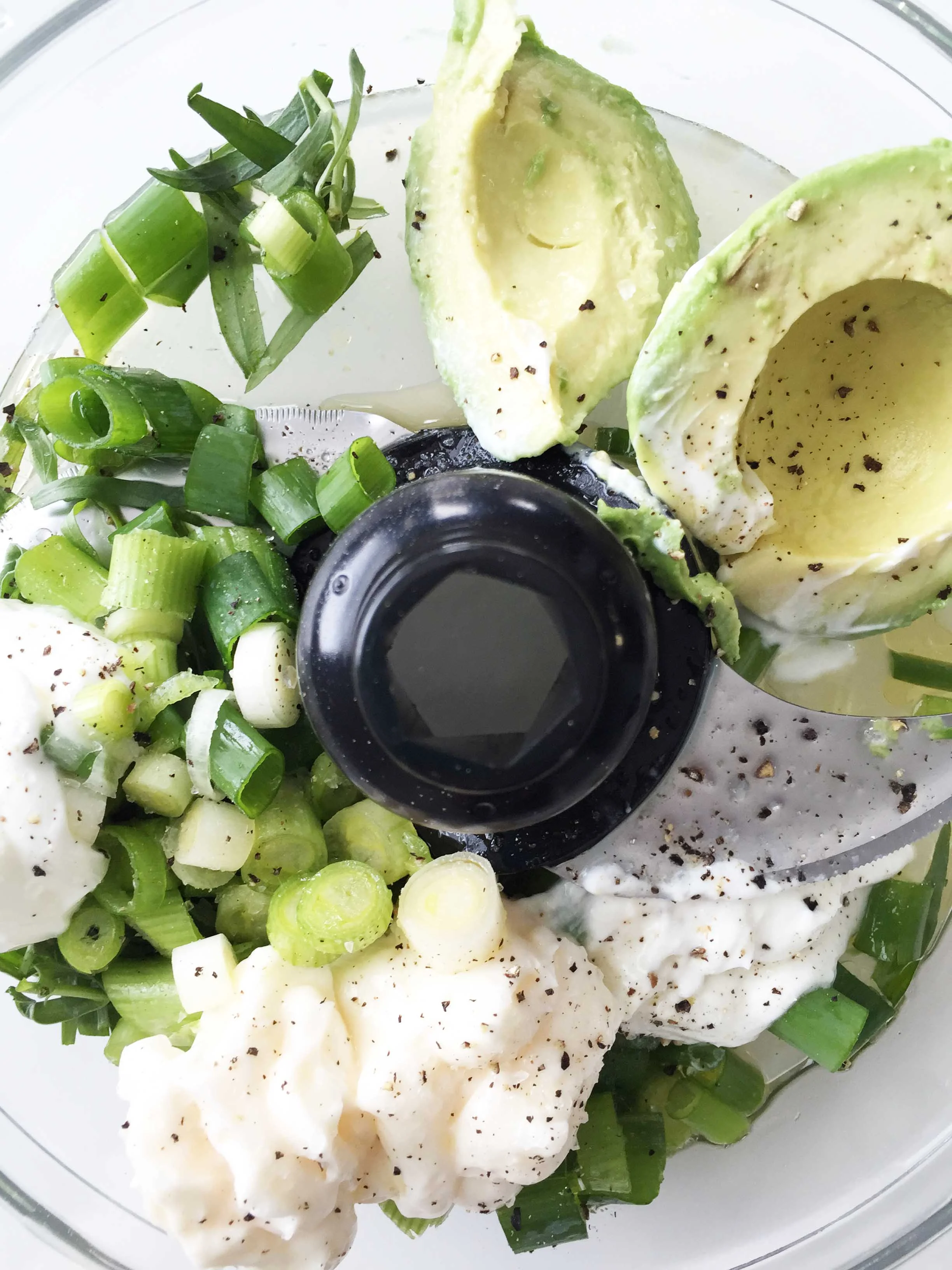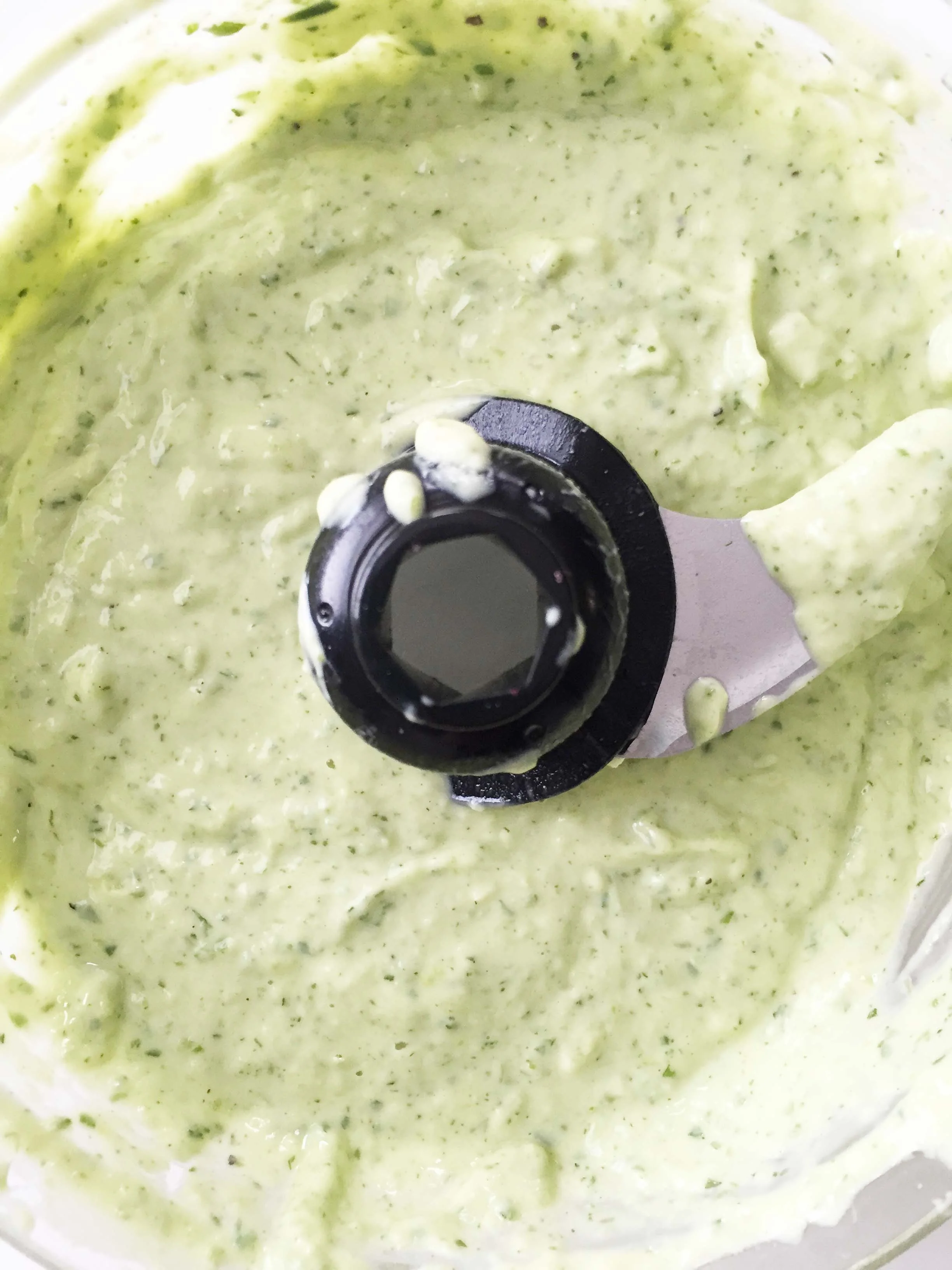 While the oven is heating up, combine the ingredients for the green goddess sauce into a blender or food processor and blend until smooth.