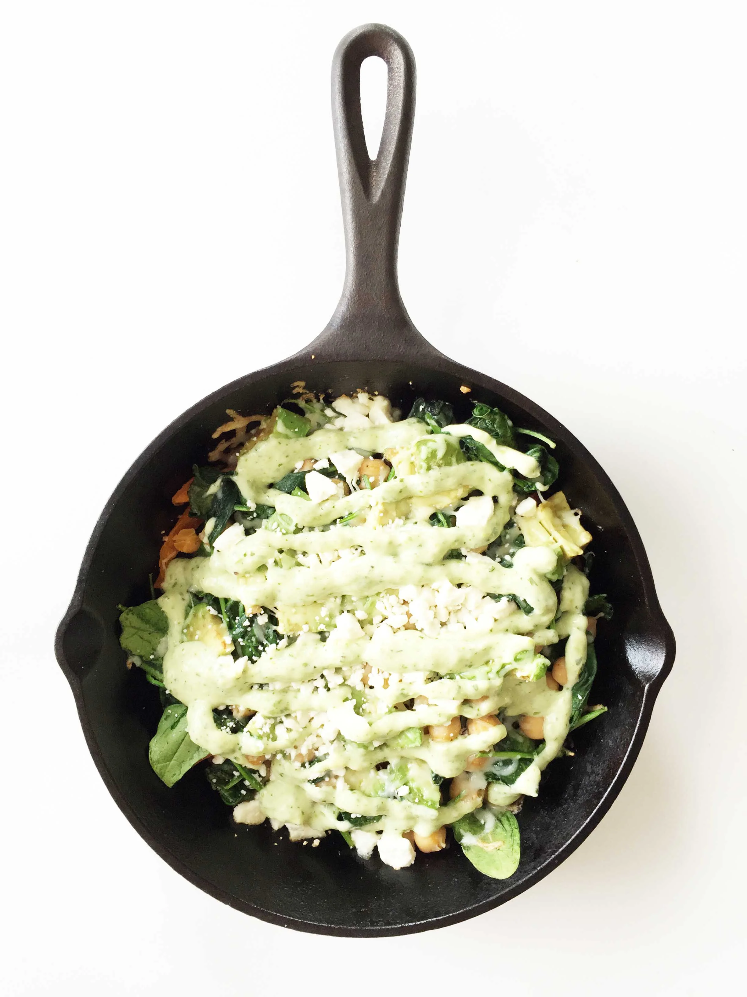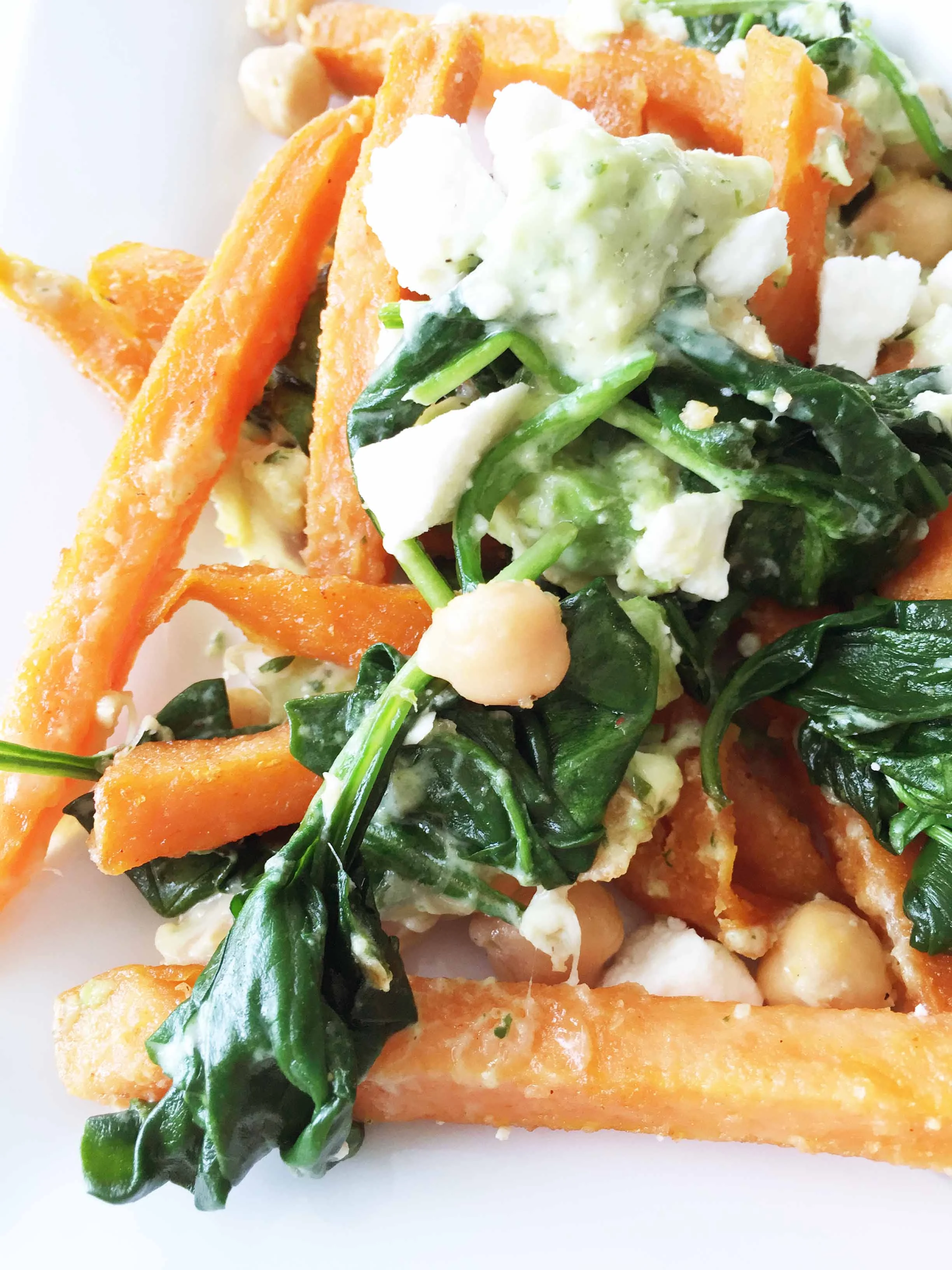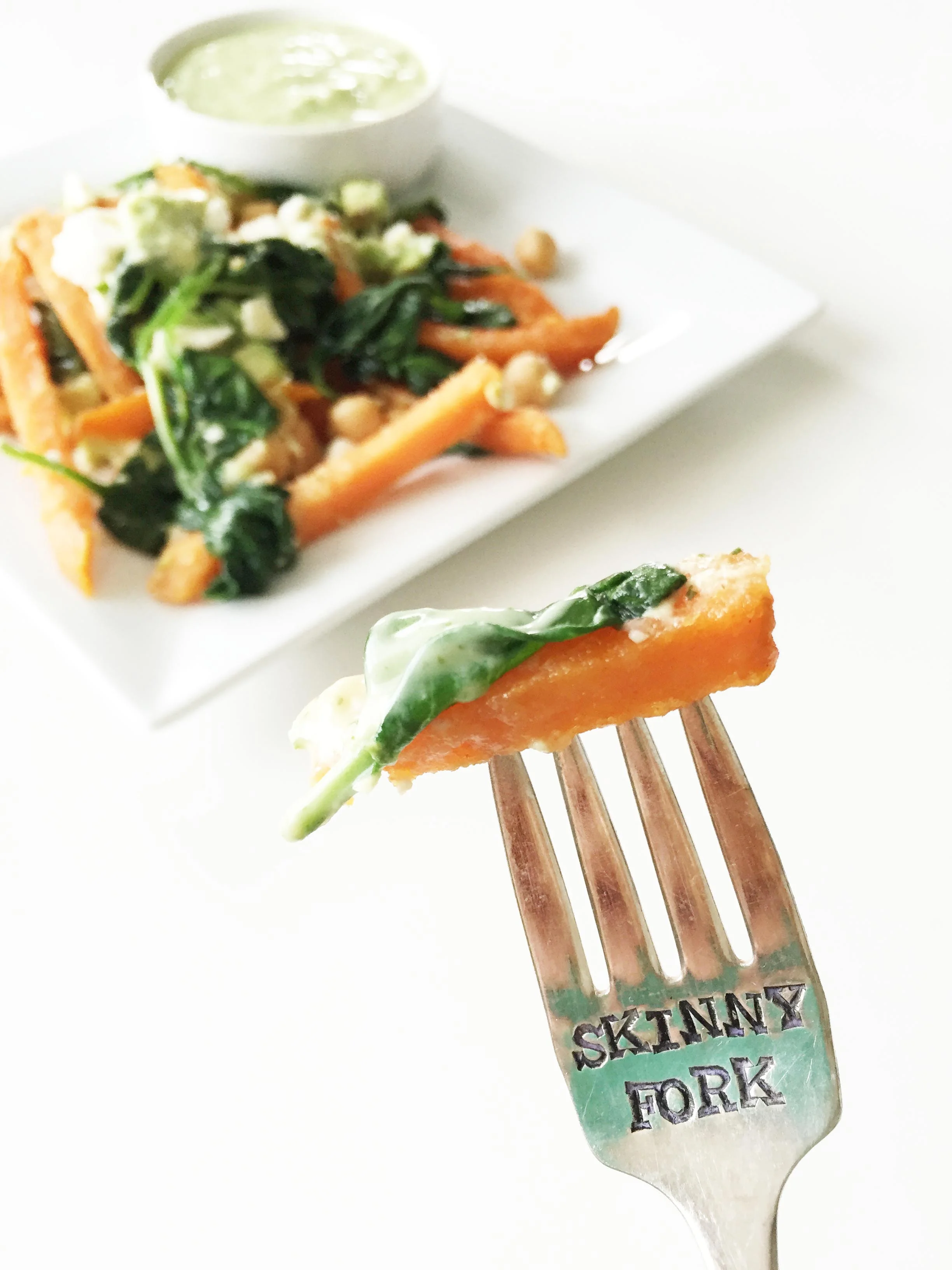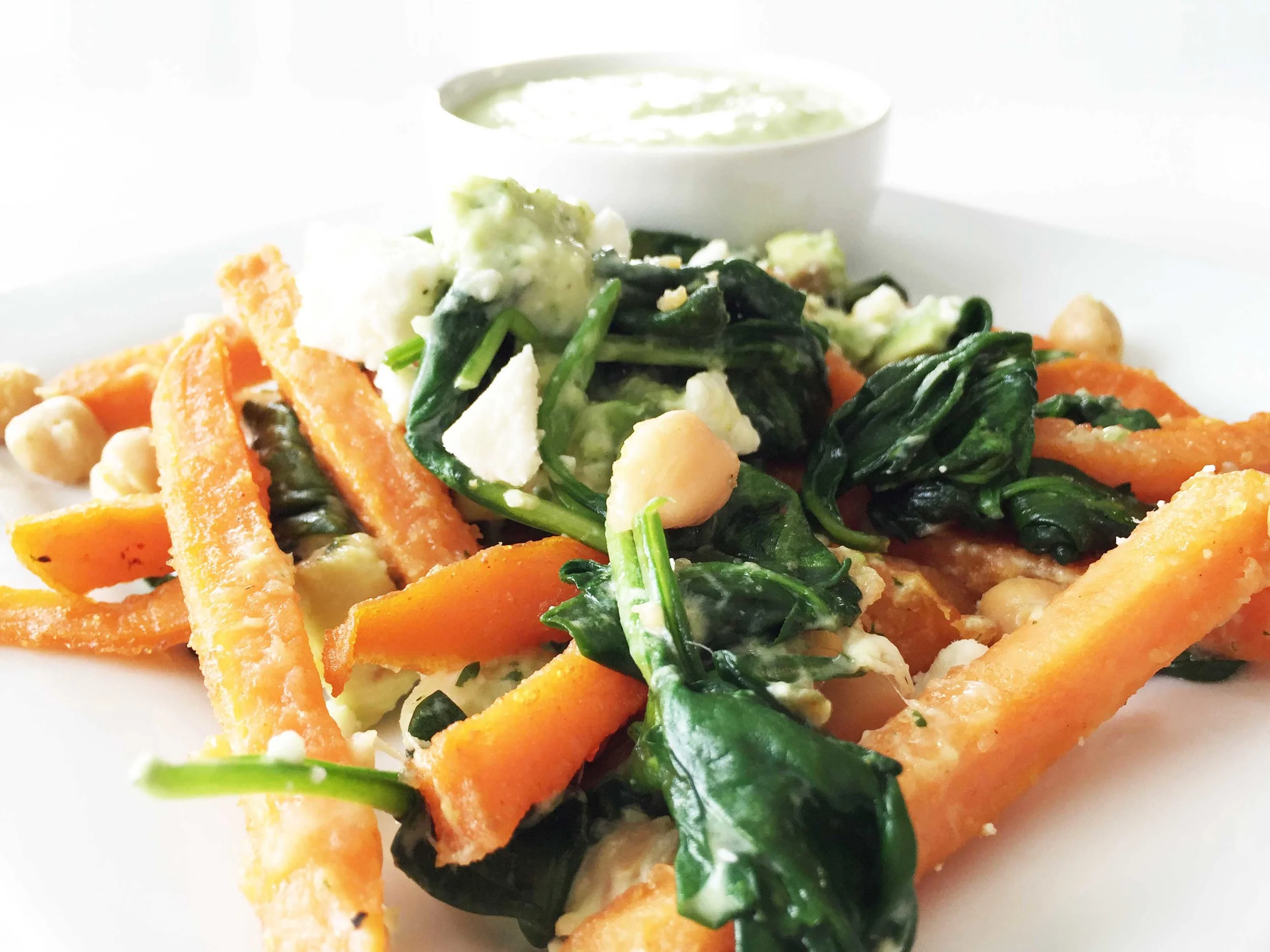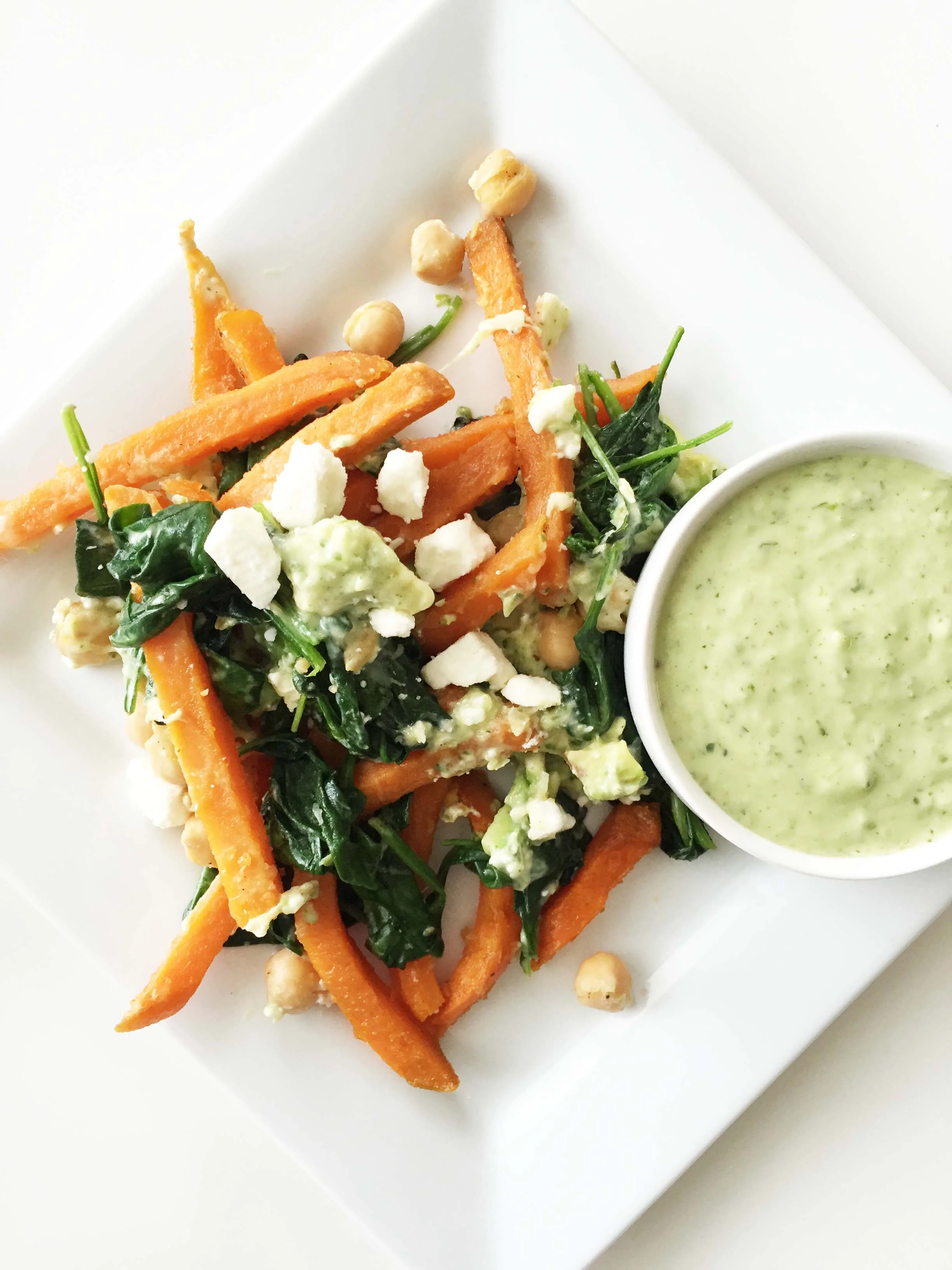 My inspiration for this dish started with a stuffed sweet potato that I made a few weeks back. I had loaded a baked sweet potato up with sautéed spinach, black beans, and some homemade green goddess dressing. It was definitely not your typical baked potato, and was amazingly delicious. So, when I was deciding what to do with my Alexia Sweet Potato Fries, I had the perfect direction to start heading in.