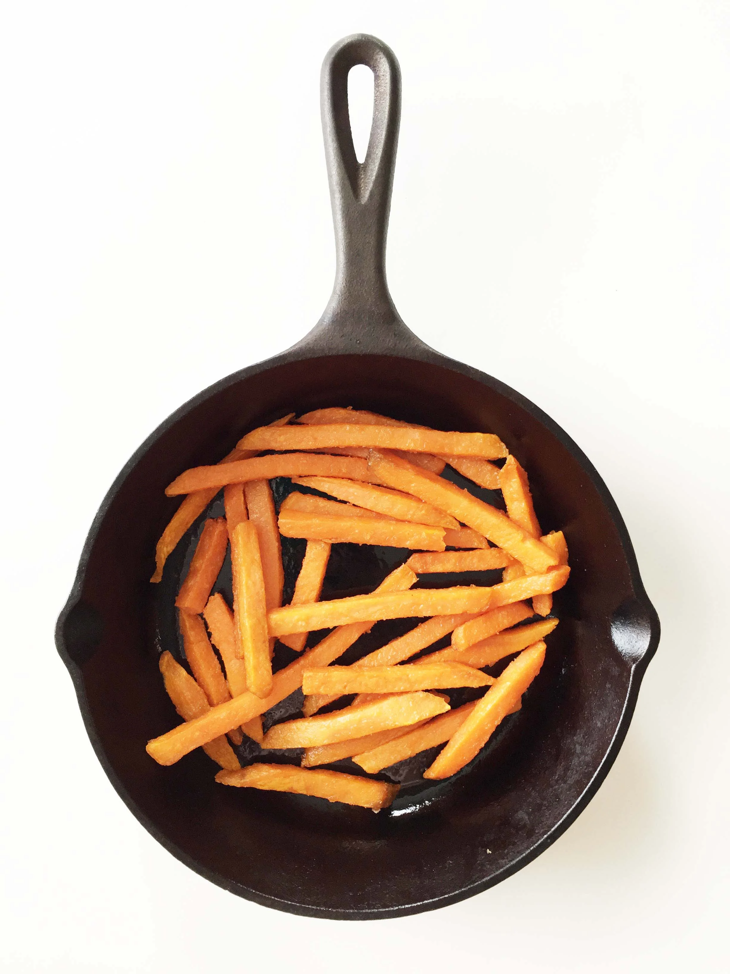 Place the fries onto the prepared baking sheet or skillet and place in the oven to bake for 10-12 minutes or until starting to brown and crisp.