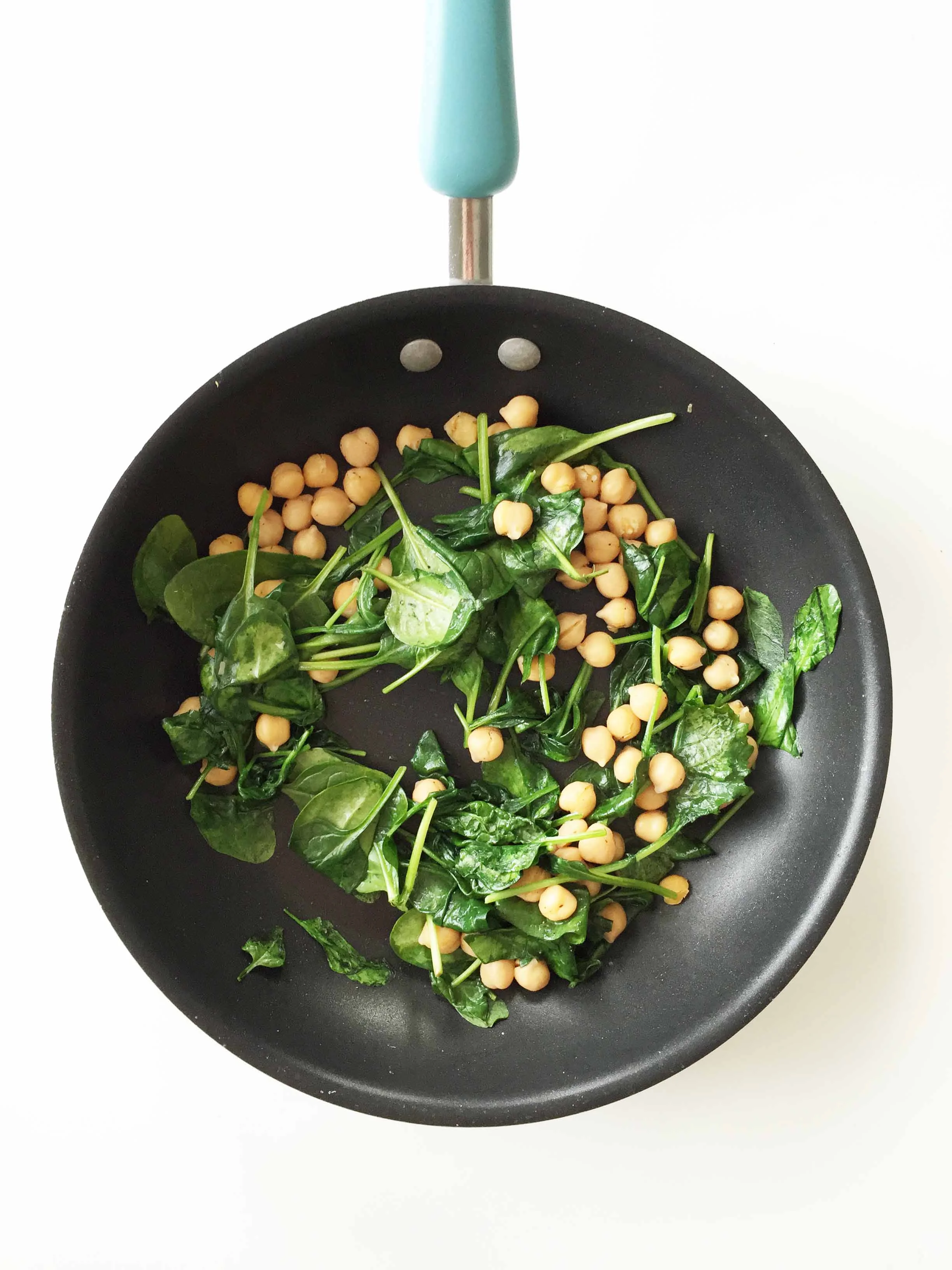 While the fries are baking, place the spinach and chickpeas into a large skillet and sauté just until the spinach has wilted and the garbanzo beans are warm.