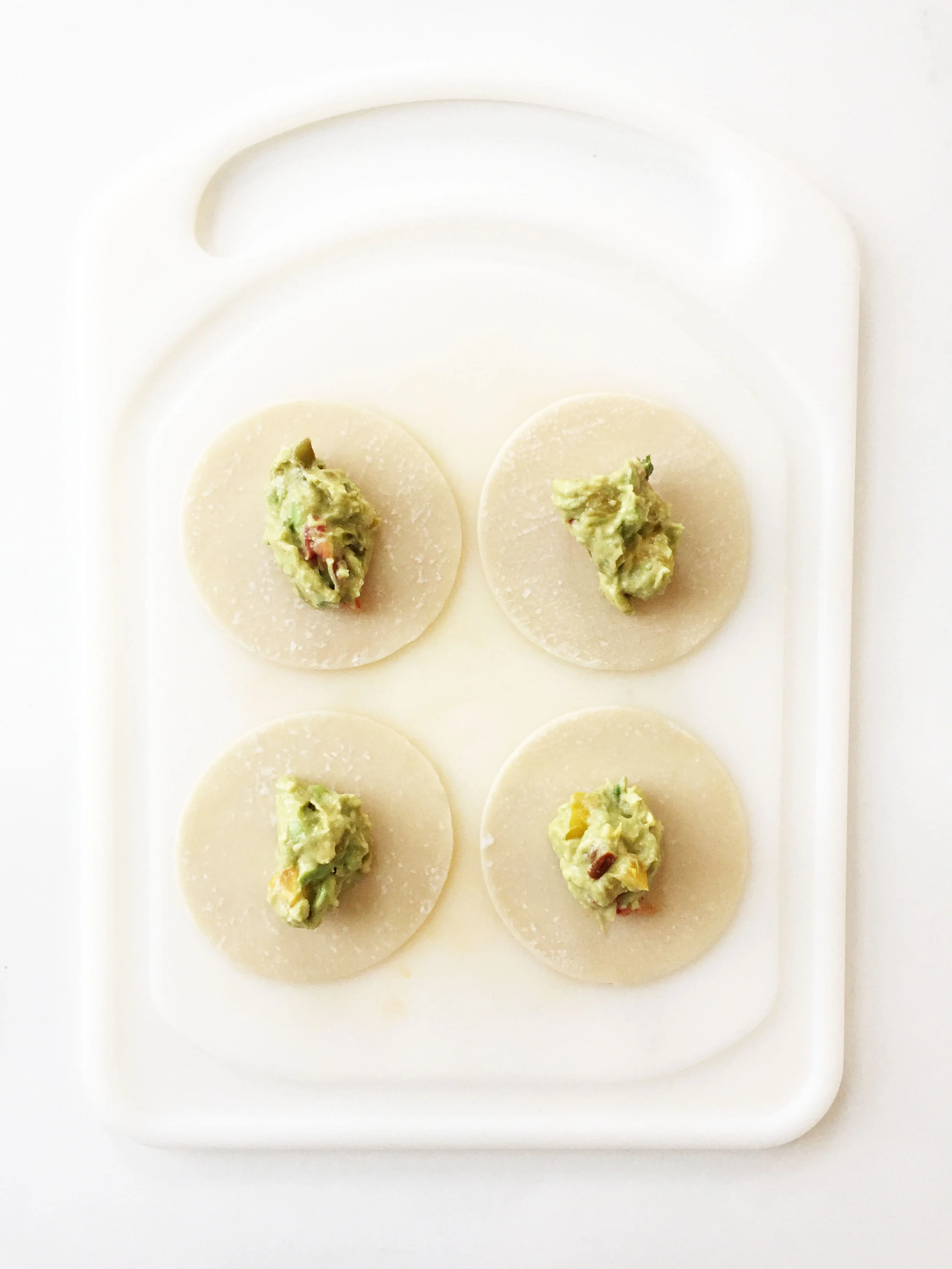 Lay out your wonton wrappers and fill with about 1 Tbsp. of the guacamole.