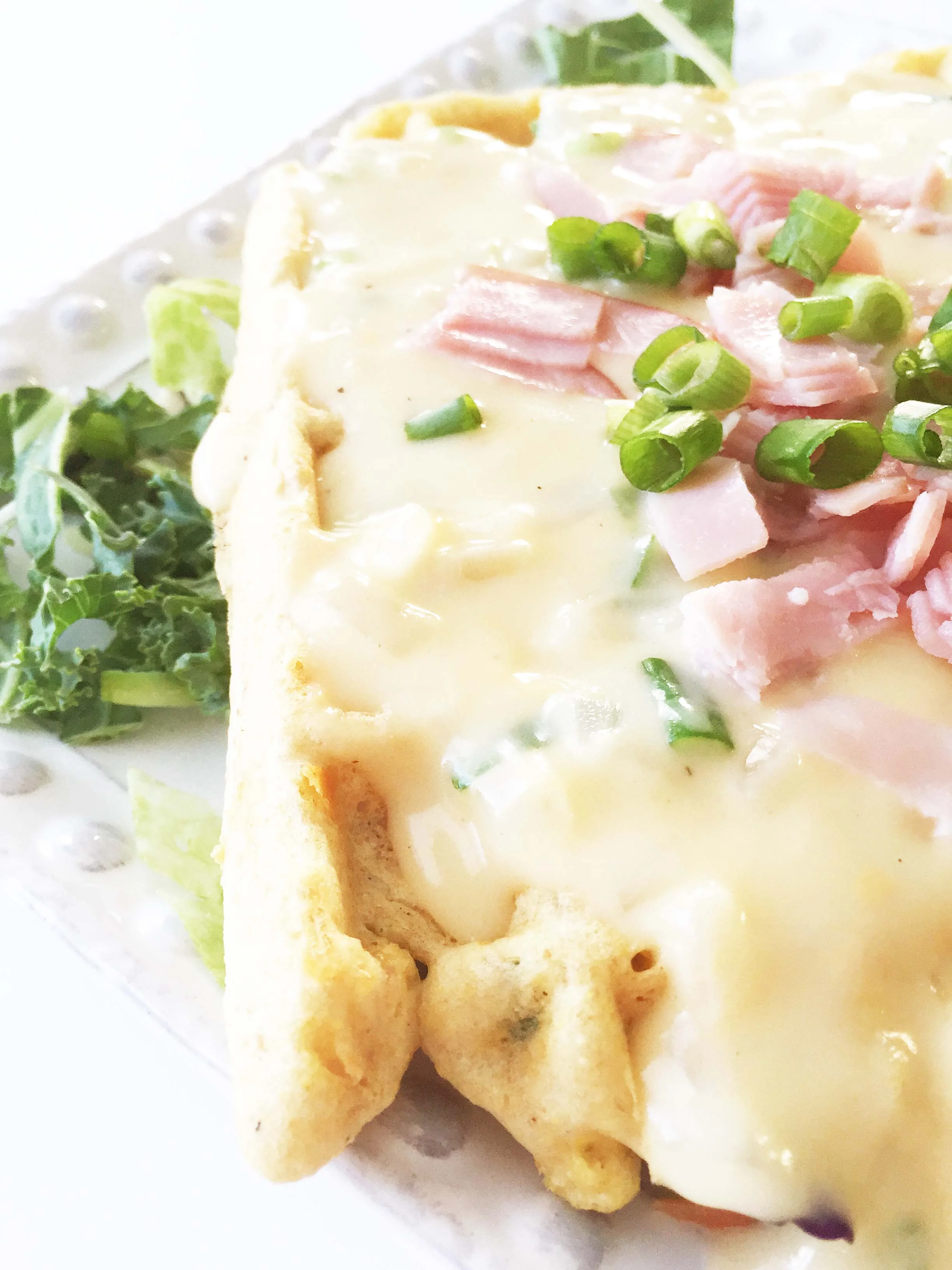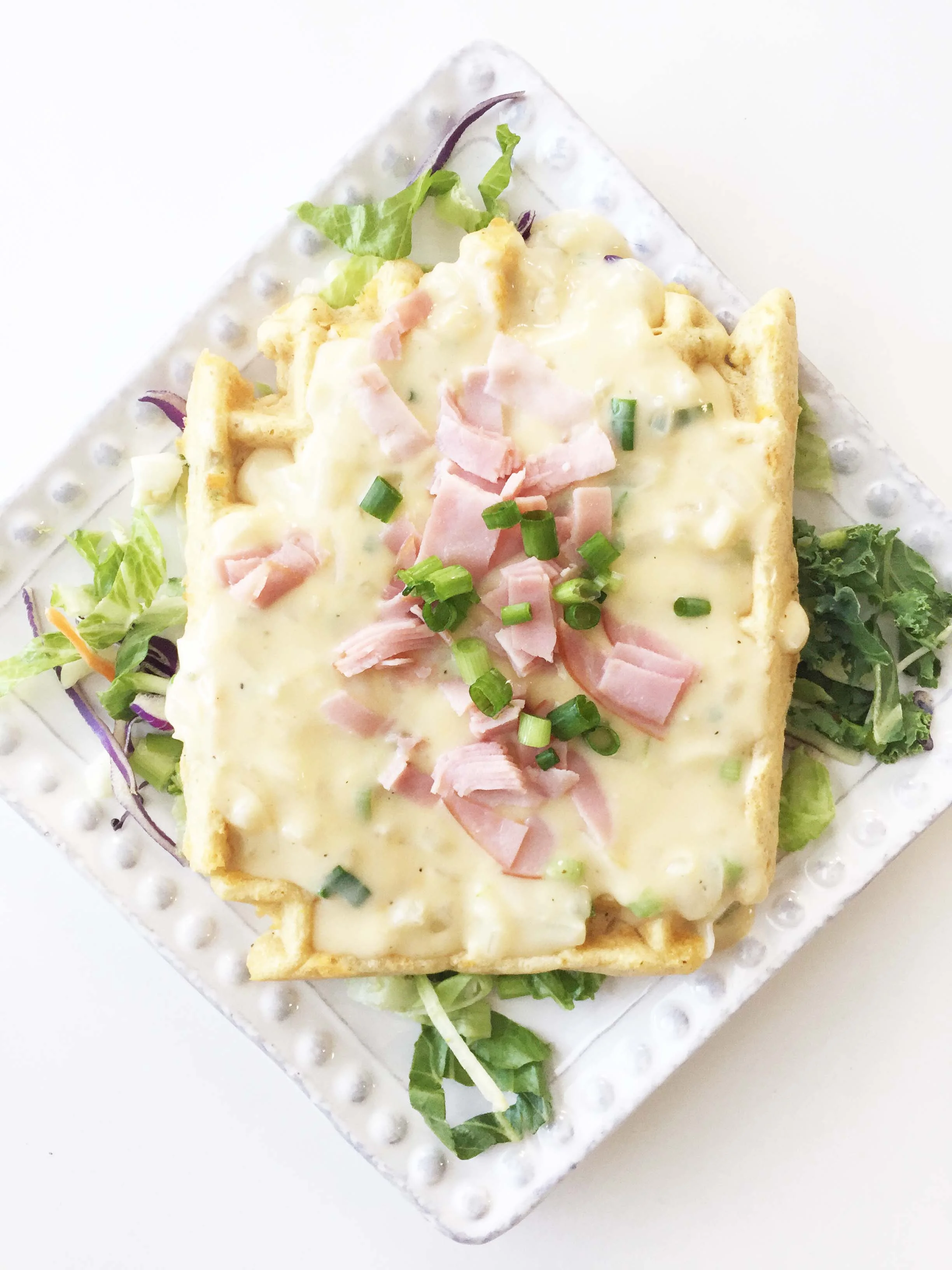 Savory waffles are all the rage right now. They certainly are not just for breakfast anymore. I can remember back in my school age days that my parents would, on occasion, do a 'breakfast for dinner' night in our house, so this is somewhat an ode to that memory.