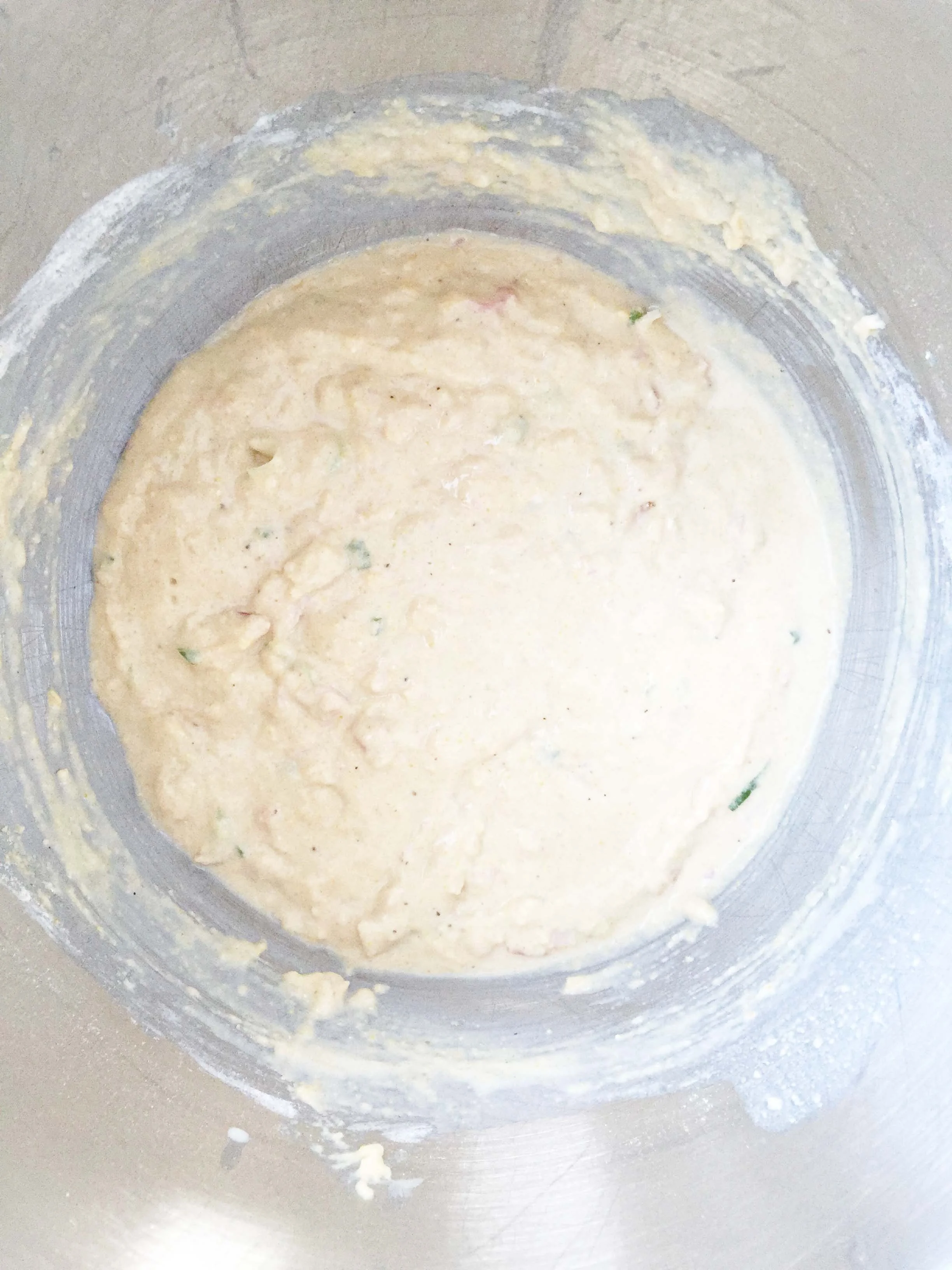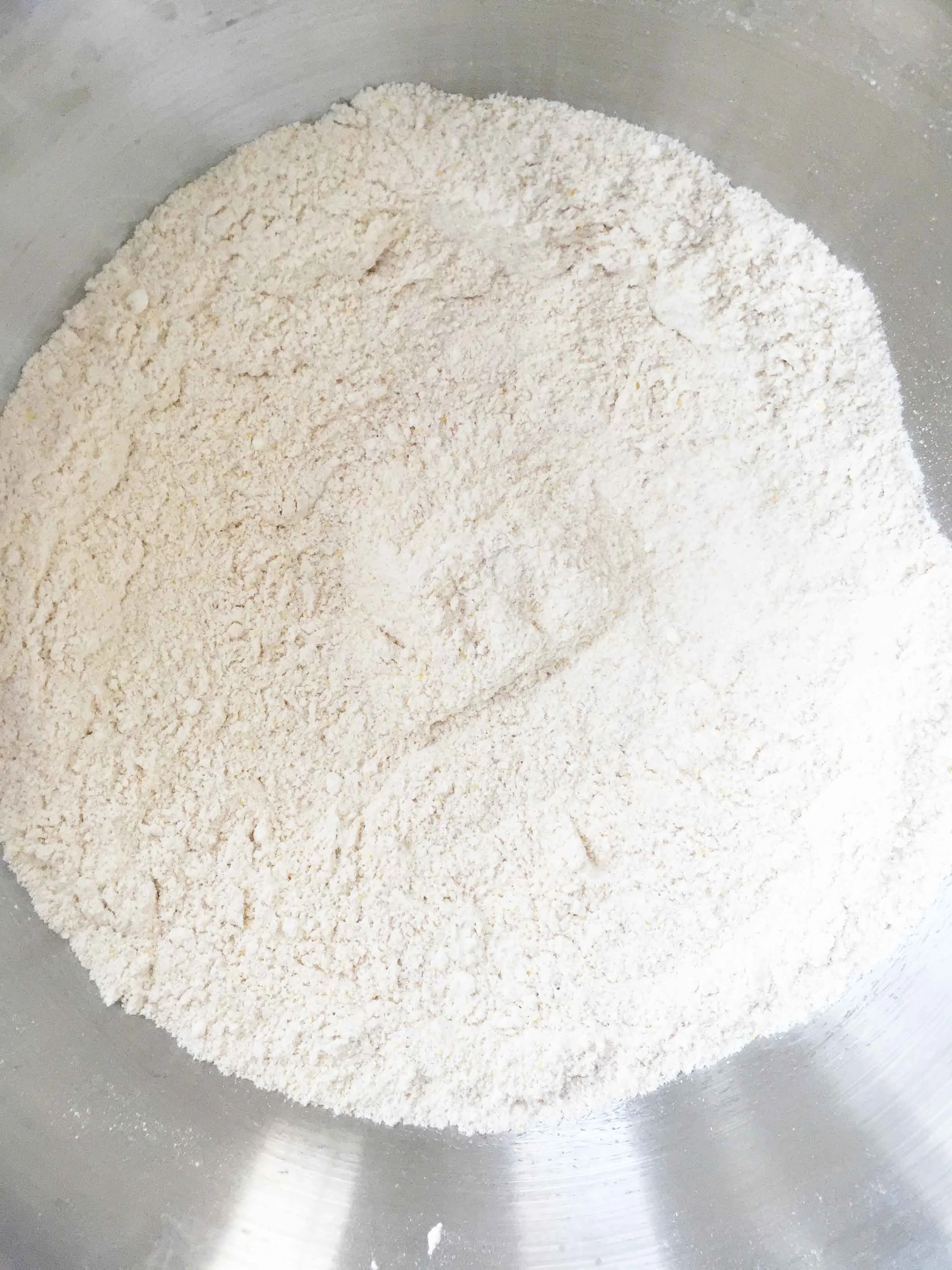 Whisk together your dry ingredients, flours, cornmeal, baking powder, sugar, baking soda; season to taste and set aside.