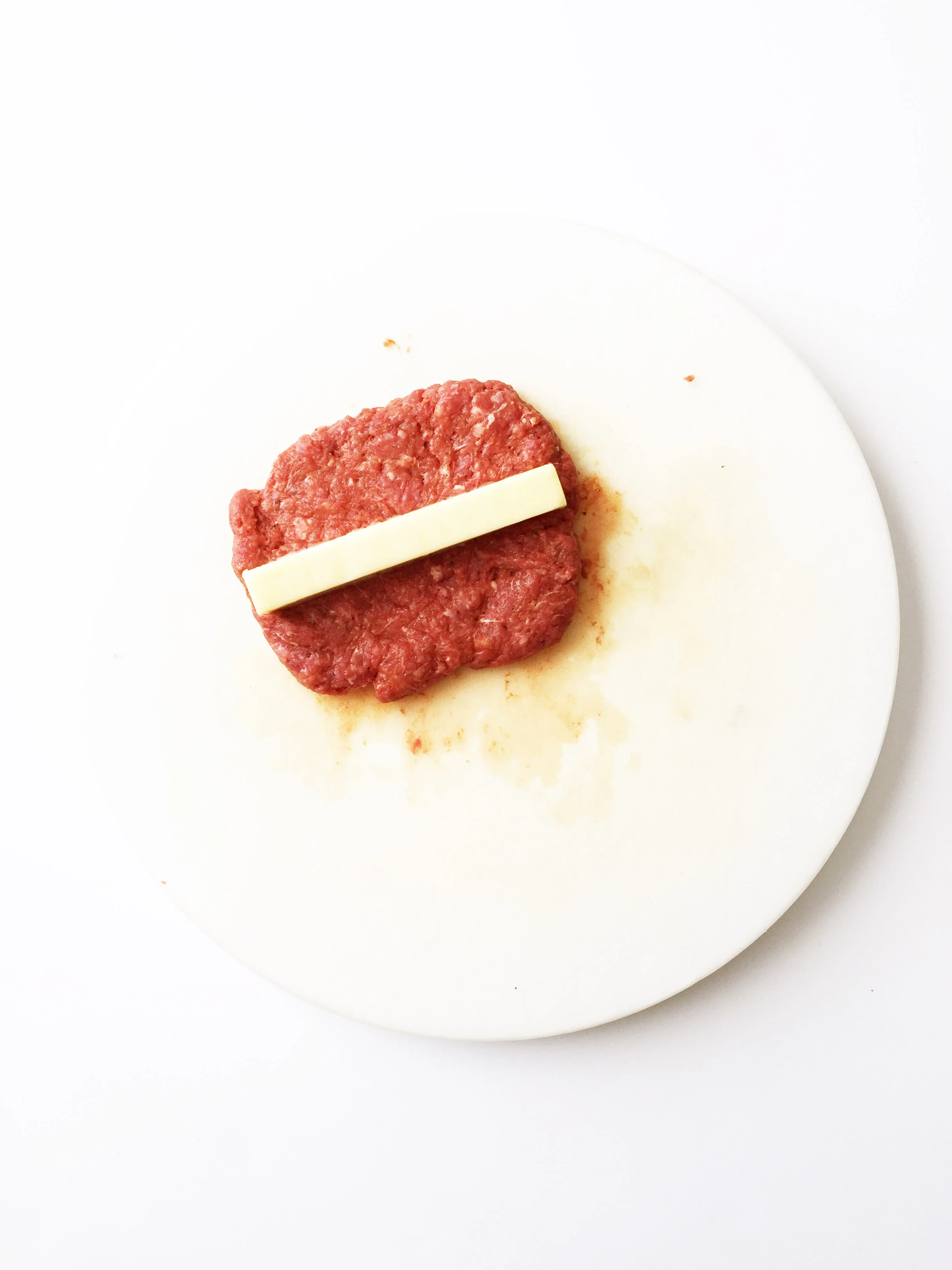Shape the meat into a rectangle and place one cheese stick into the middle of each.