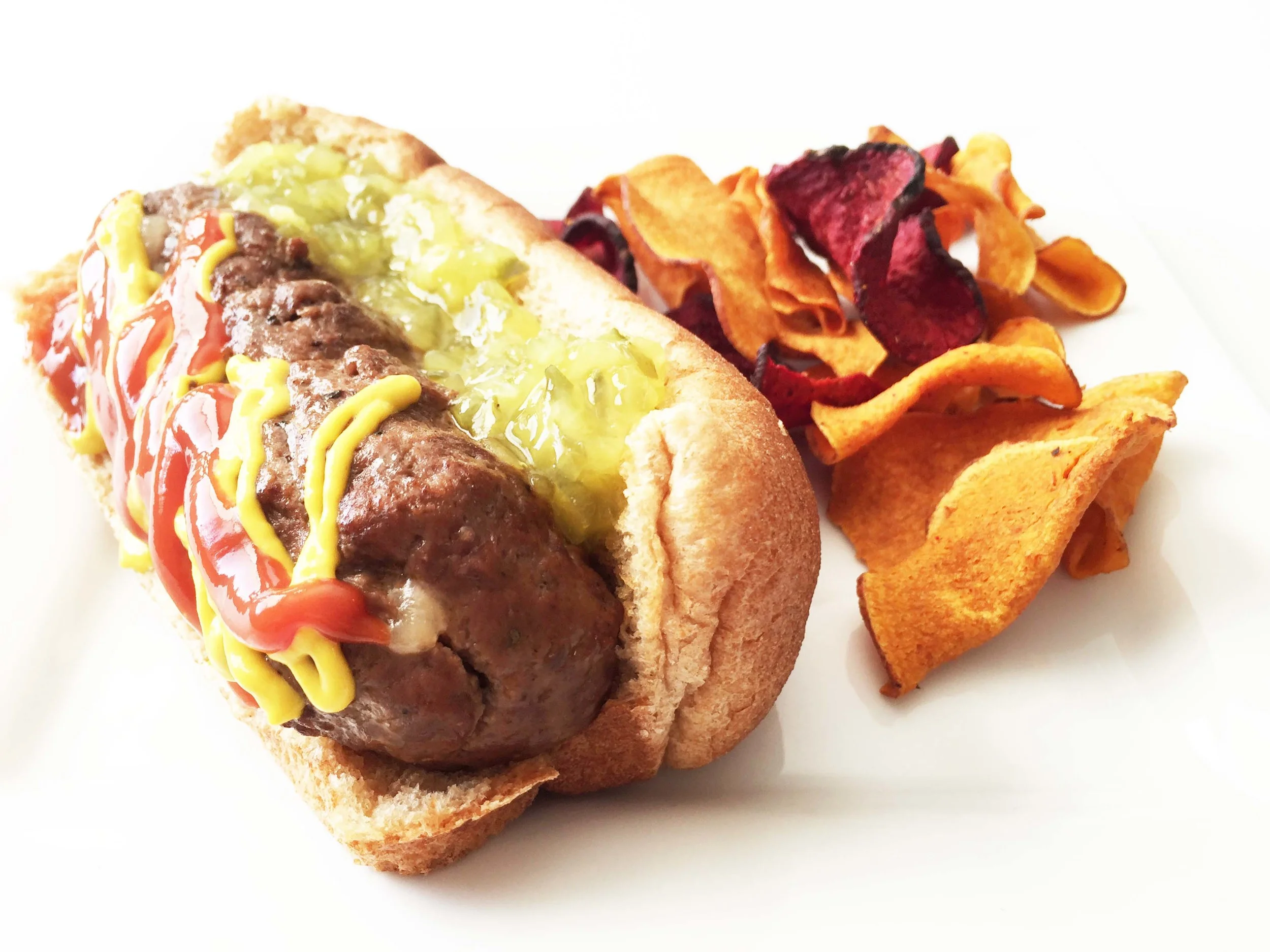 I had to load my burgerdog up with all the traditional toppings, dill relish, yellow mustard and sugar-free ketchup. To keep it original and better-for-you still, I used a whole wheat bun and served the burgerdog with sweet potato and red beet chips.
