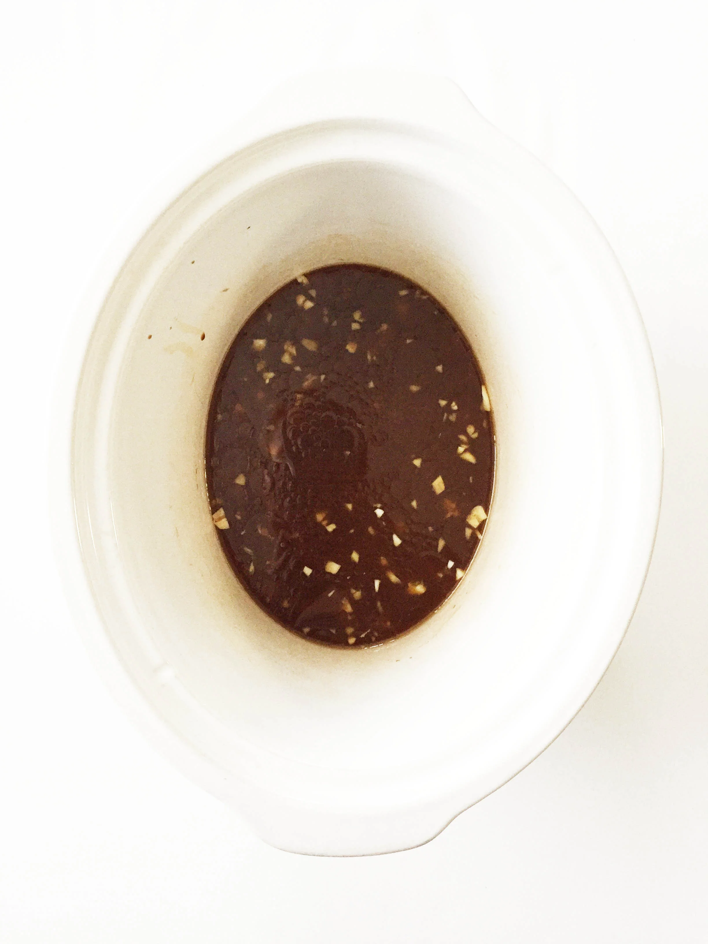 Place beef, broth, soy sauce, brown sugar, ginger, sesame oil, and garlic into the slow cooker. Give everything a good stir.