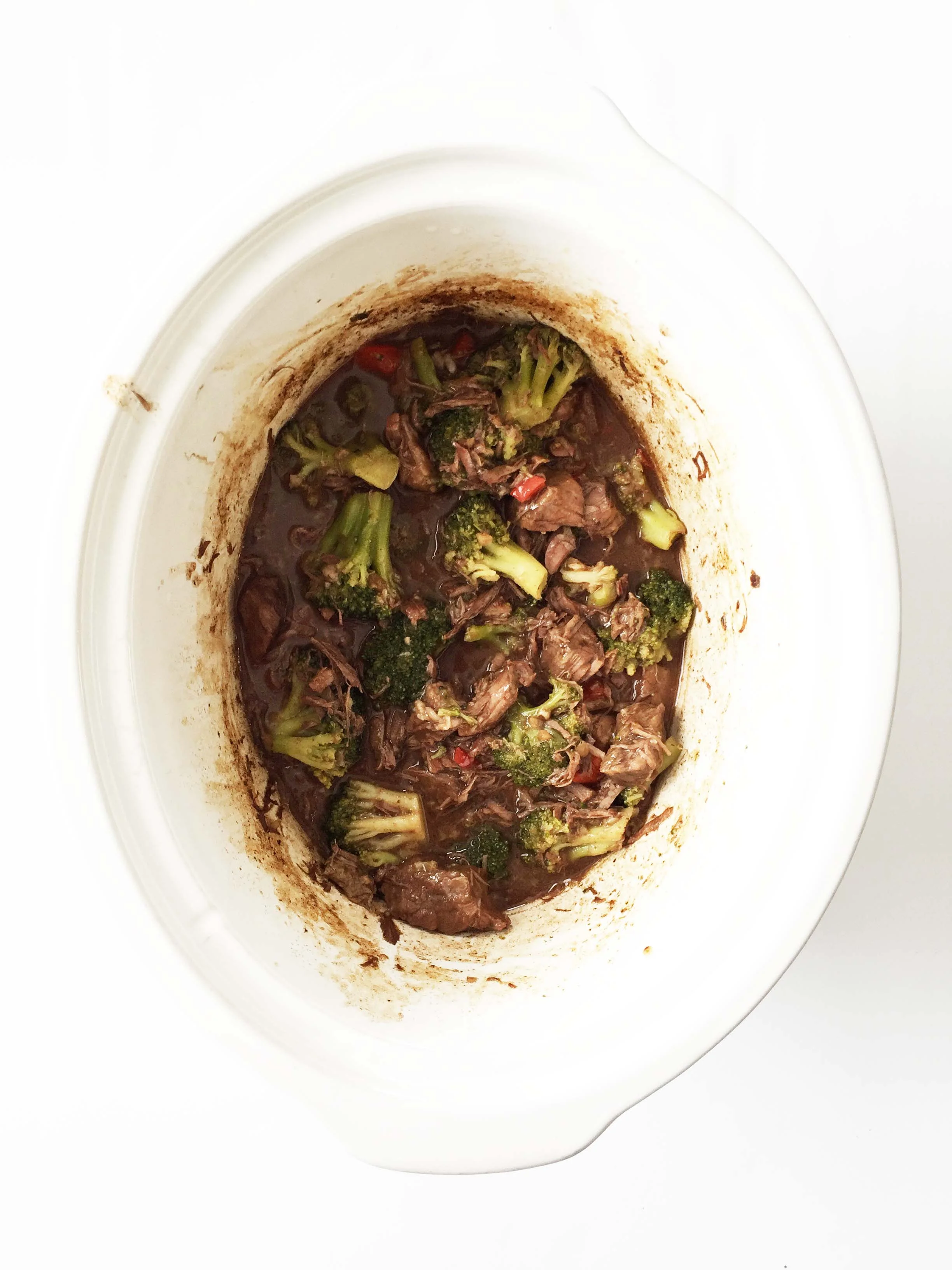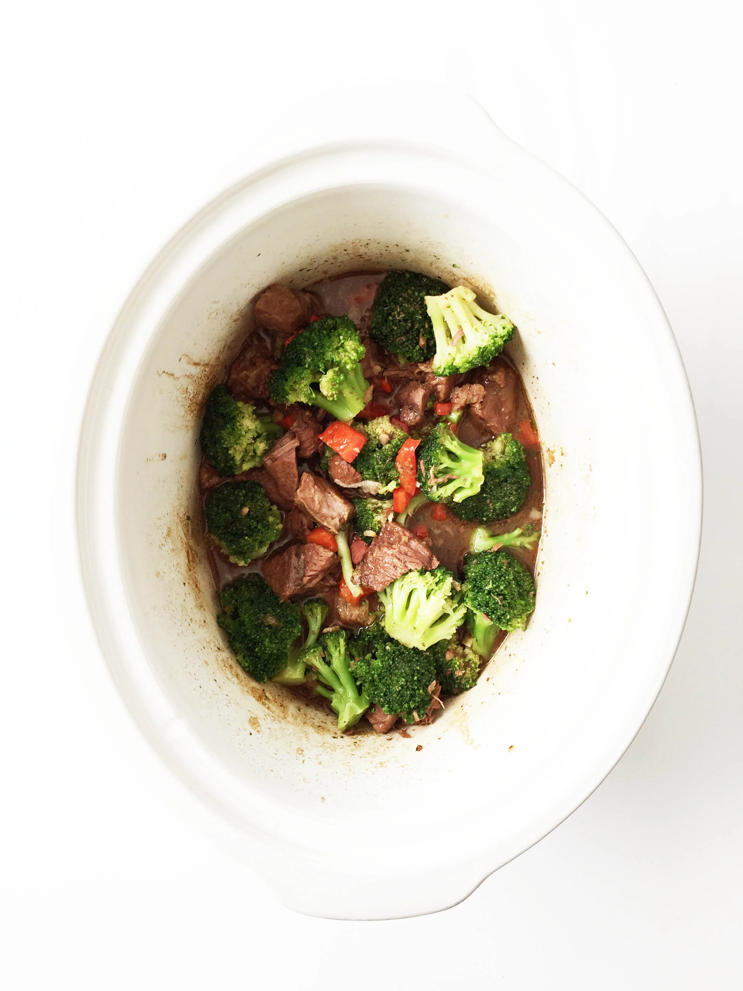 Add the slurry, the broccoli and the red bell peppers to the crock pot. Give another good stir and allow to cook for an additional 30 minutes.