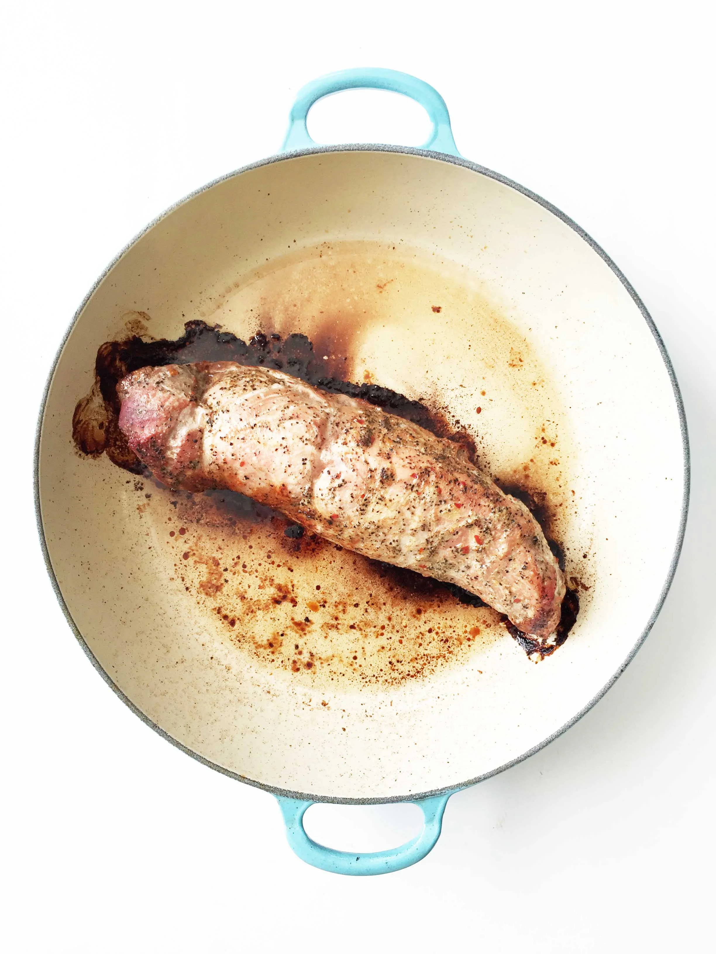 Remove your preheated pan from the oven and add 1 tablespoon of olive oil, swirling the olive oil to coat the pan; carefully add the pork and place the dish in the oven.