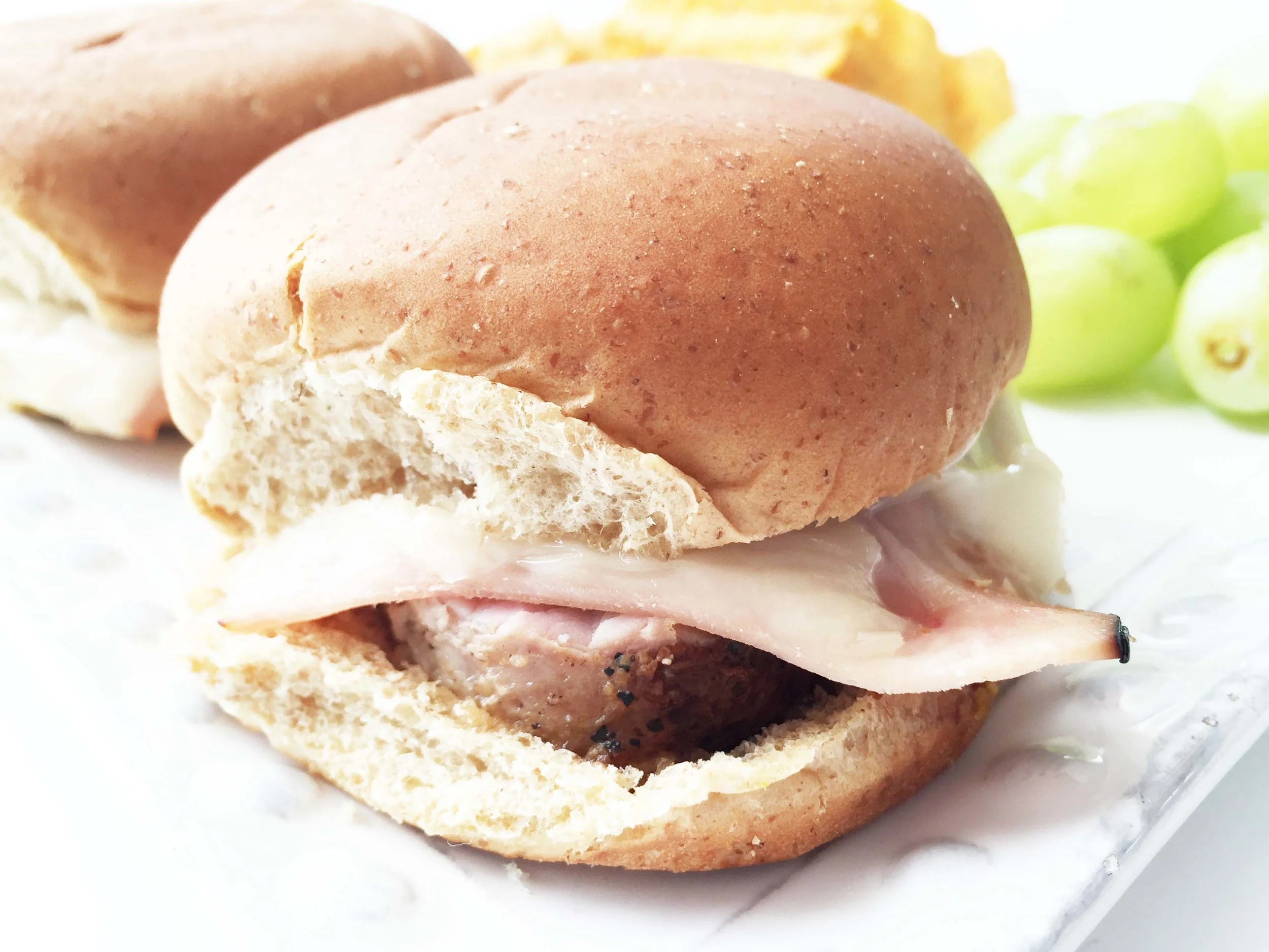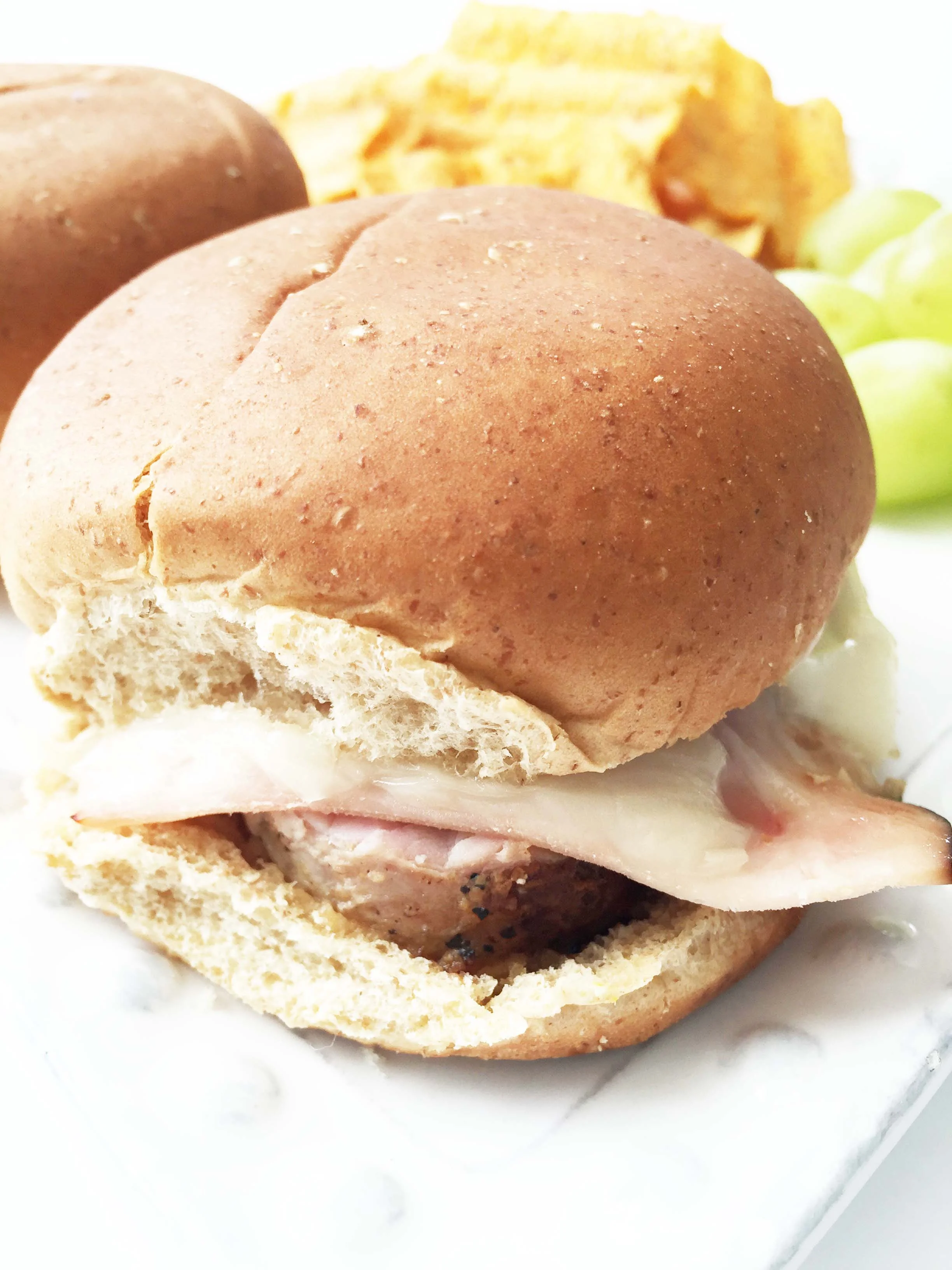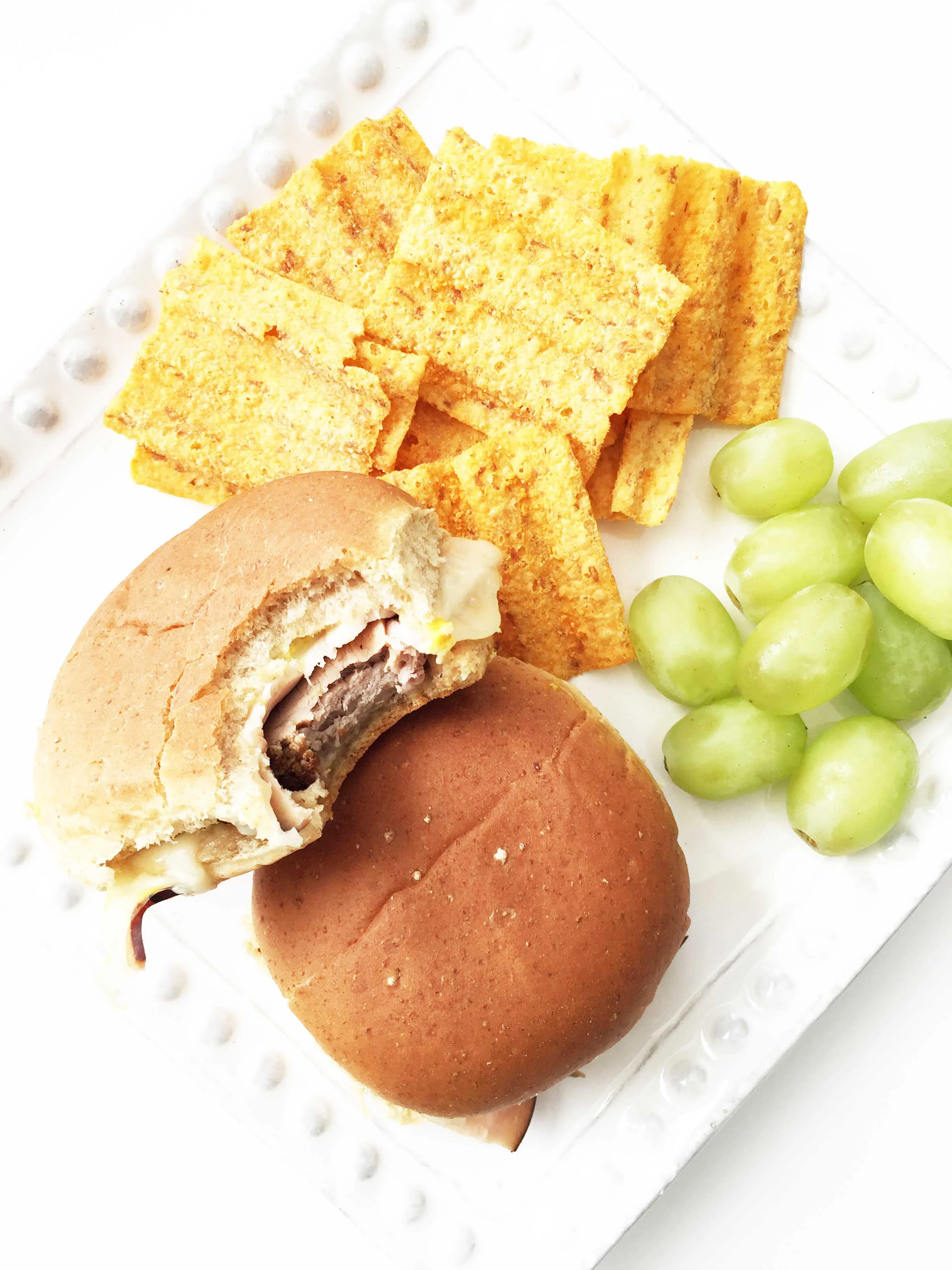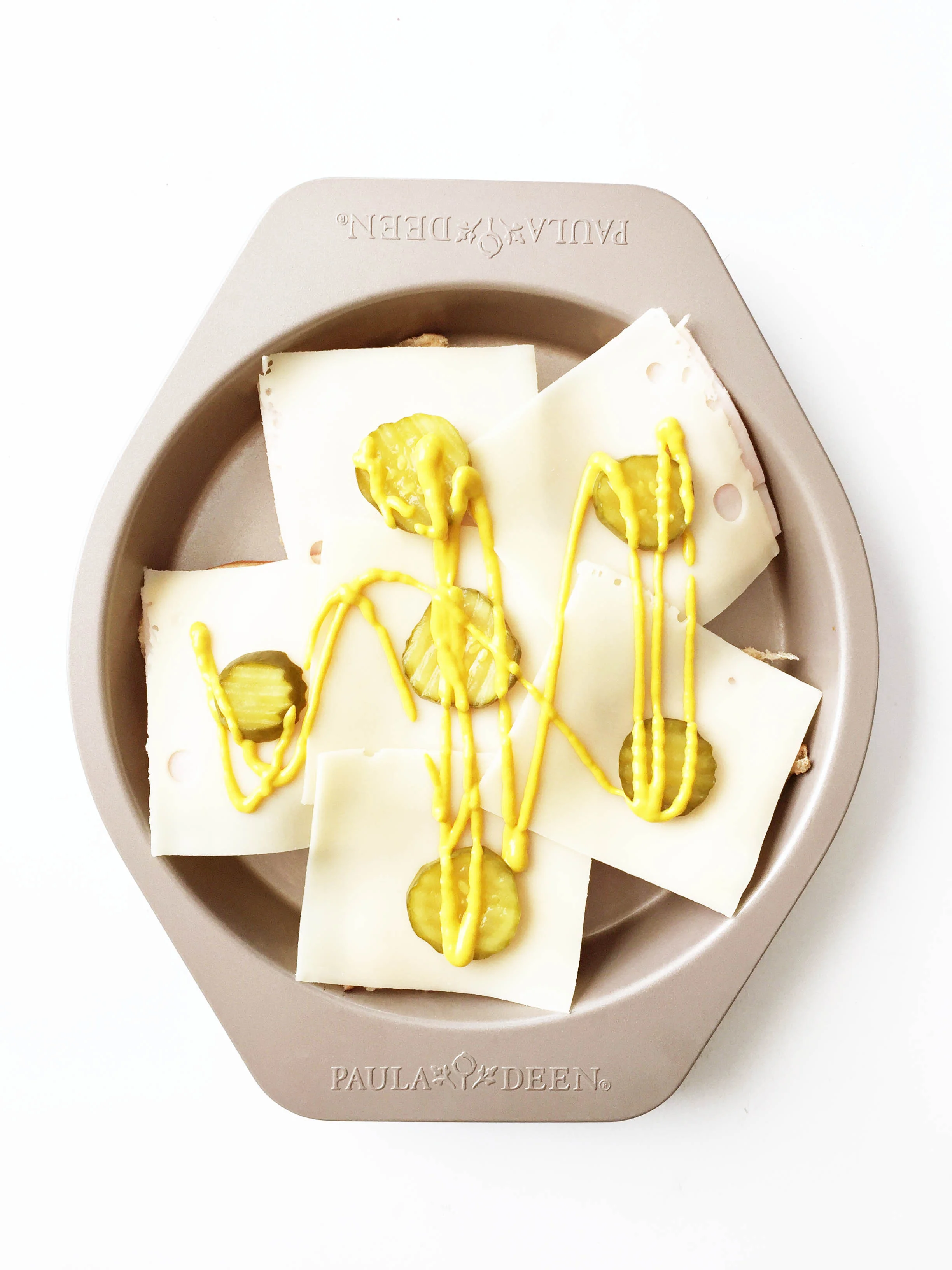 For the rest of the slider I used a low sodium thin sliced deli turkey instead of the original ham, and topped it all off with some reduced fat swiss cheese, pickle chips, and yellow mustard!