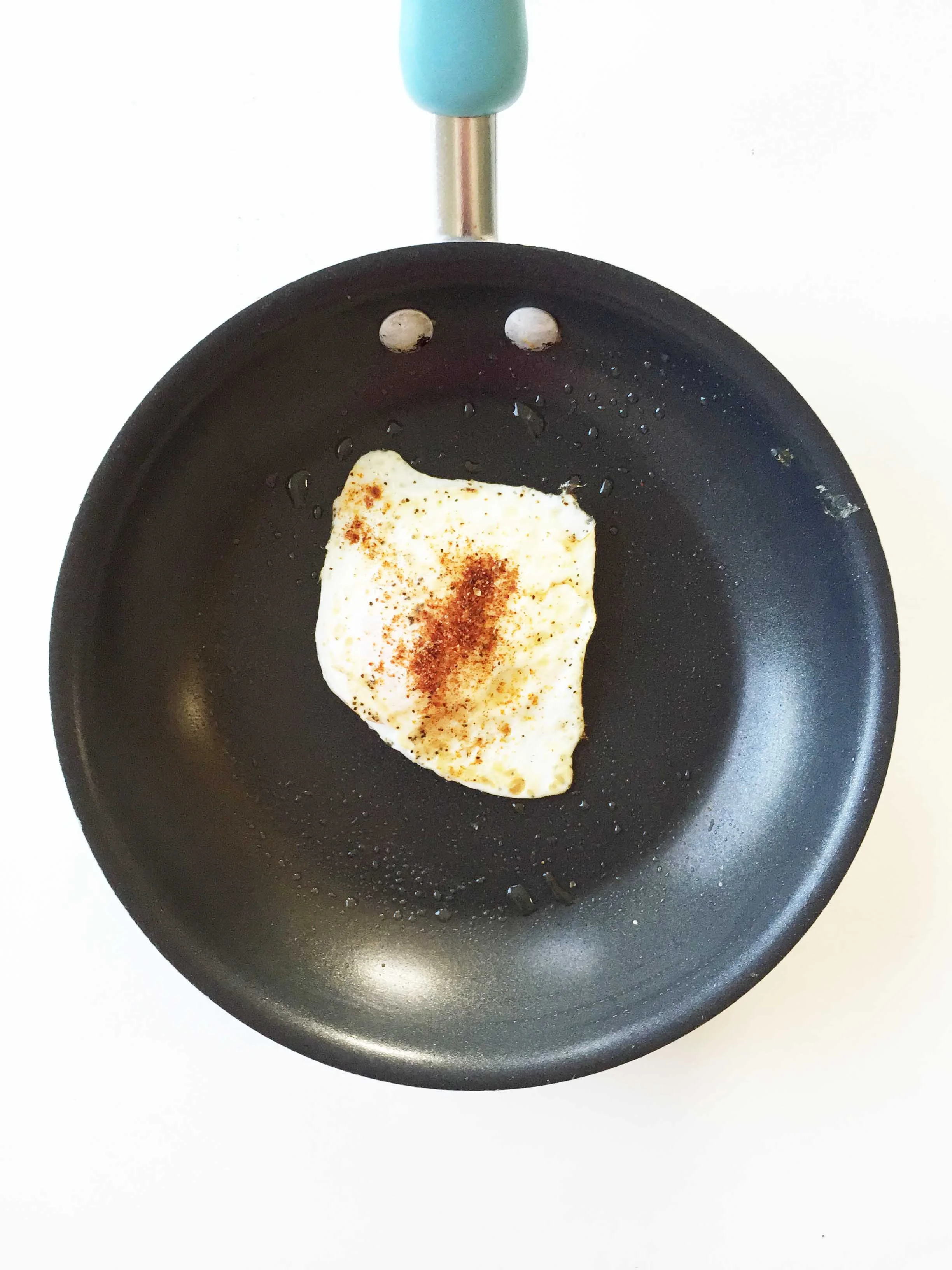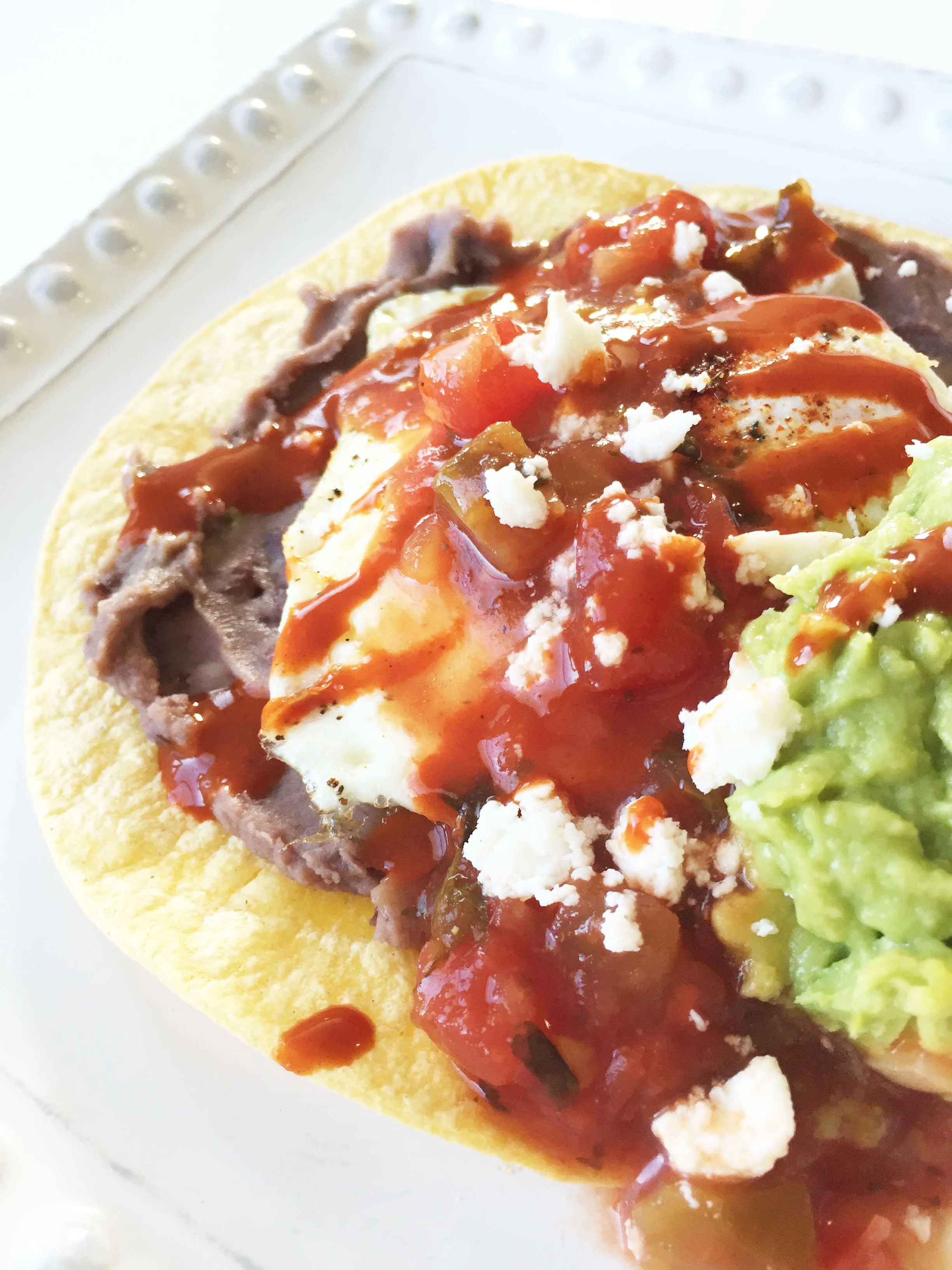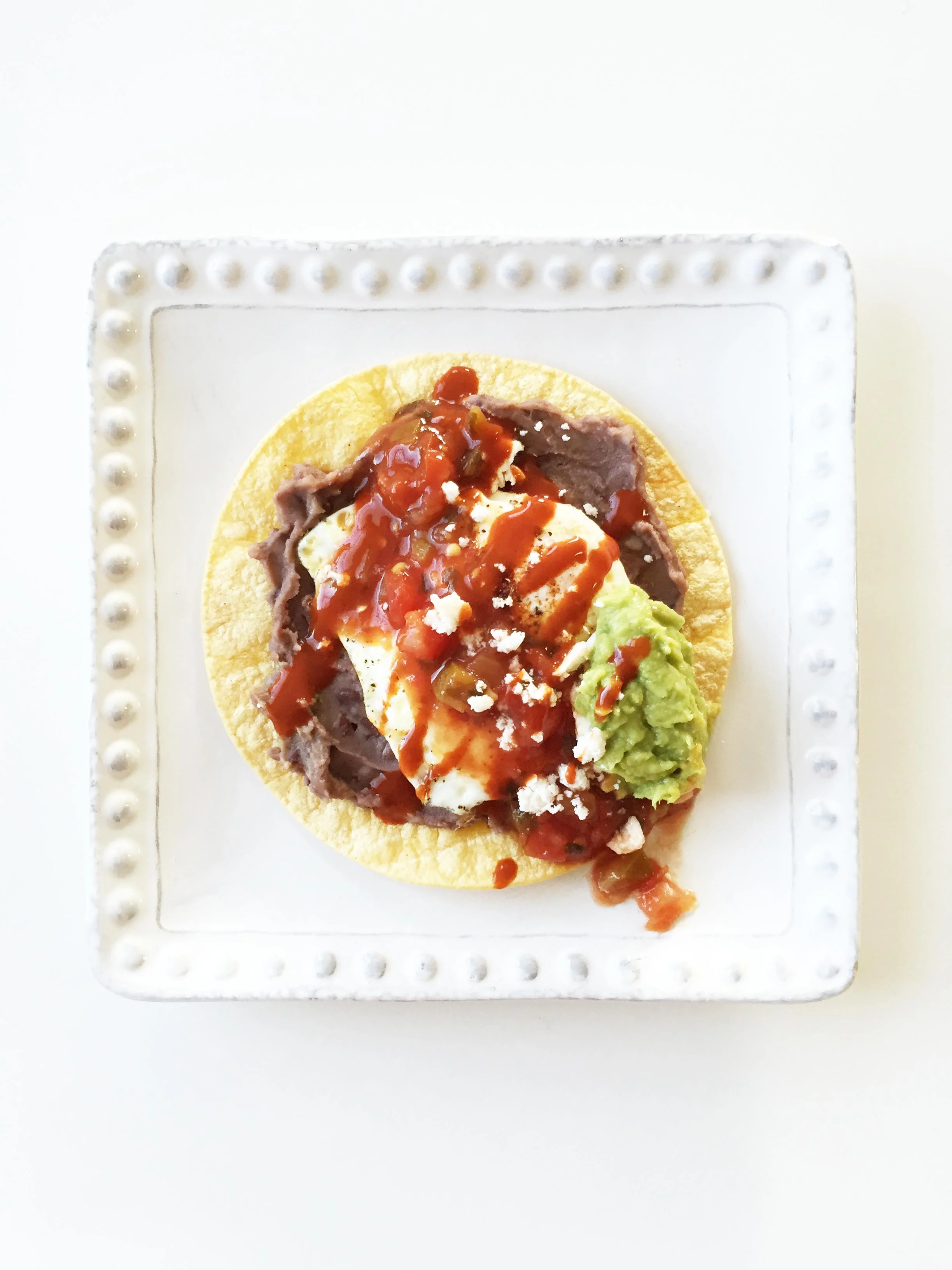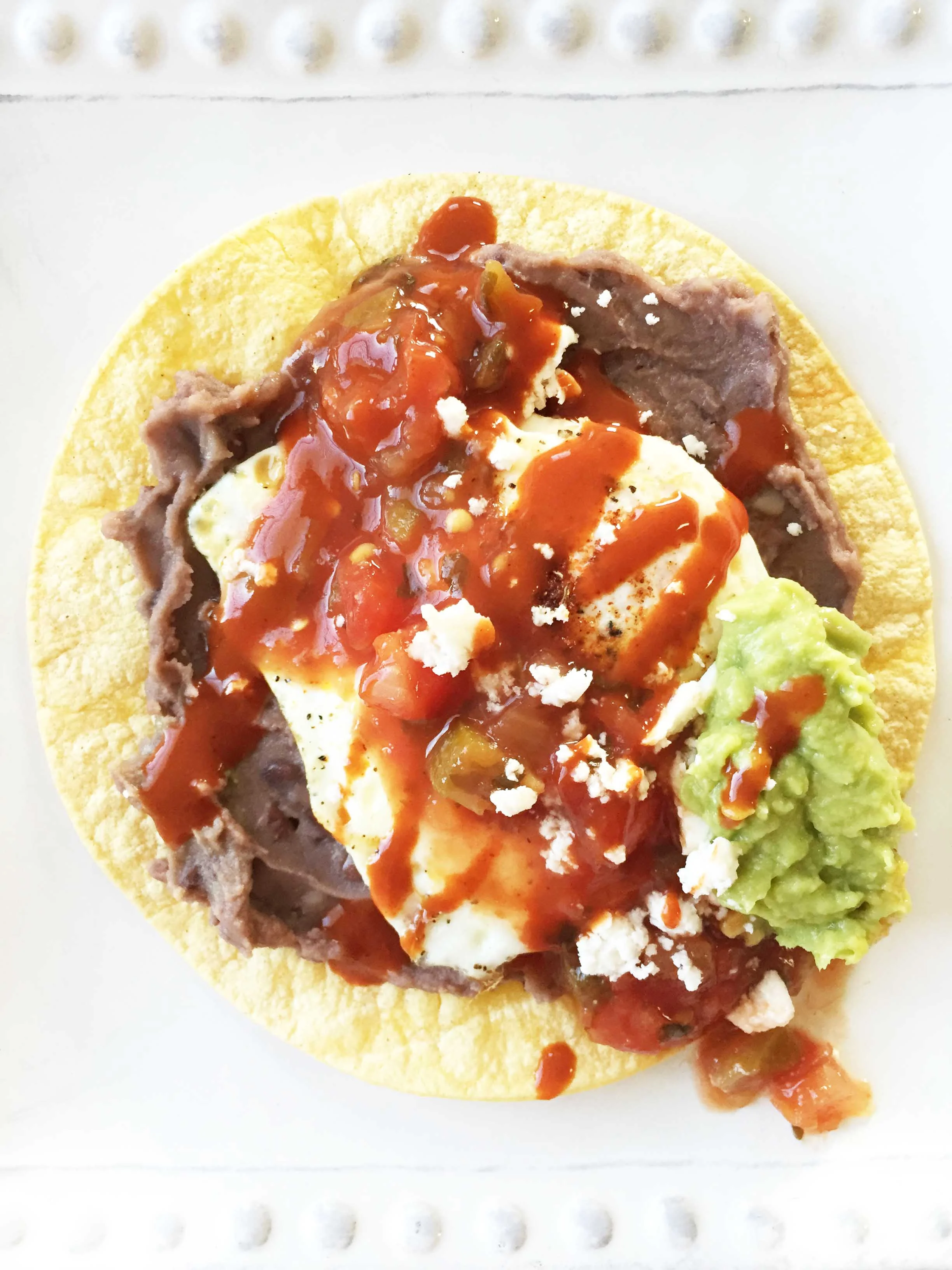 Top the tortilla with the beans and one of the cooked eggs.