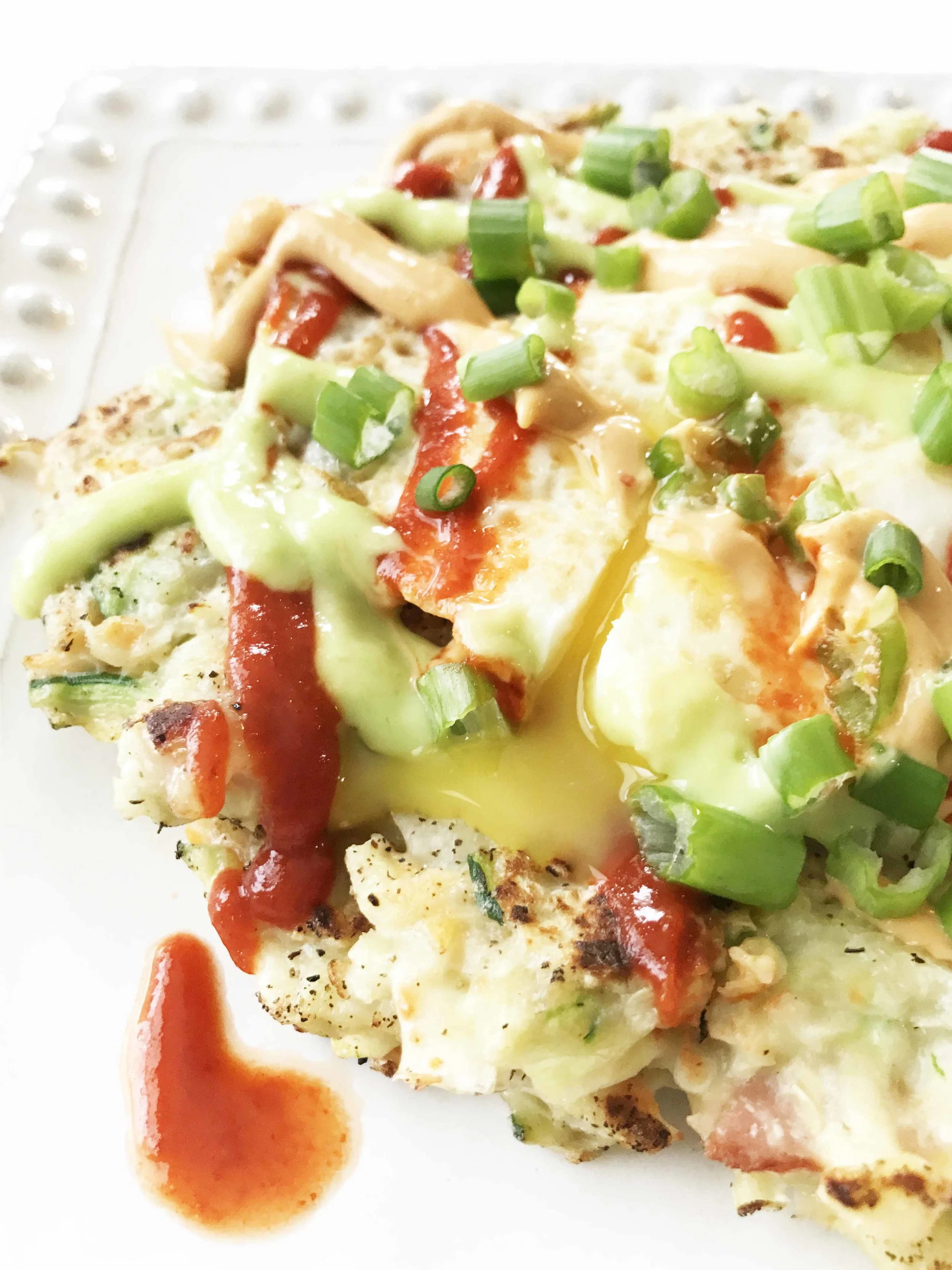 I used up some vegetables that I had on hand and topped mine with a cooked egg white, Sriracha, and Skinny Wasabi Aioli.