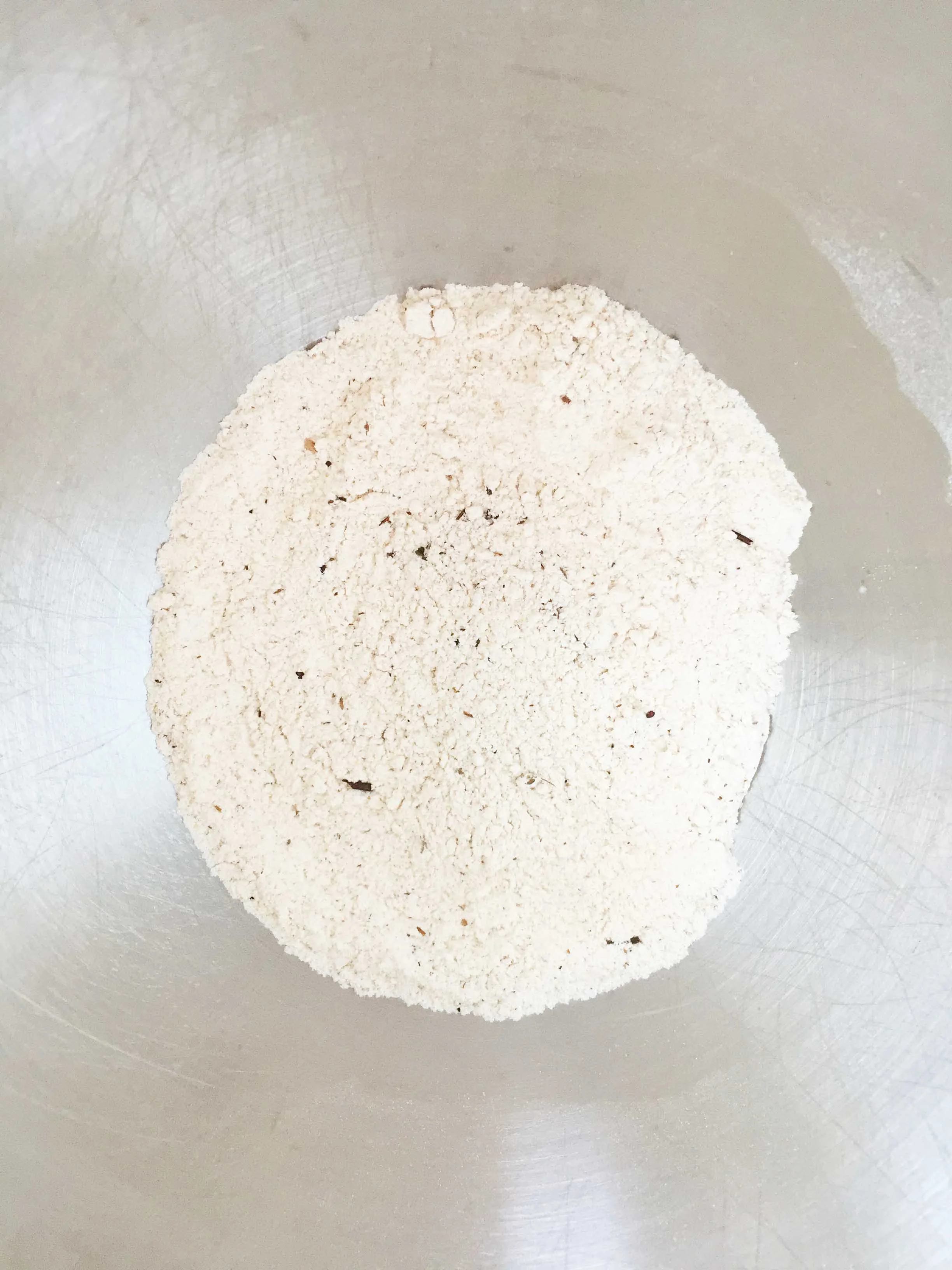 Combine 1/2 c. of the all-purpose flour, wheat flour, yeast, sugar, sweetener, salt, and seasoning into a large bowl together until well blended.