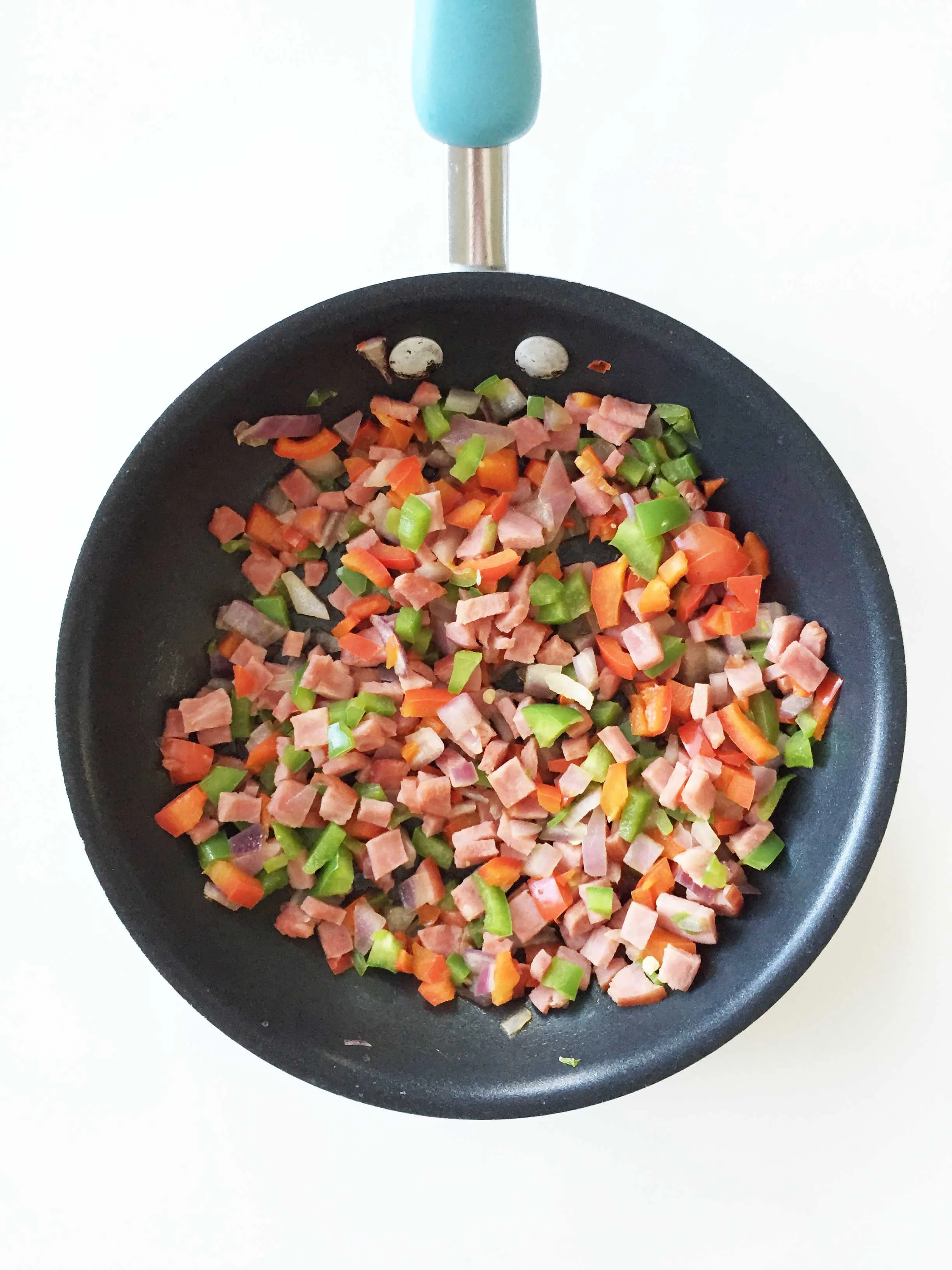 Place the canadian bacon, onions, and peppers into a skillet and cook over medium-high heat for a few minutes or until the vegetables are softening and the meat is cooked through.