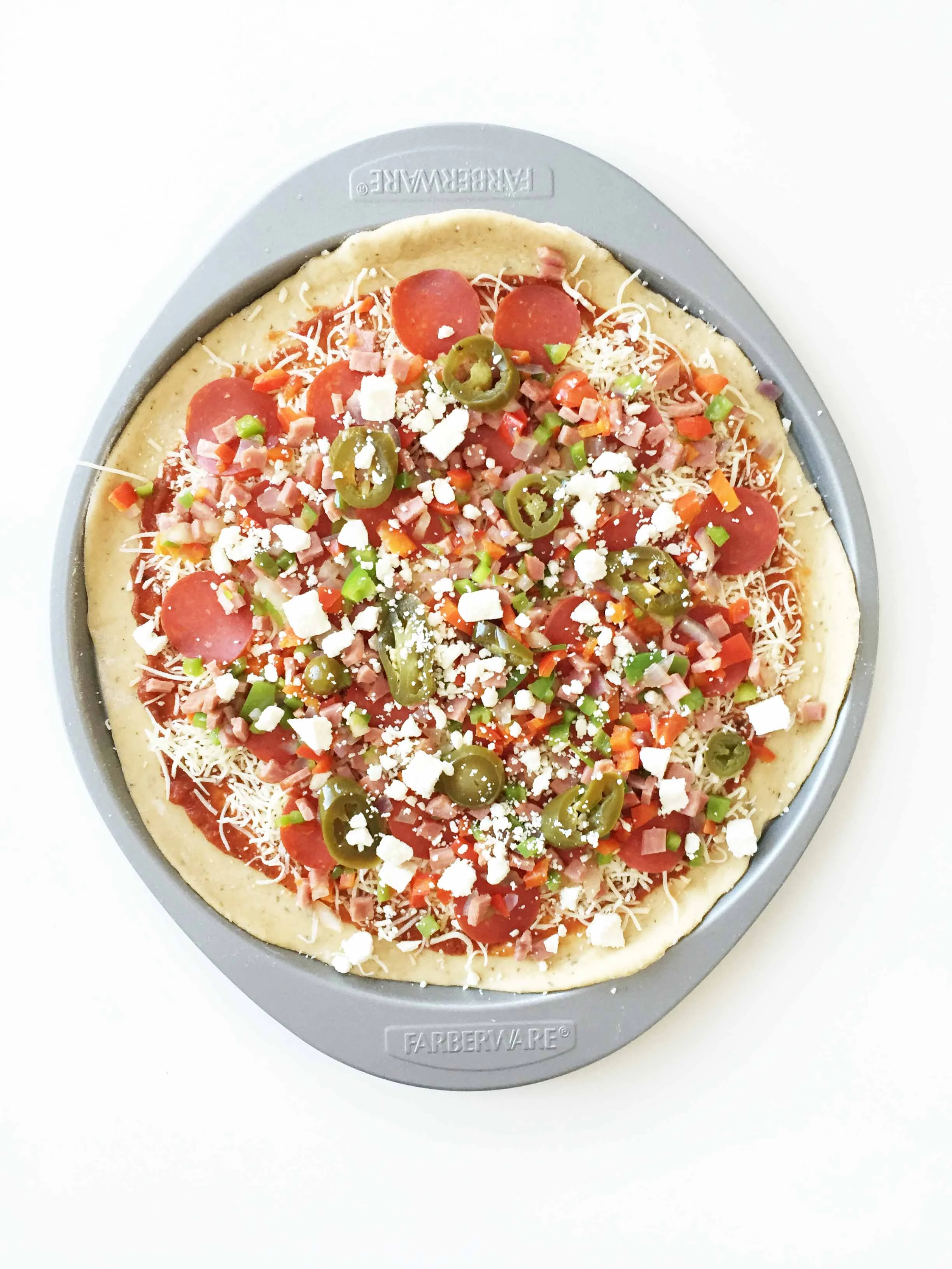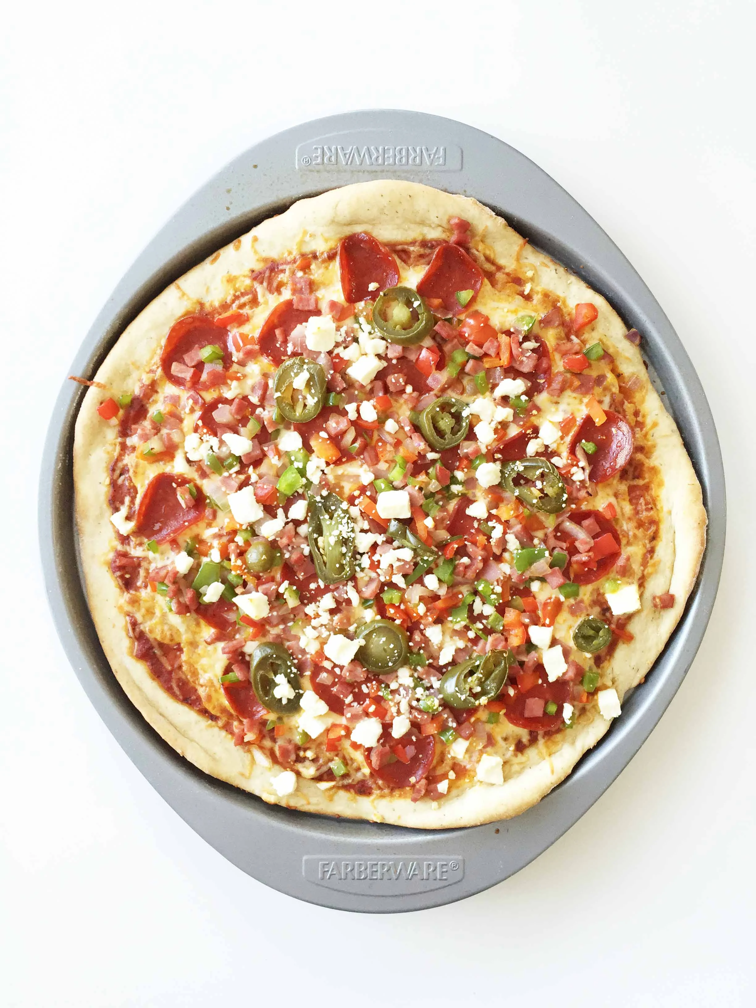 Top your prepared crust with sauce, italian cheese, pepperoni slices, the meat and pepper mix, feta, jalapeño slices and a sprinkle of crushed red pepper flakes.