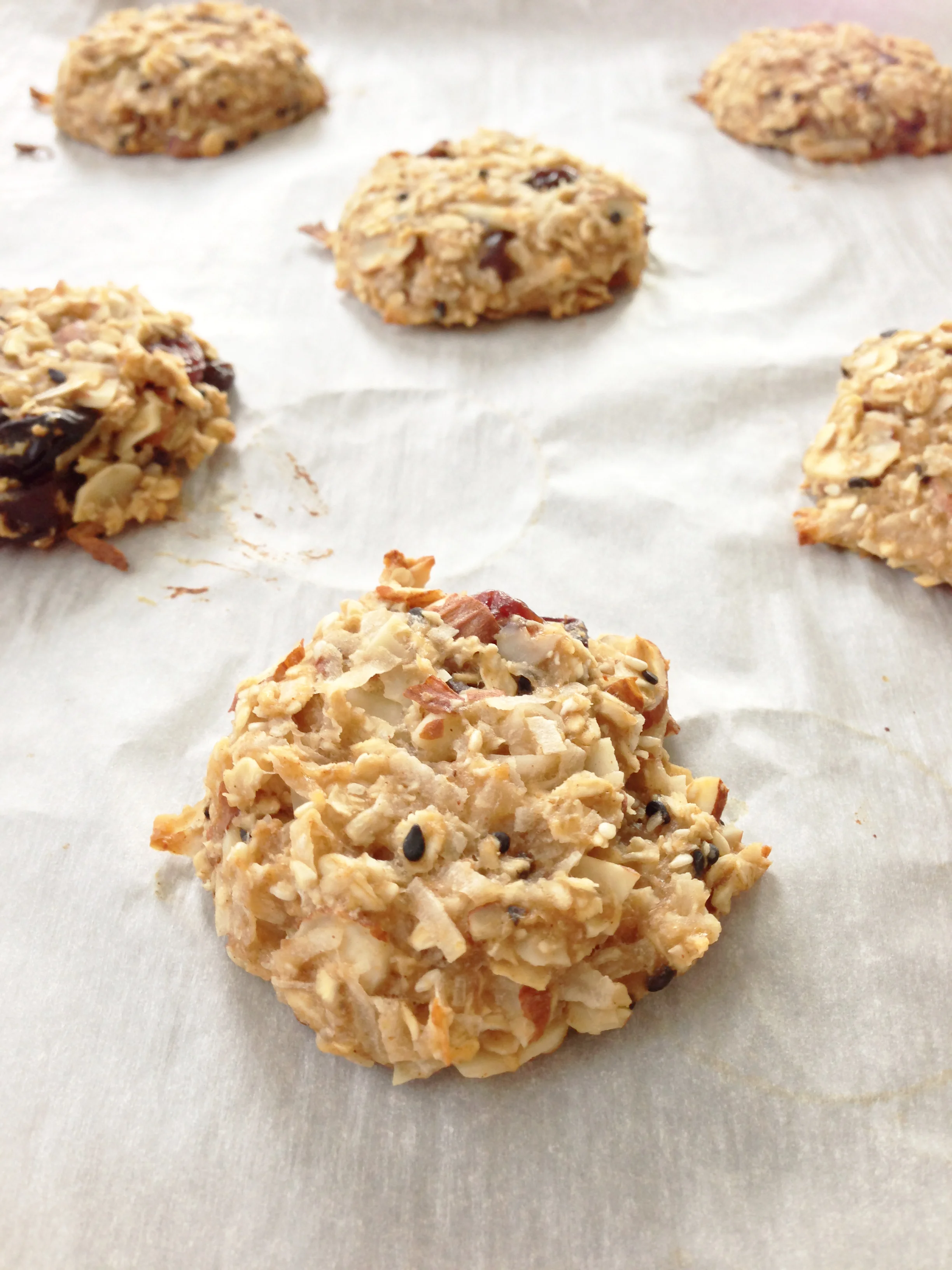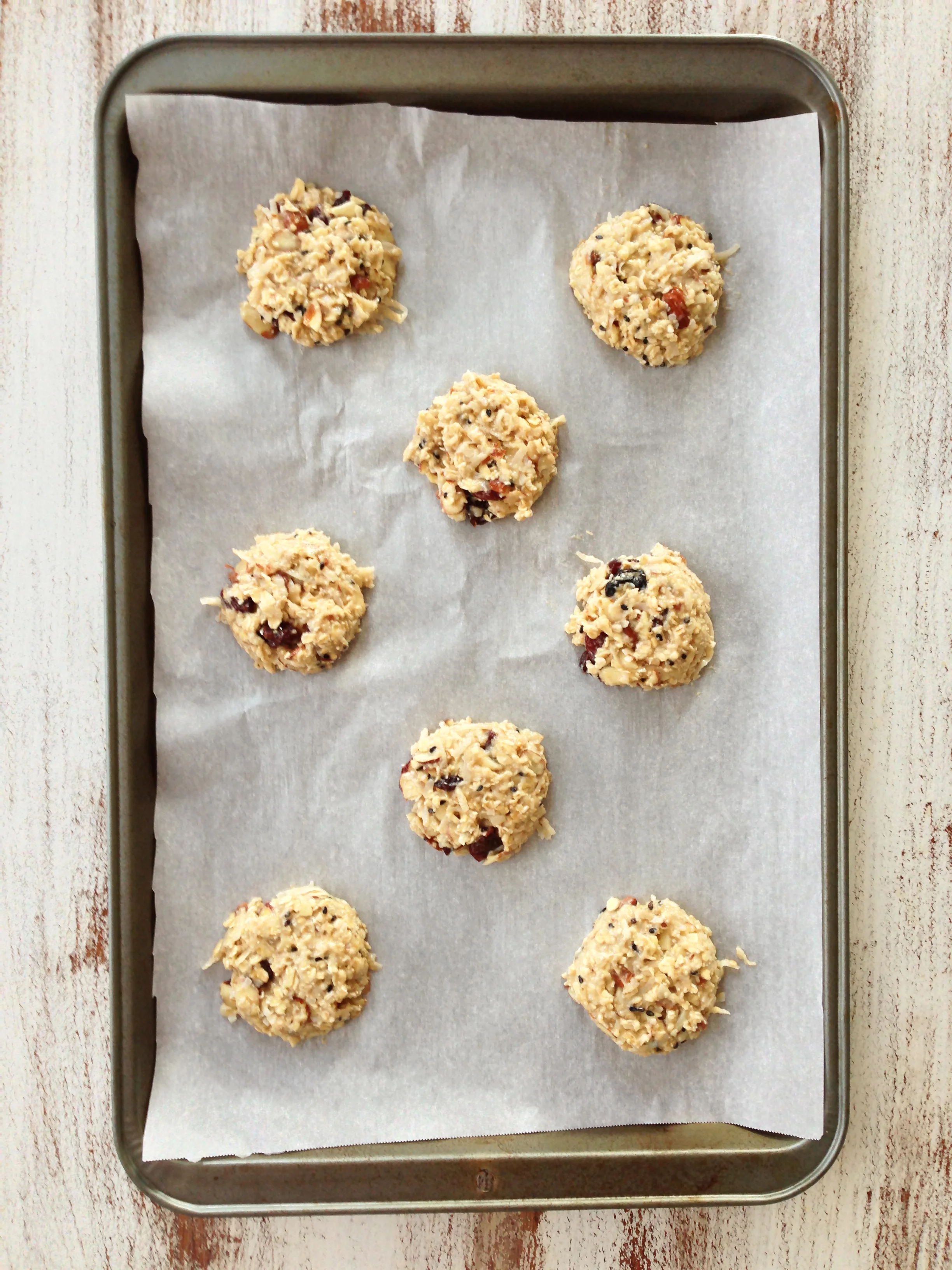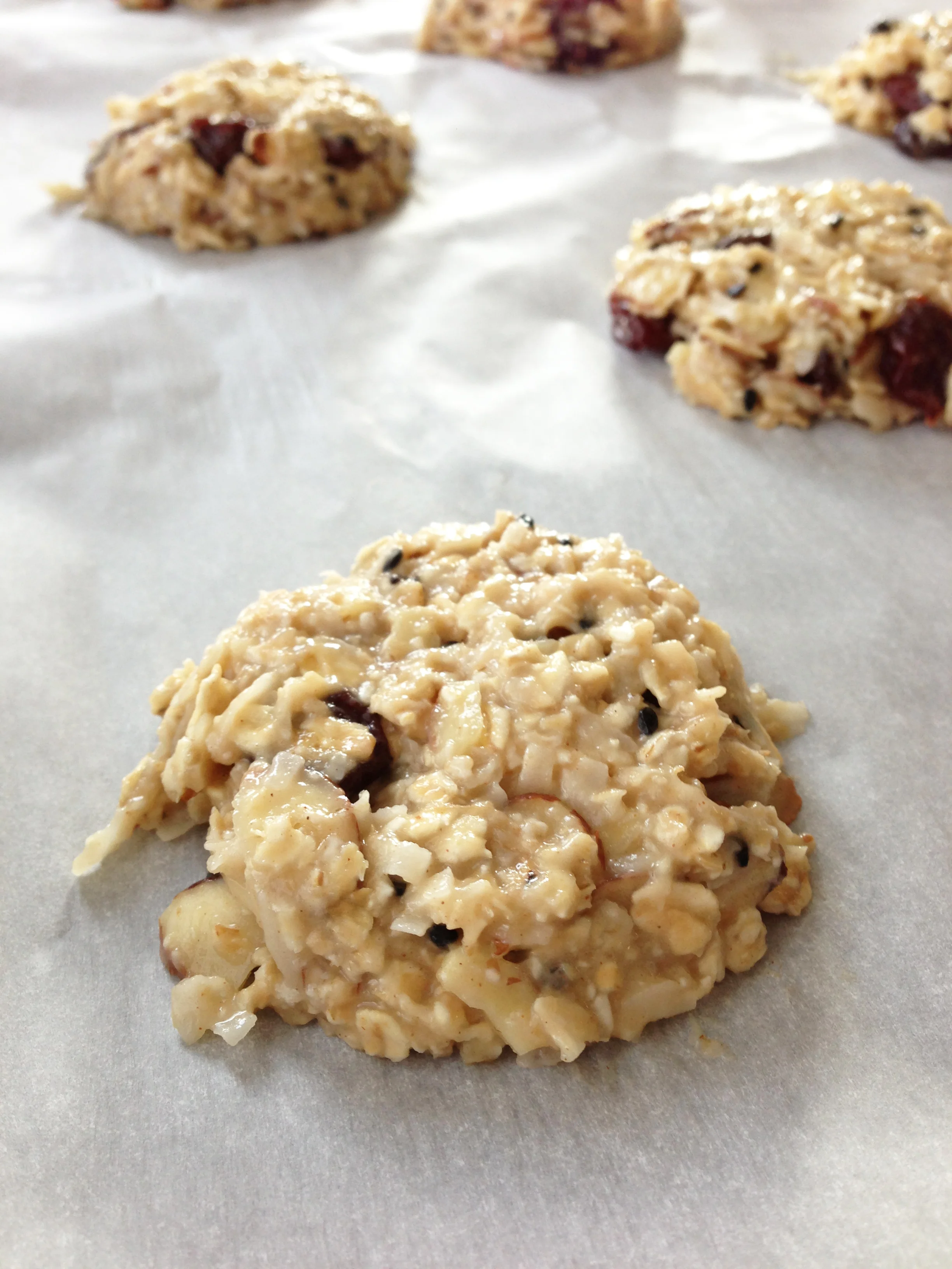 These cookies are super quick to whip up, taste amazing, and are full of good-for-you things to help keep you full through your morning. Oats. Seeds. Fruits. Nuts.