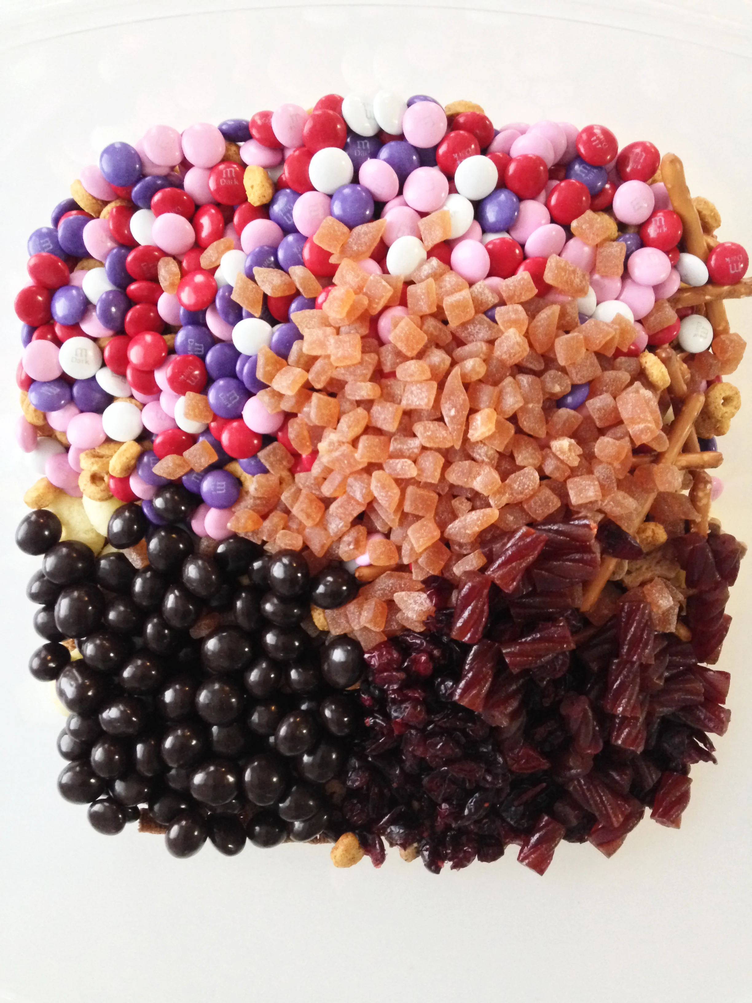 I used whole wheat and healthy cereals, natural fruit snacks, dark chocolates, and even some dried fruit.