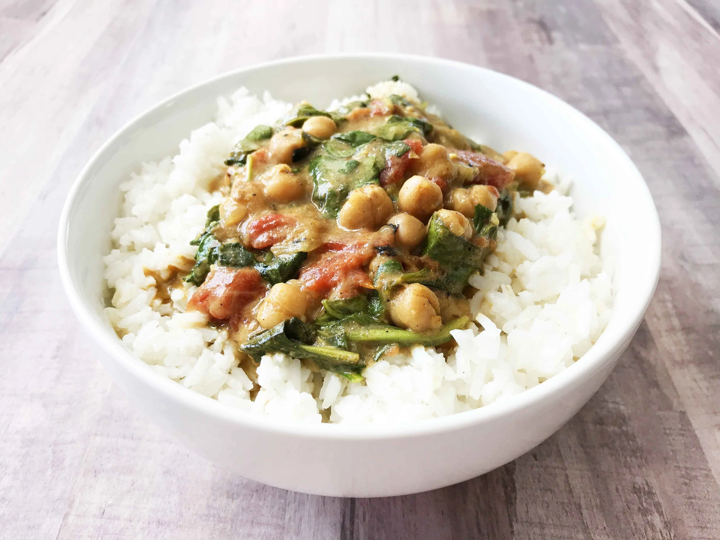 When the spinach is wiled, serve right away over your choice of rice, cauliflower, etc and enjoy!