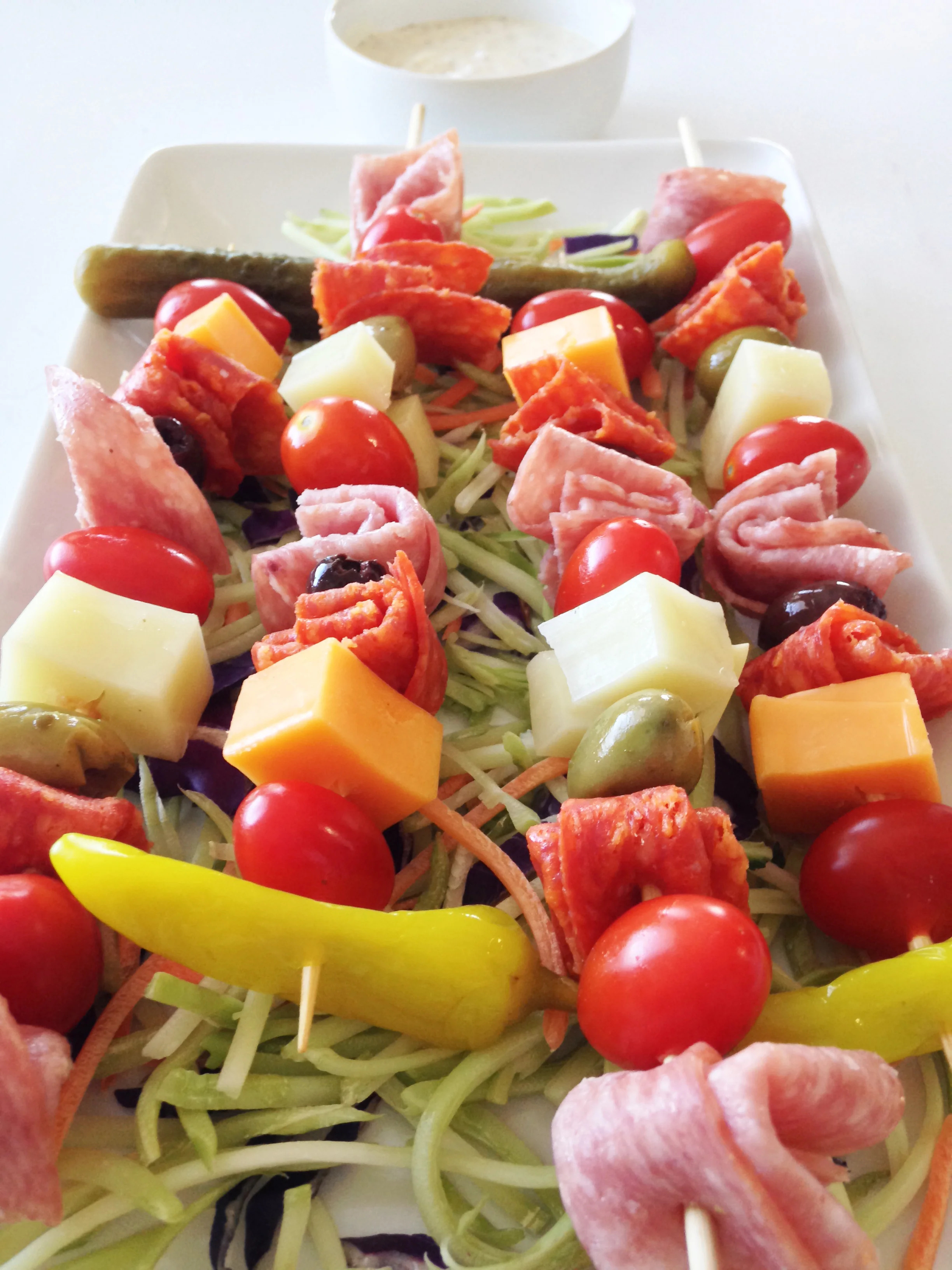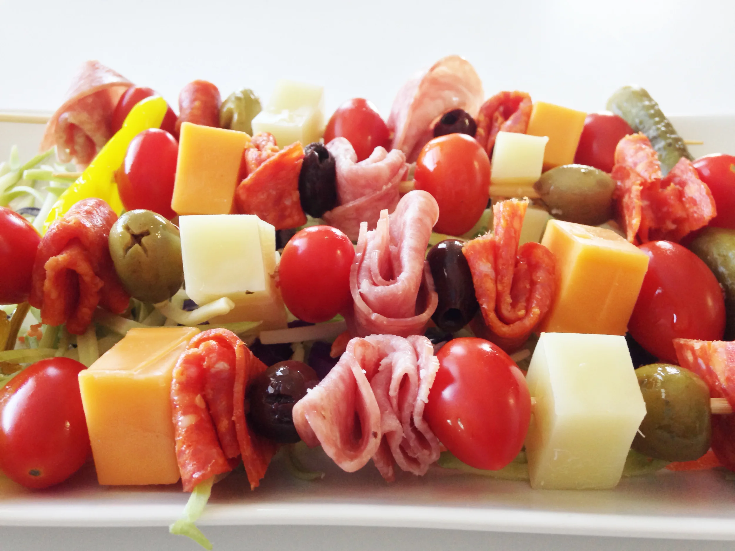 I ended up with one slice of each meat (halved), two cubes of cheese, two tomatoes, two olives, and either a pickle or peperoncini per skewer.