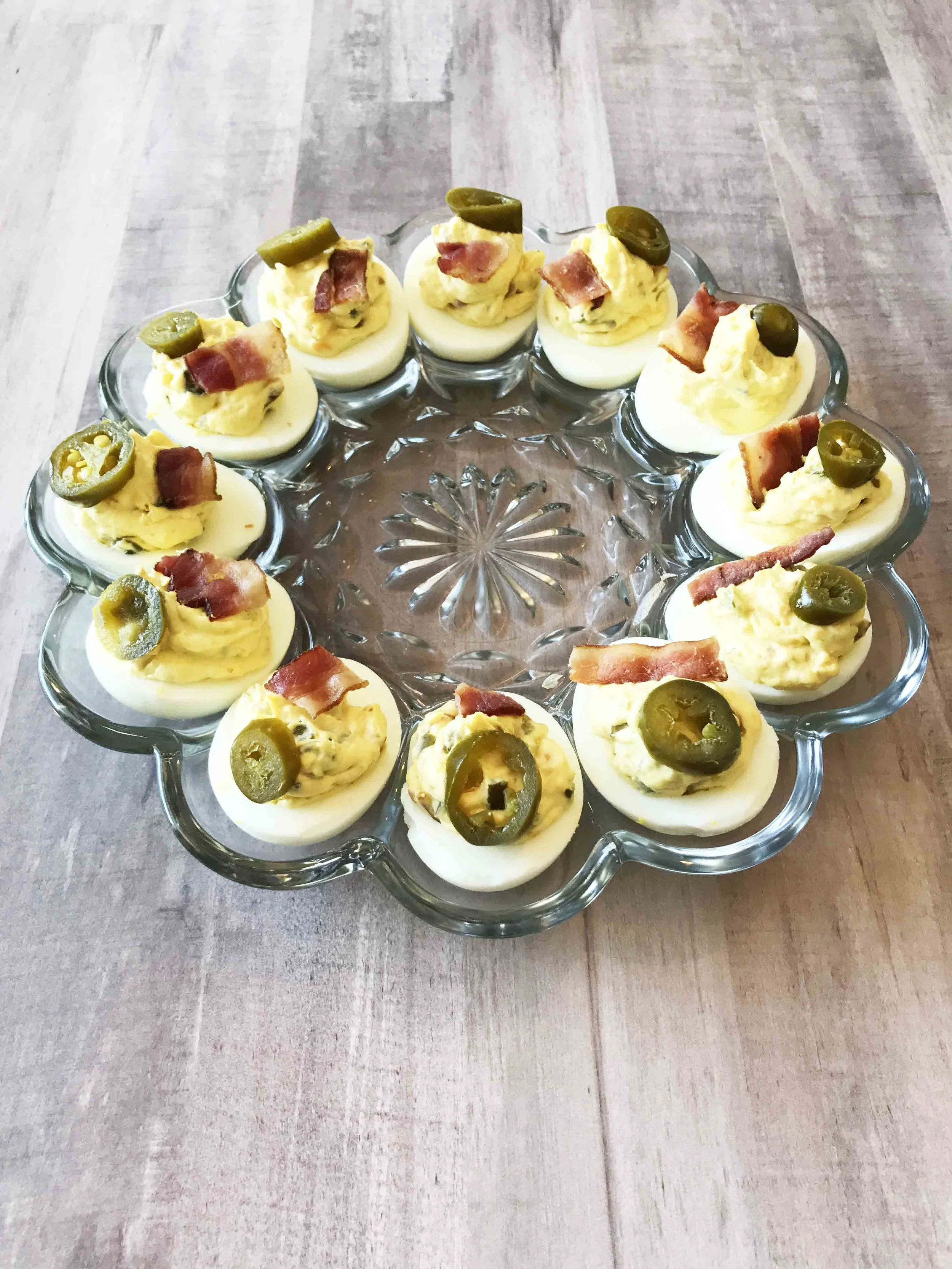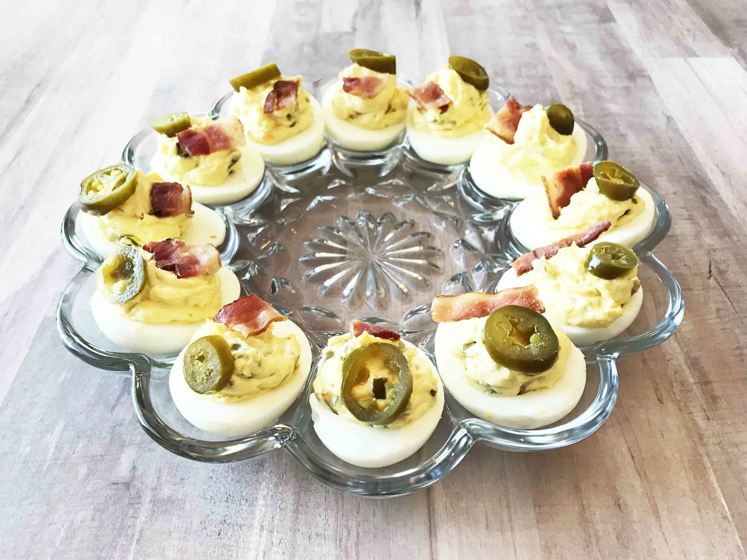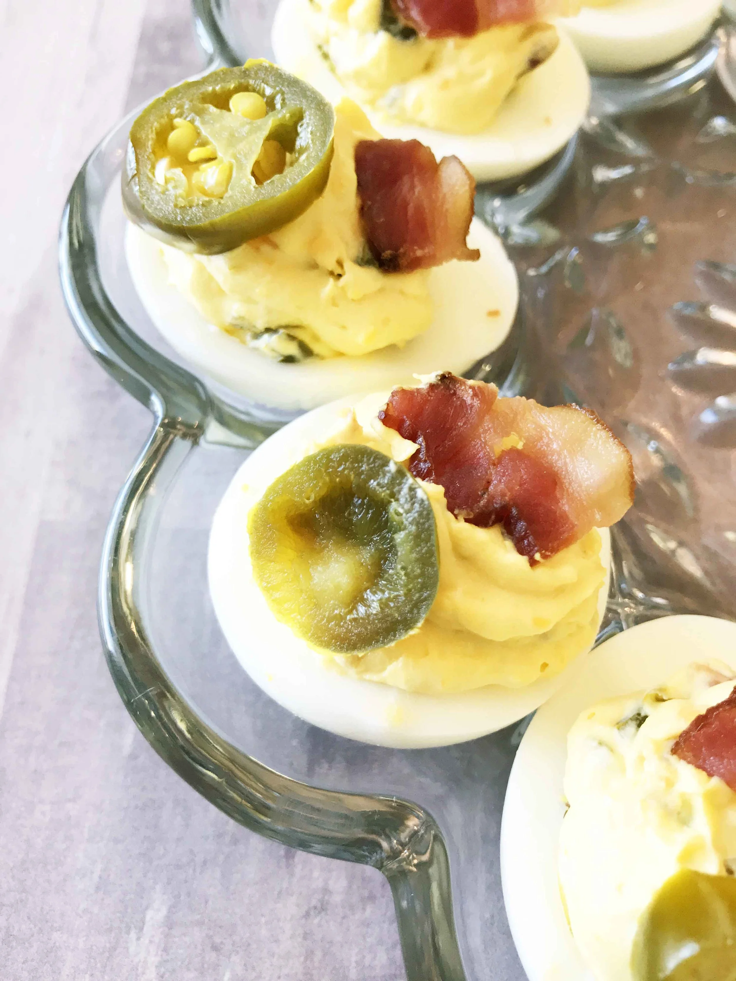 I lightened these deviled eggs up by using a lot less mayonnaise, subbing in some greek yogurt. Outside of that, they’re loaded up with bacon, cheese, and pickled jalapeños to really get that ‘popper’ taste in there!
