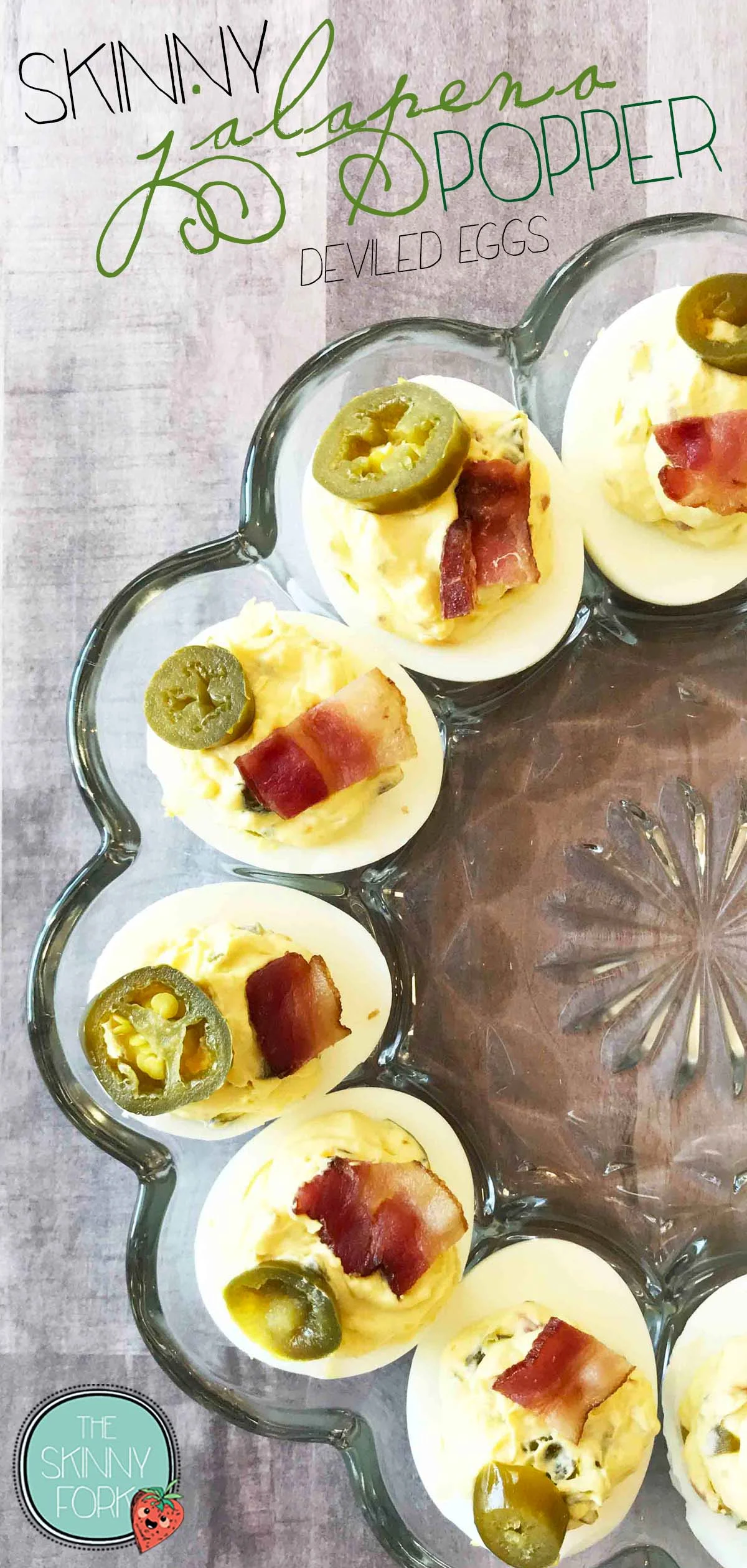 TheSkinnyFork.com These are not your grandma's deviled eggs! Loaded with bacon, cheddar, and jalapeño too! Lightened up and amazingly delicious. Prep Time: 10 Minutes • Cook Time: 0 Hours