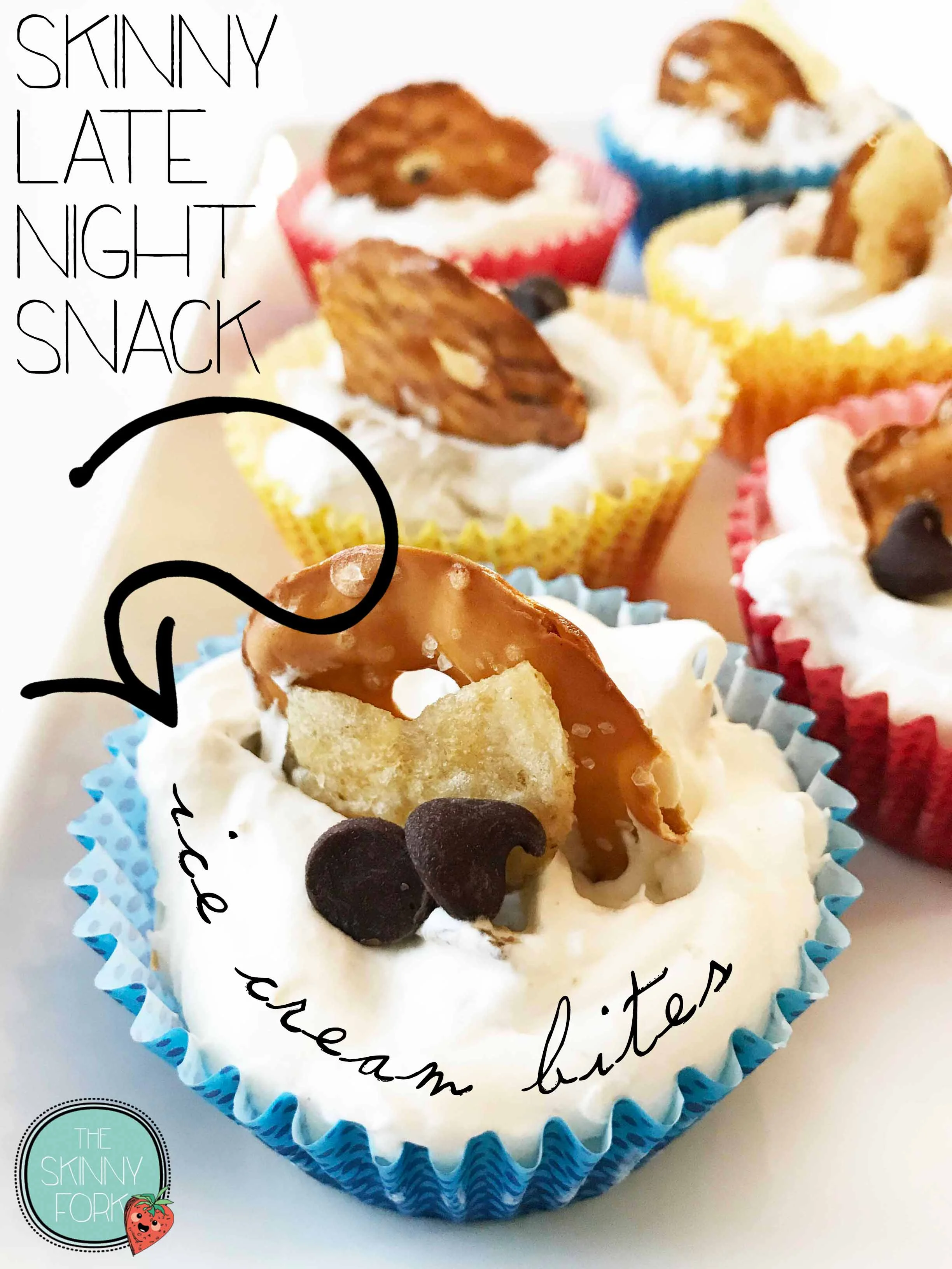These Skinny Late Night Summer Snack Ice Cream Bites are a perfect fit. They cover the list of wants and needs with their variety of sweet, salty, crunchy and cold. There's seriously something for everyone in there and it's all good amazing stuff! I see these being great for late night summer snacking in their perfectly portioned 3-4 bites of ice cream heaven.