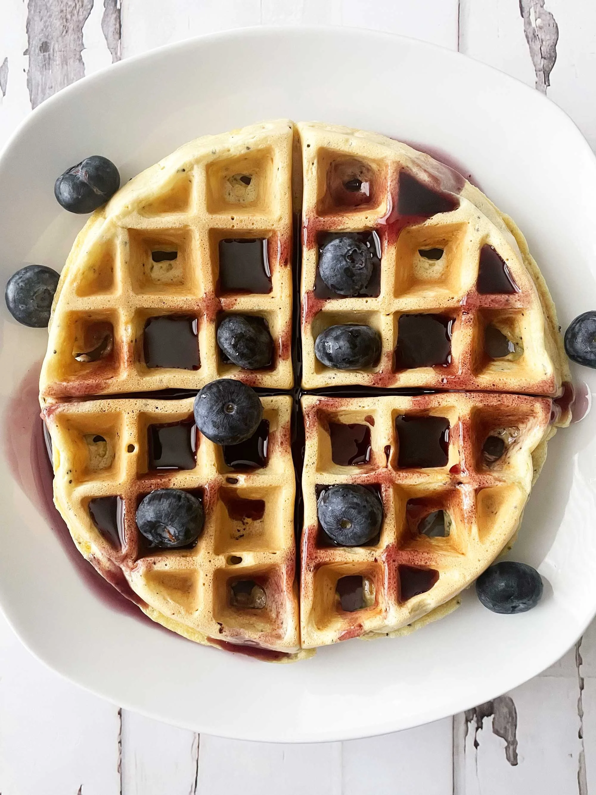 I topped my Lemon Poppy Seed Waffles off with a blueberry syrup, but another option would be a lemon curd. Or both. You could definitely go with both too! As mentioned below, I use a large Belgian waffle maker, but you can use this same batter in any waffle iron so long s you go along with the manufacture instructions as far as how much batter and cook time.