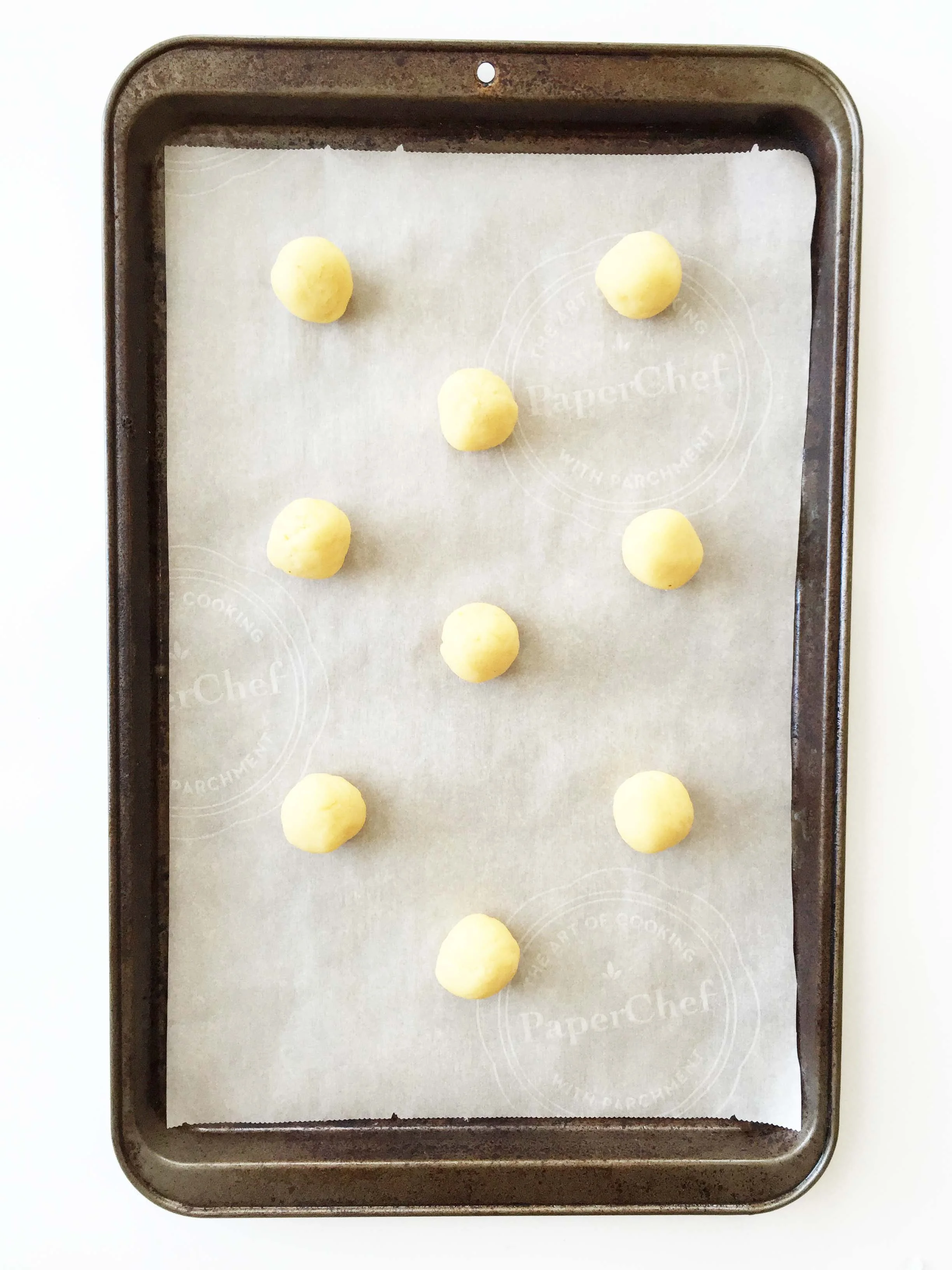 Roll the dough into 1" balls and place 2" apart on the prepared baking sheet.
