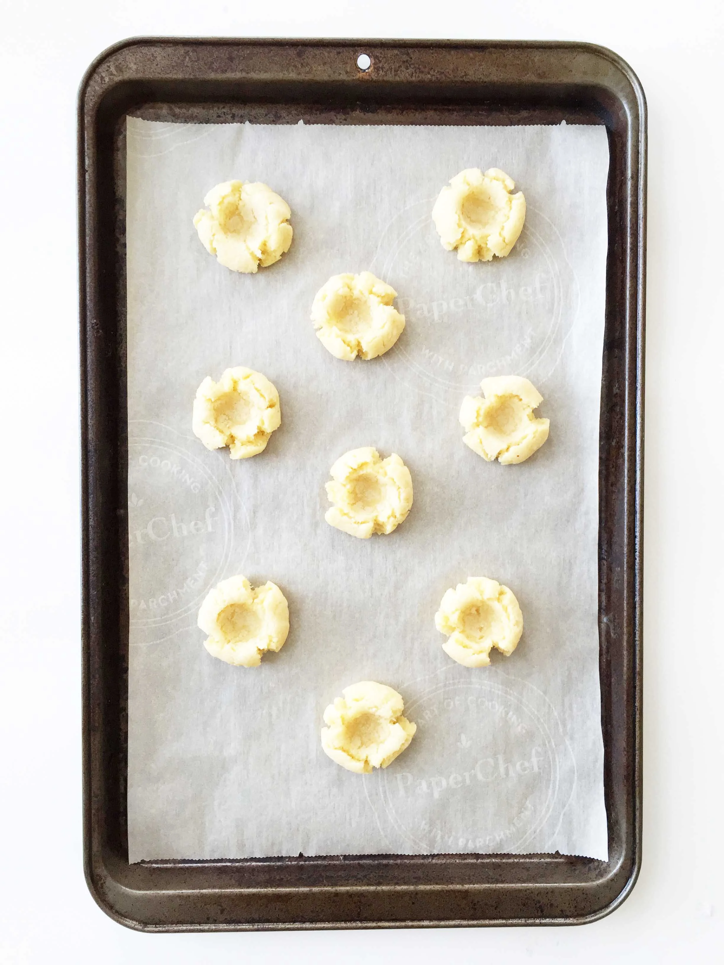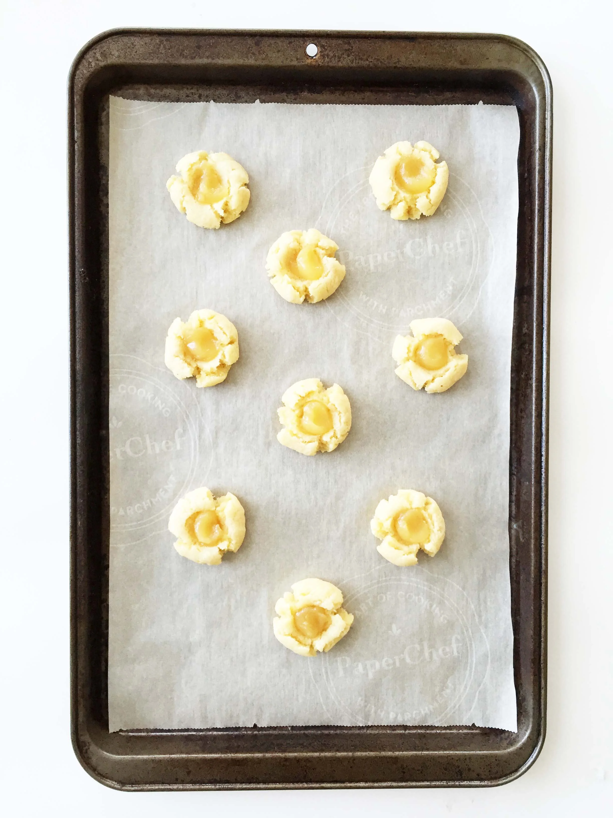 Remove from the oven and use a round 1/2 Tsp. measuring spoon to press down about 3/4 of the way though the cookie to make an indention.