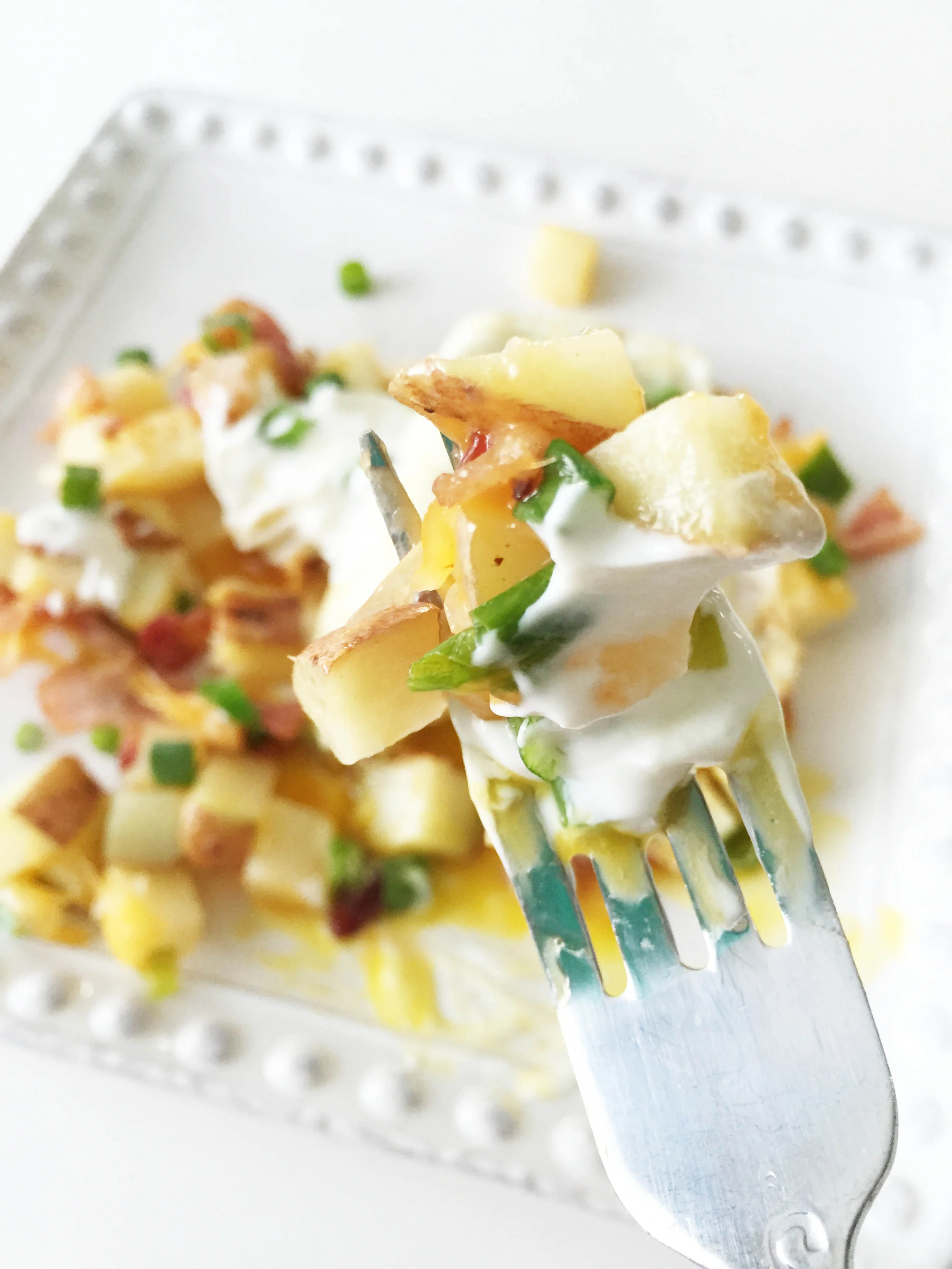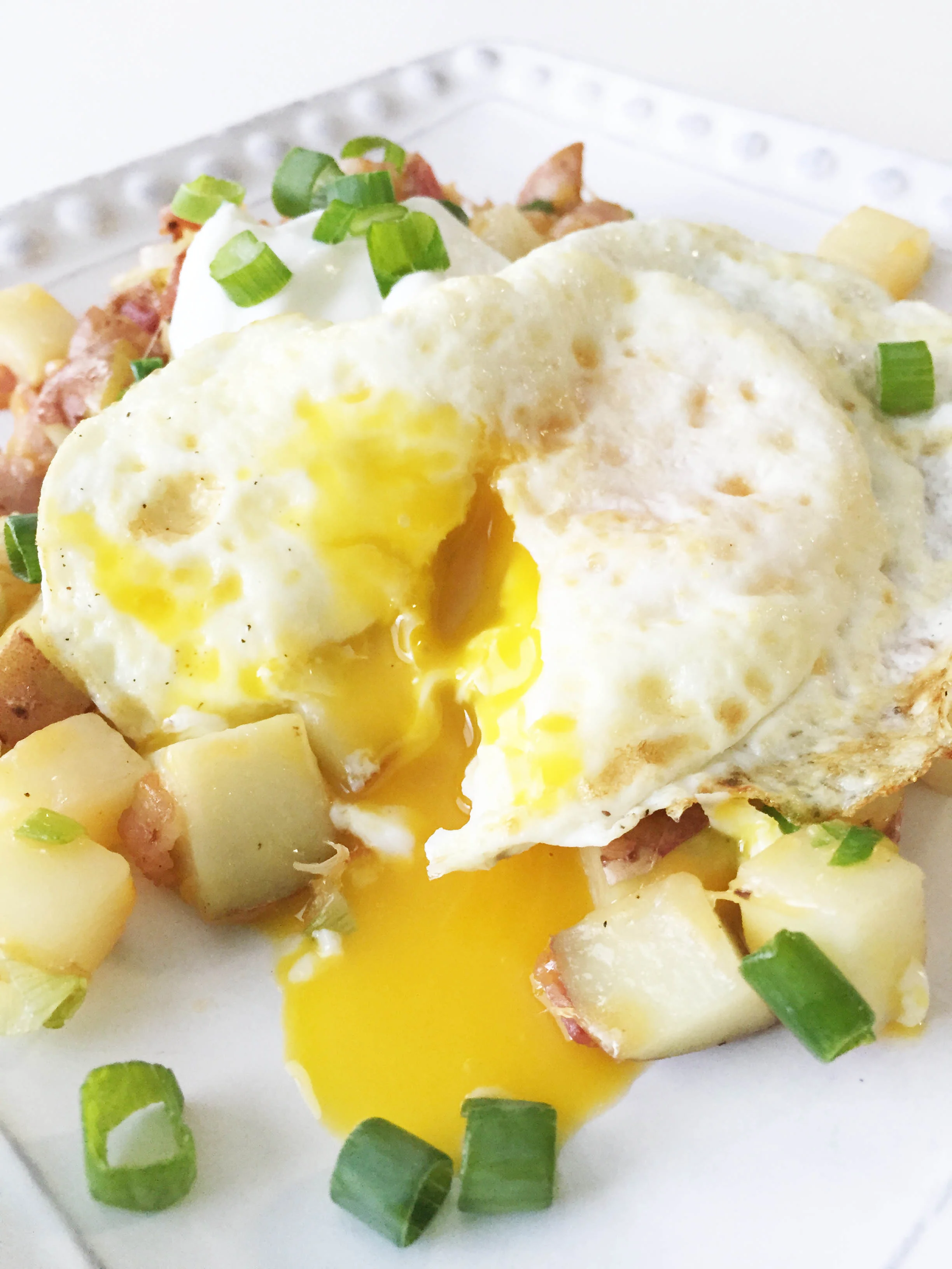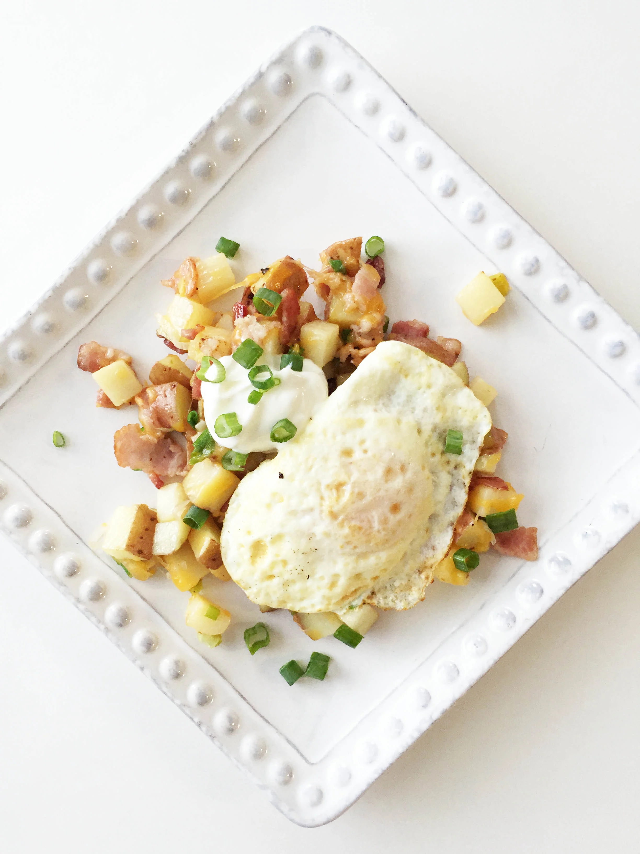 Once done, plate the potatoes and top with the egg, sour cream, and a few more green onions for garnish.