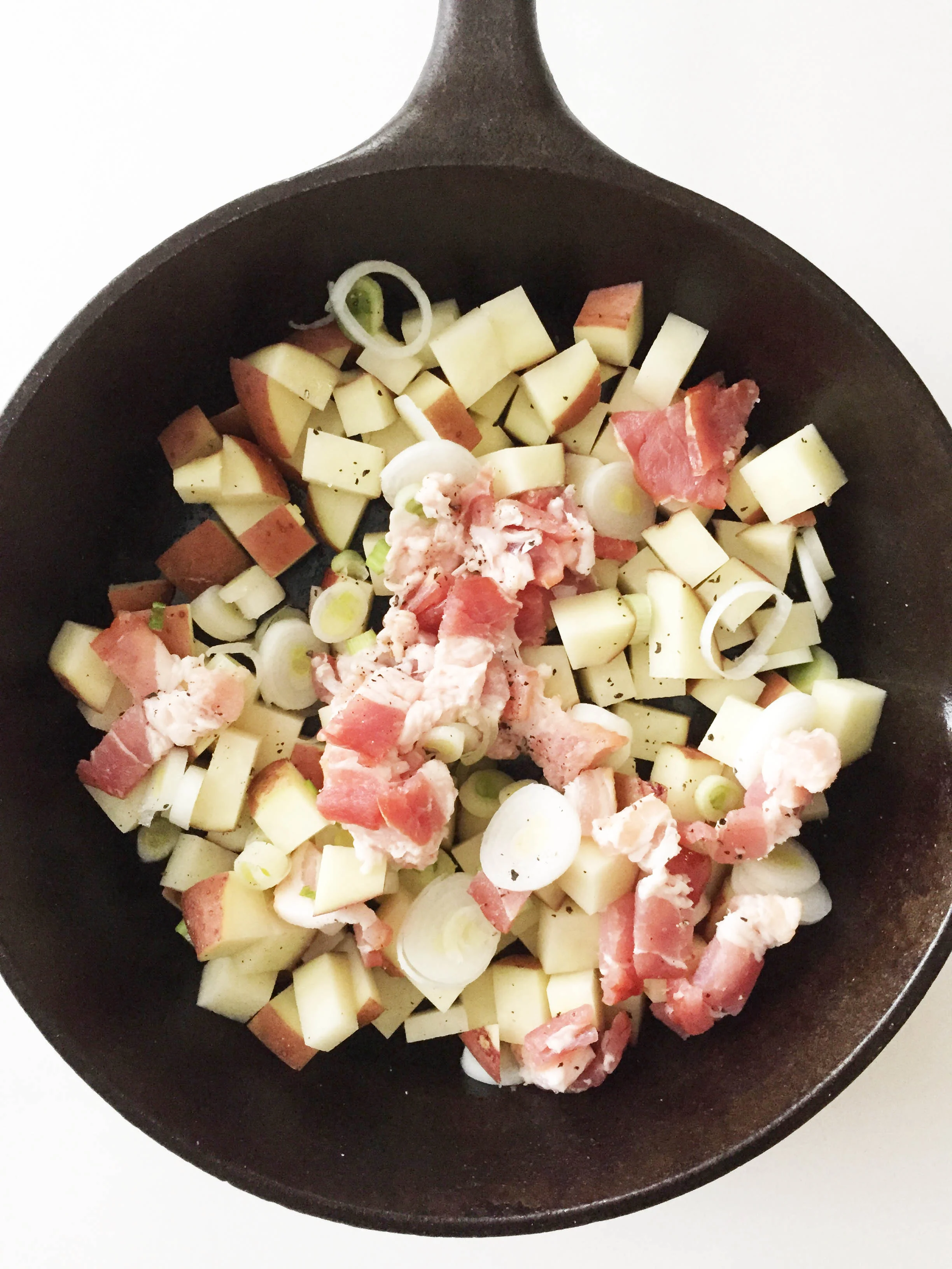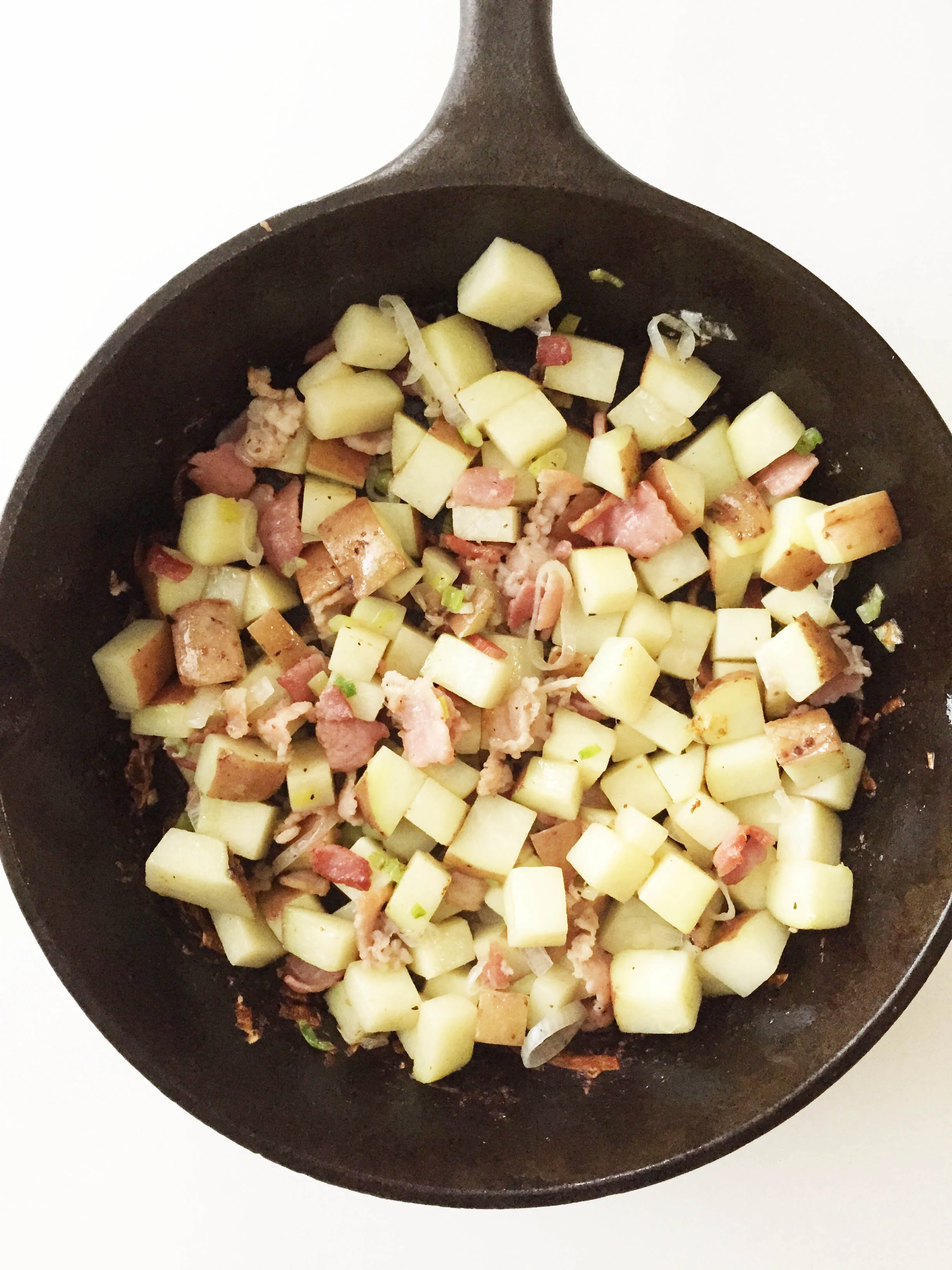 Toss the potato, bacon, and onion into the skillet and heat over medium to medium-high heat for about ten minutes or until the bacon is cooked through and the potatoes are tender.