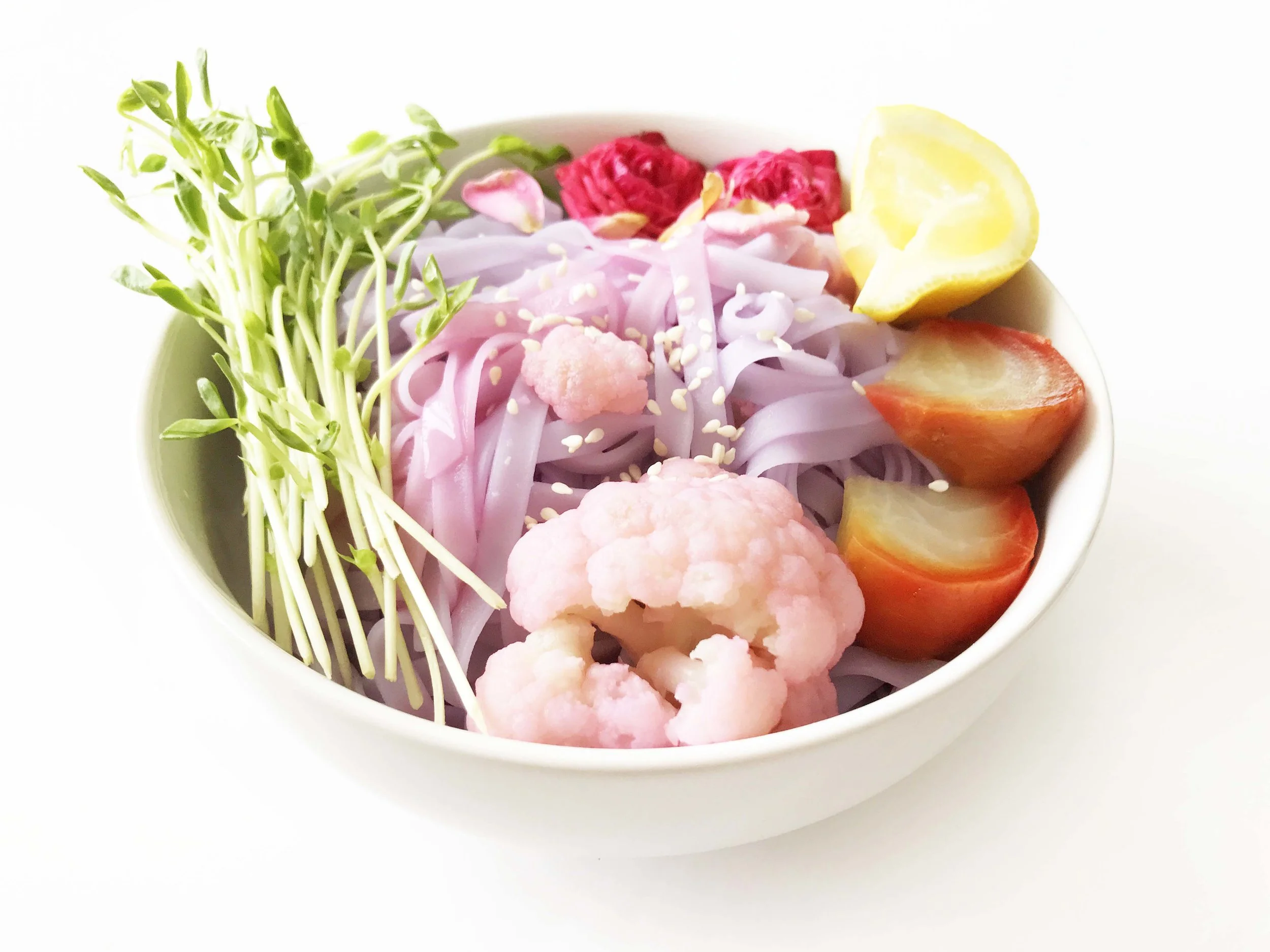 Unlike most 'colored' noodles out there, we're coloring these naturally by way of a purple cabbage. This gives those rice noodles a beautiful all natural light purple color.