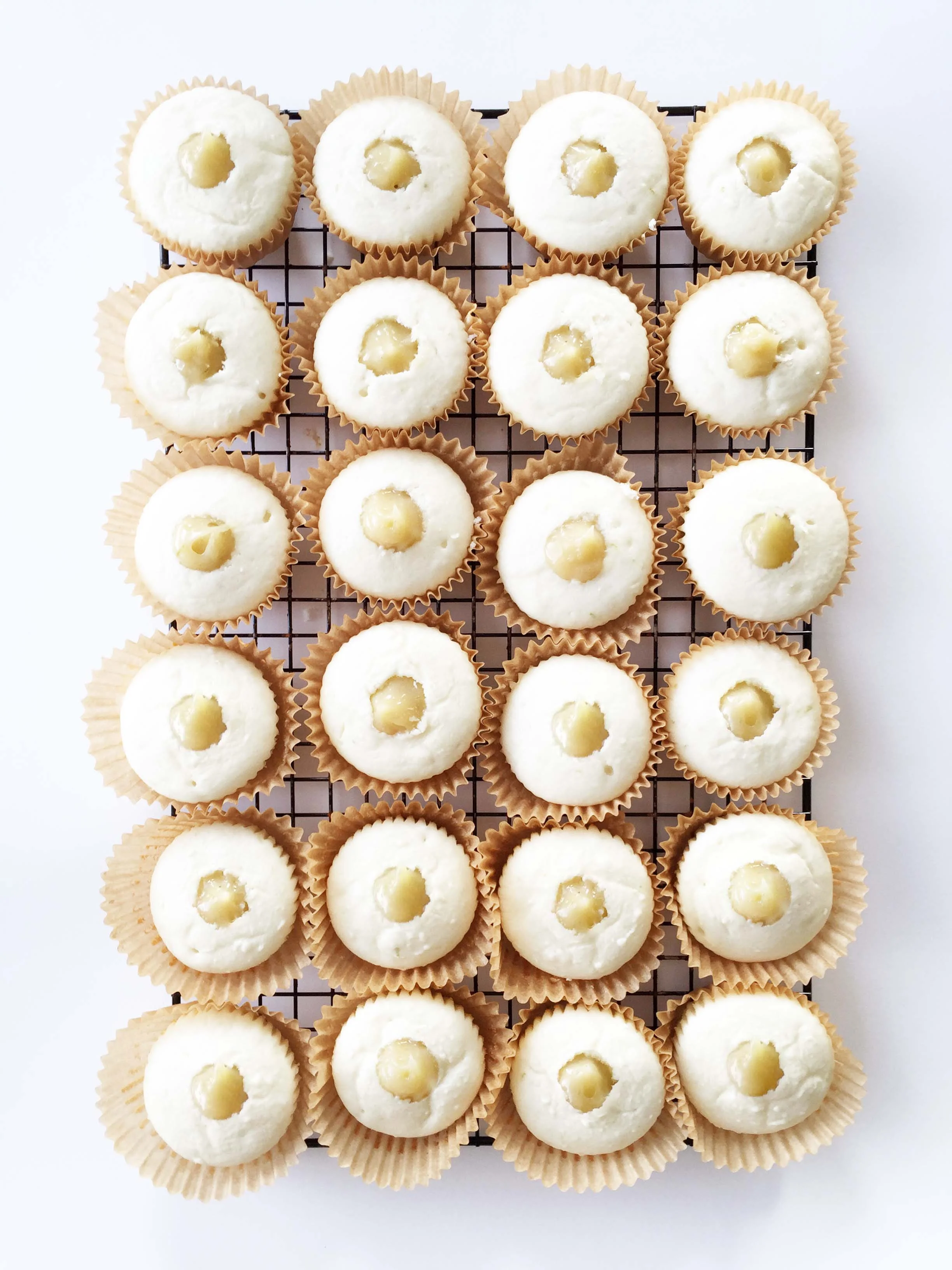 Pipe the filling into the hollowed out centers of the completely cooled cupcakes.