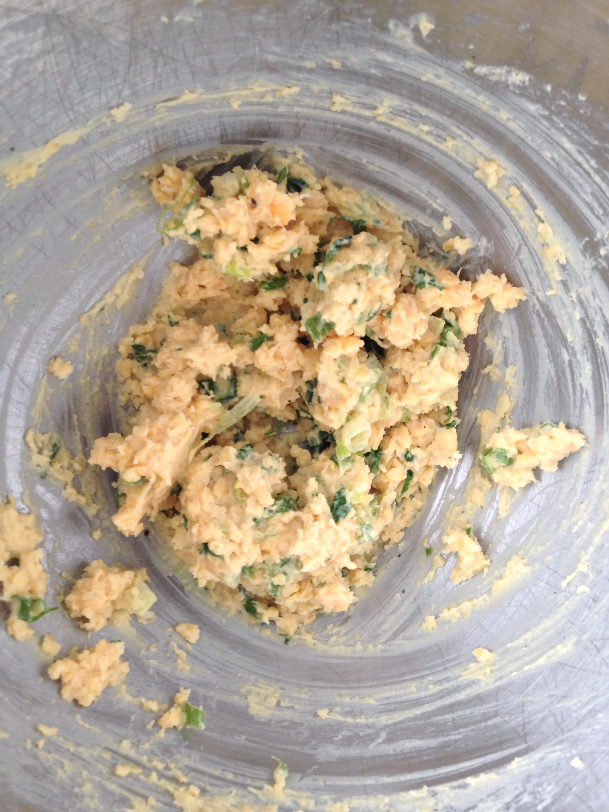 Beat the chickpeas, spreadable cheese, green onion and cilantro together in a medium bowl until the garbanzo beans are fairly smashed.