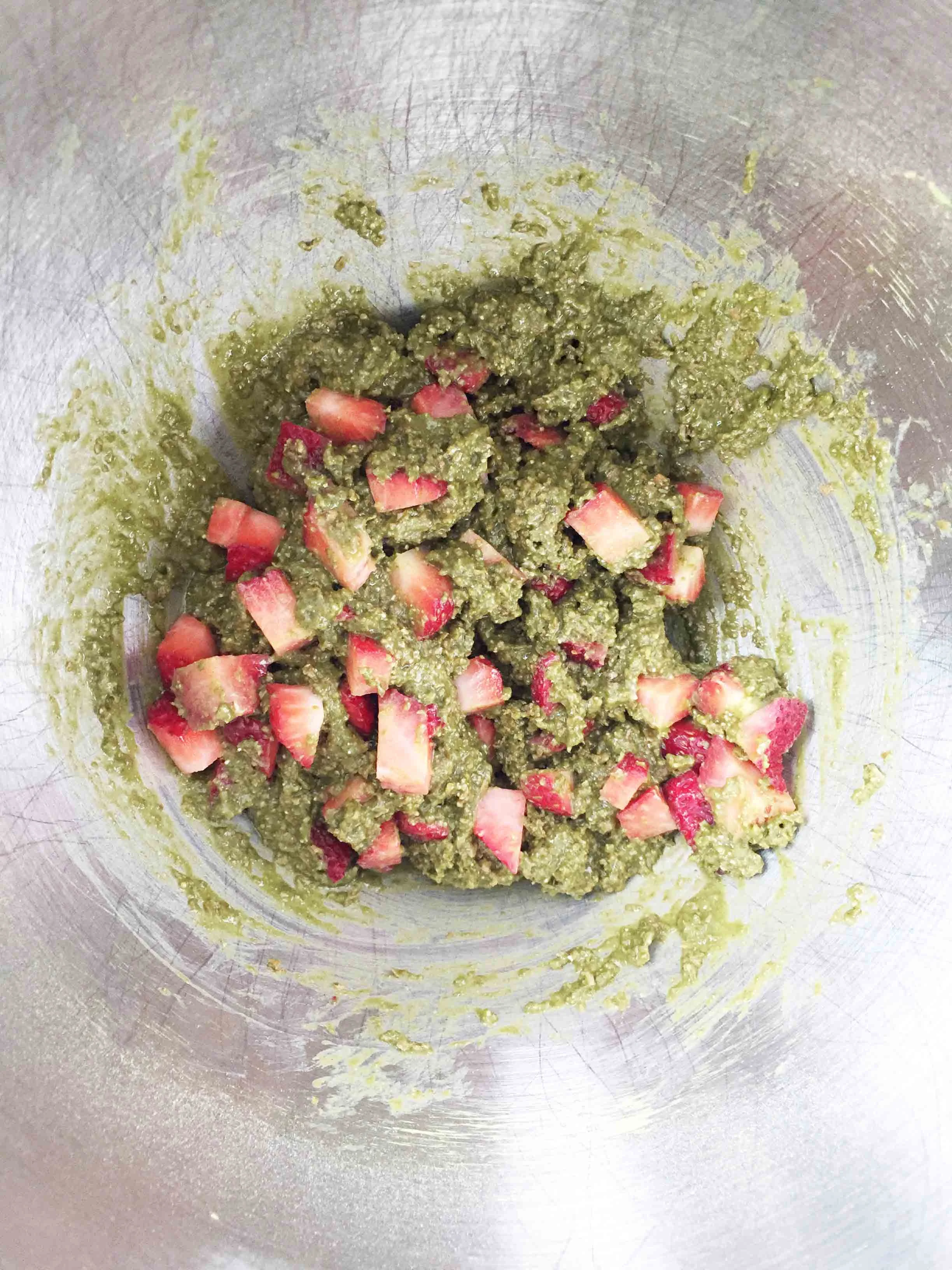 To keep these muffins rather simple, I started off with a whole wheat bran muffin dry mix that I added to and amplified into the matcha glory that it now is. One of my favorite things with matcha, as you've seen, is strawberry. I think that's because the sweetness of the berry counteracts the sometimes bitter notes that come along with matcha naturally.
