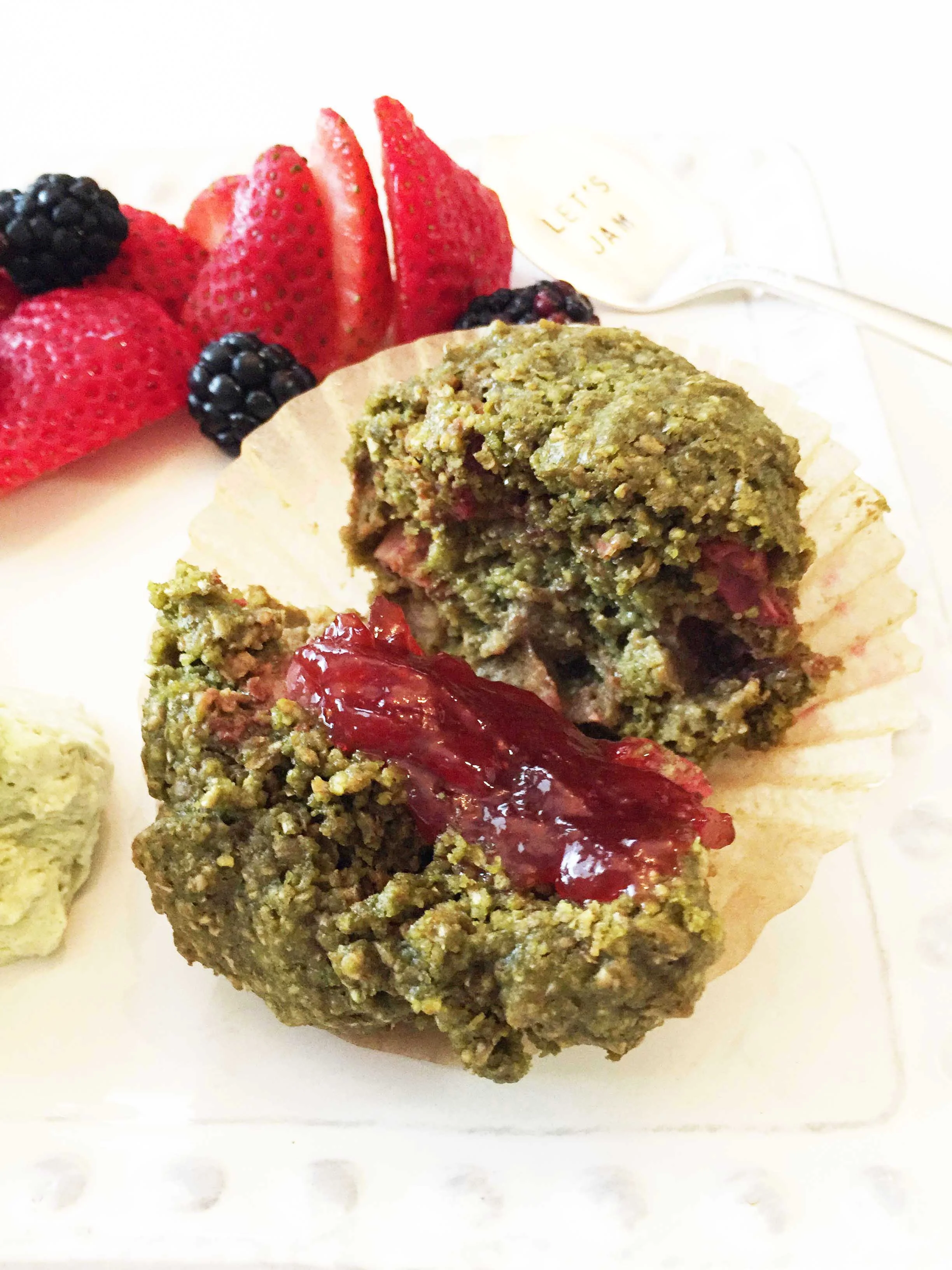 I served mine with some more fresh berries, strawberry jam, and... oh, yes - that's matcha whipped cream right there that I made from scratch. Good stuff. I mean... you can't really go wrong with any sort of whipped cream in my book!