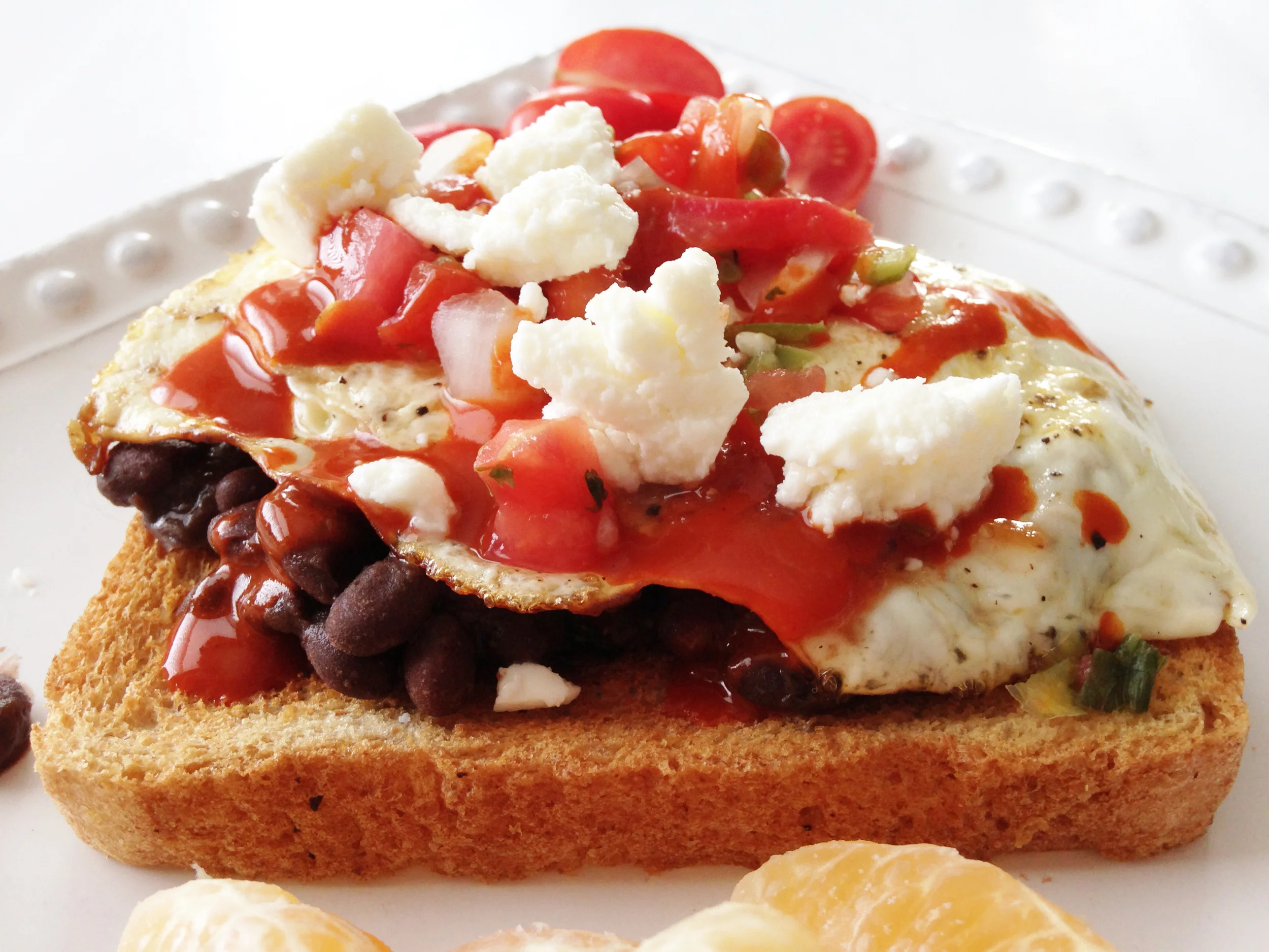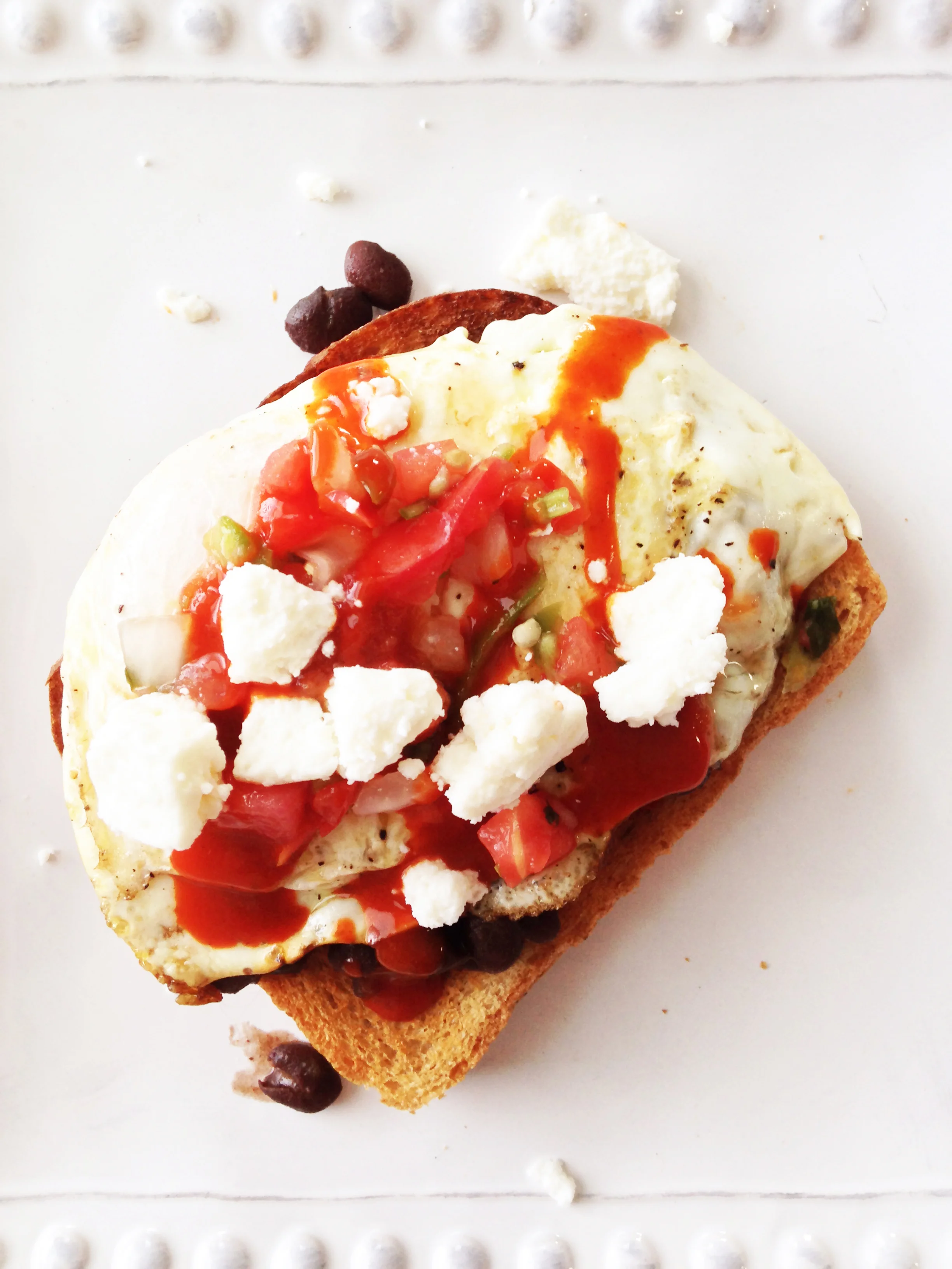 Place the black beans over the toast, followed by the egg, pico, queso, and hot sauce.