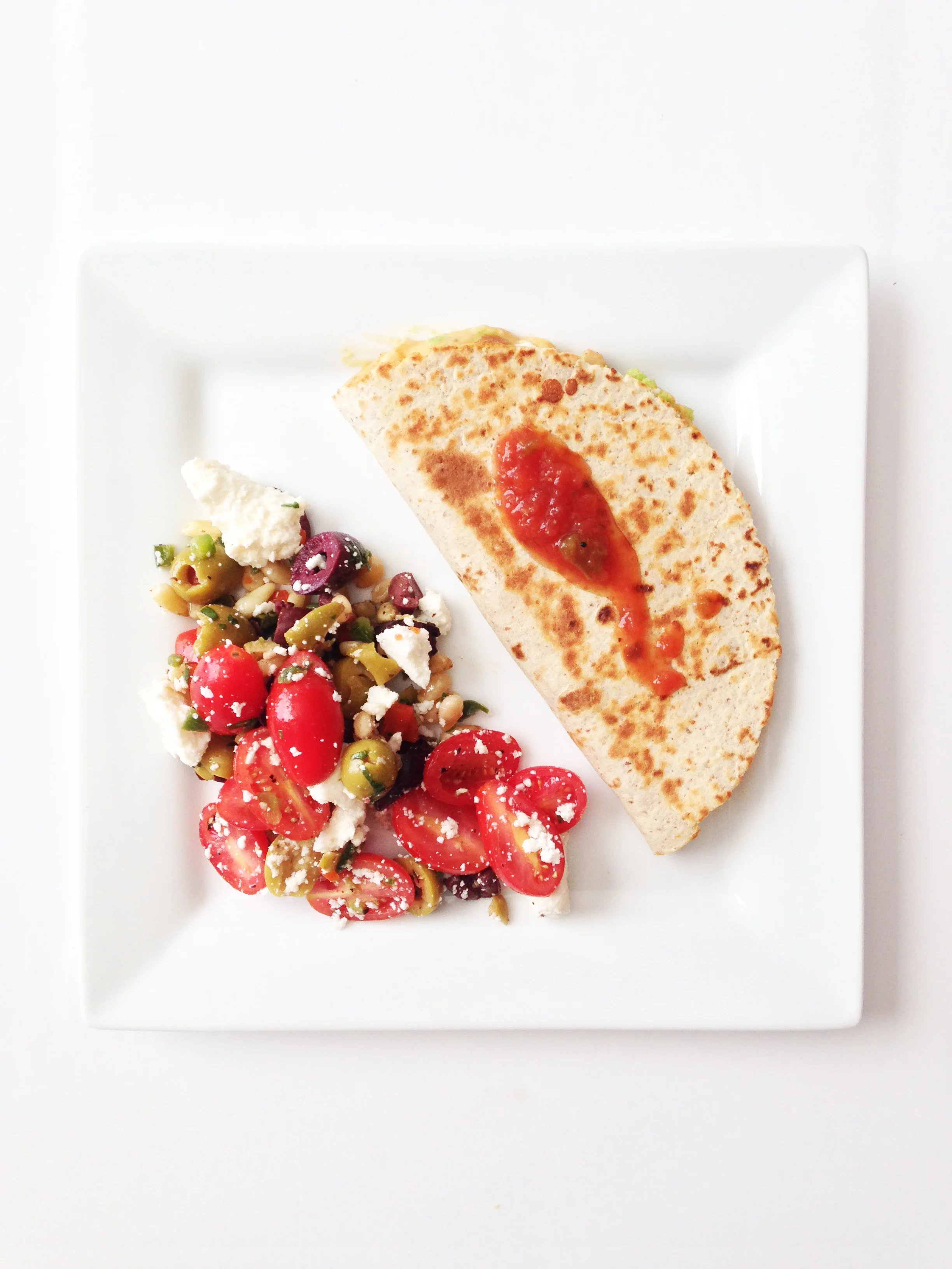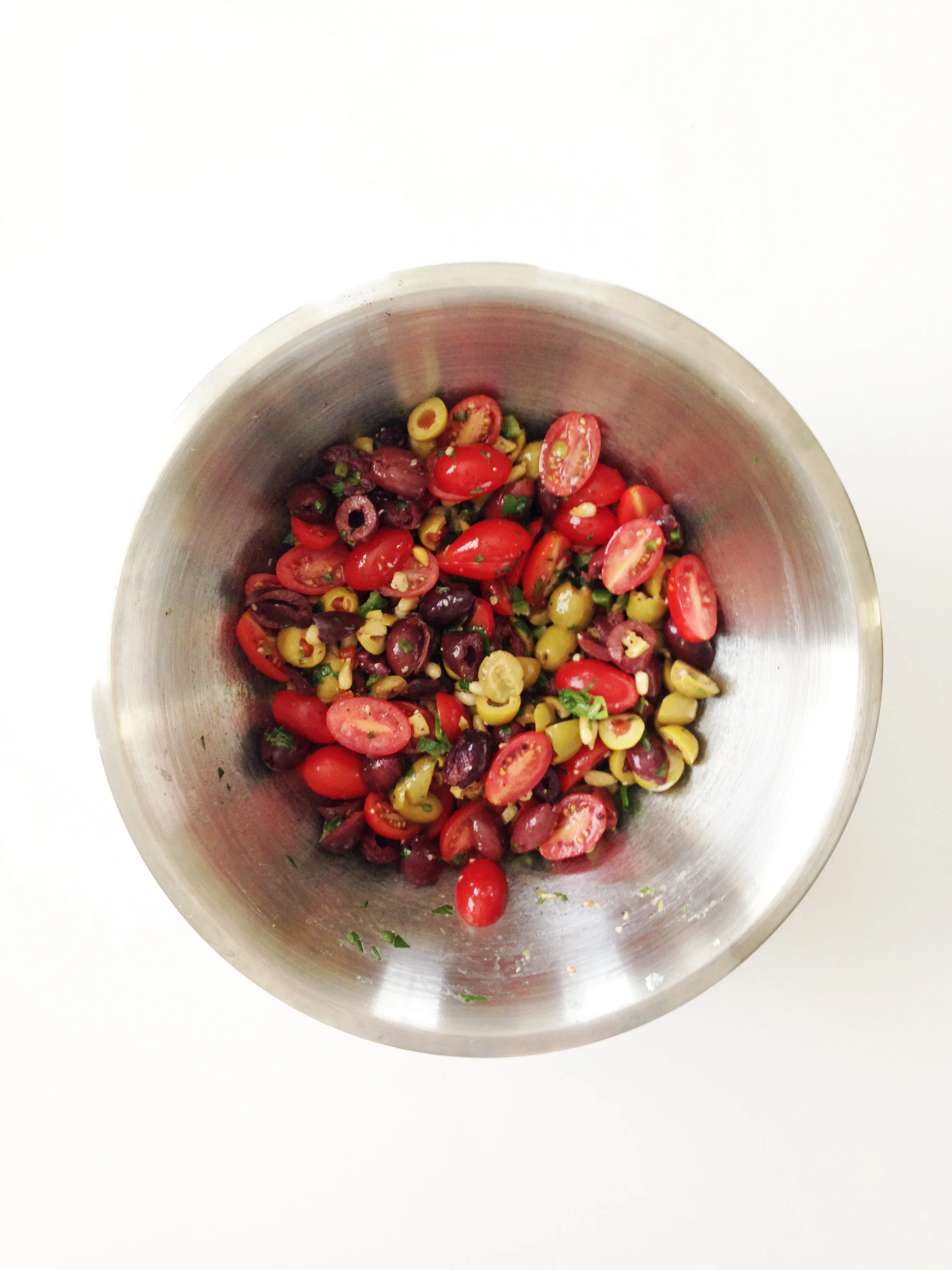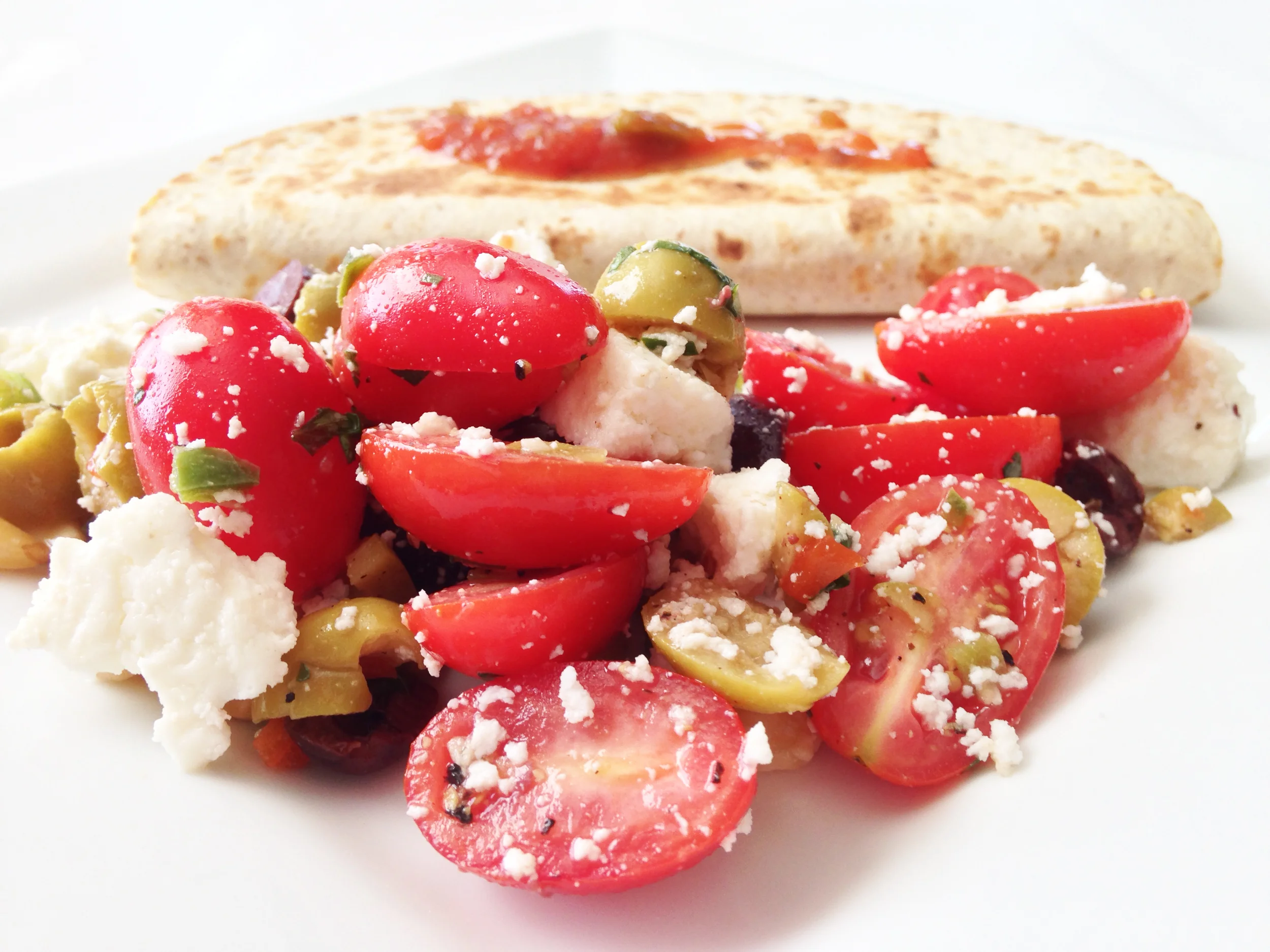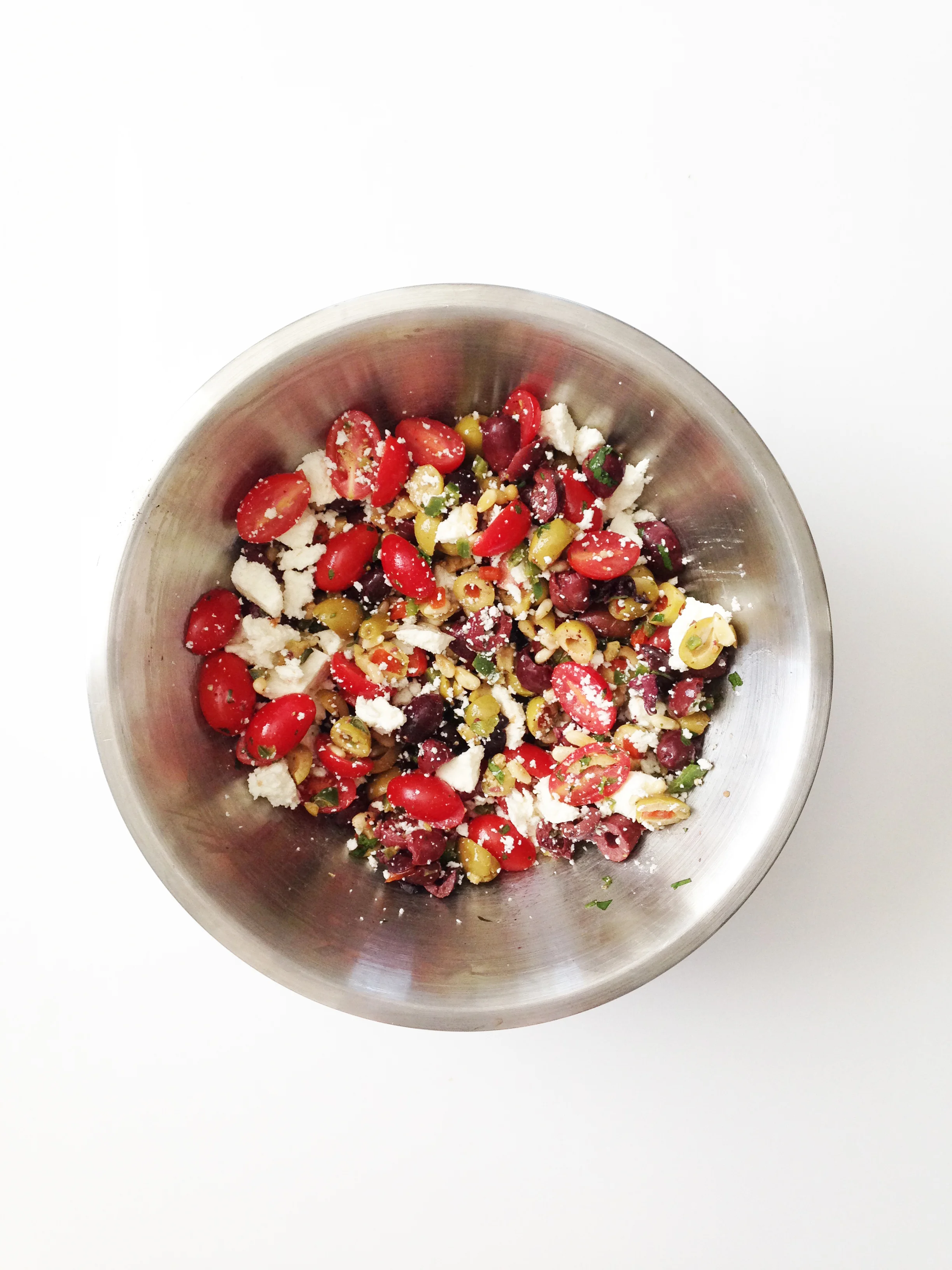I like to make this salad a bit ahead of time, leaving it to marry with all of it's wonderful flavors in the fridge and omitting the queso fresco until I'm ready to serve. If you add the cheese in ahead of time and then let the salad sit, the kalamata olives may start to turn the white queso fresco purple - which is fine if you don't mind purple cheese.