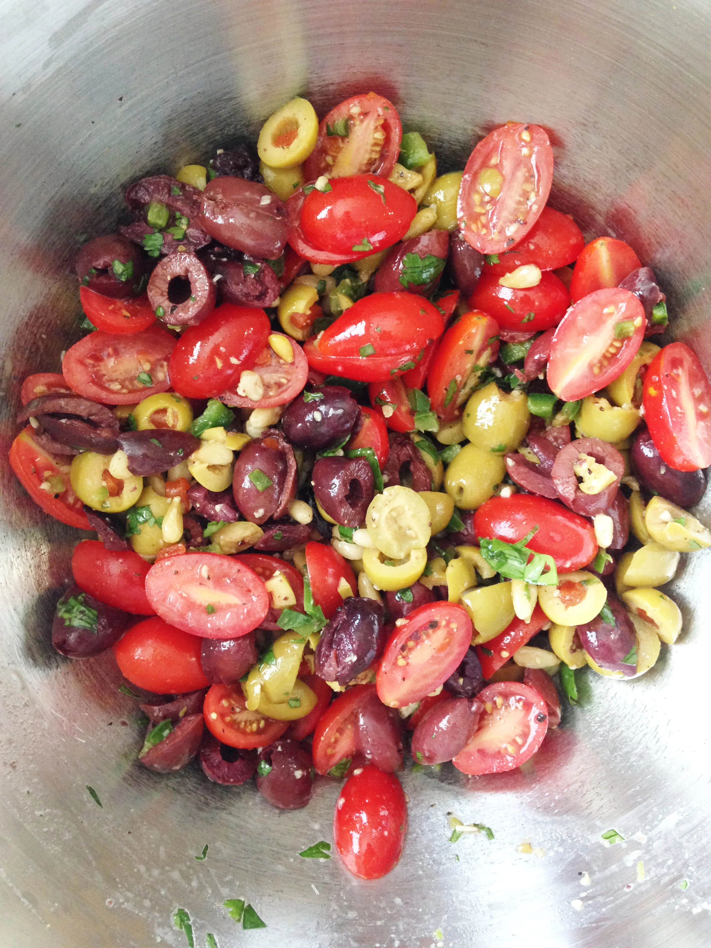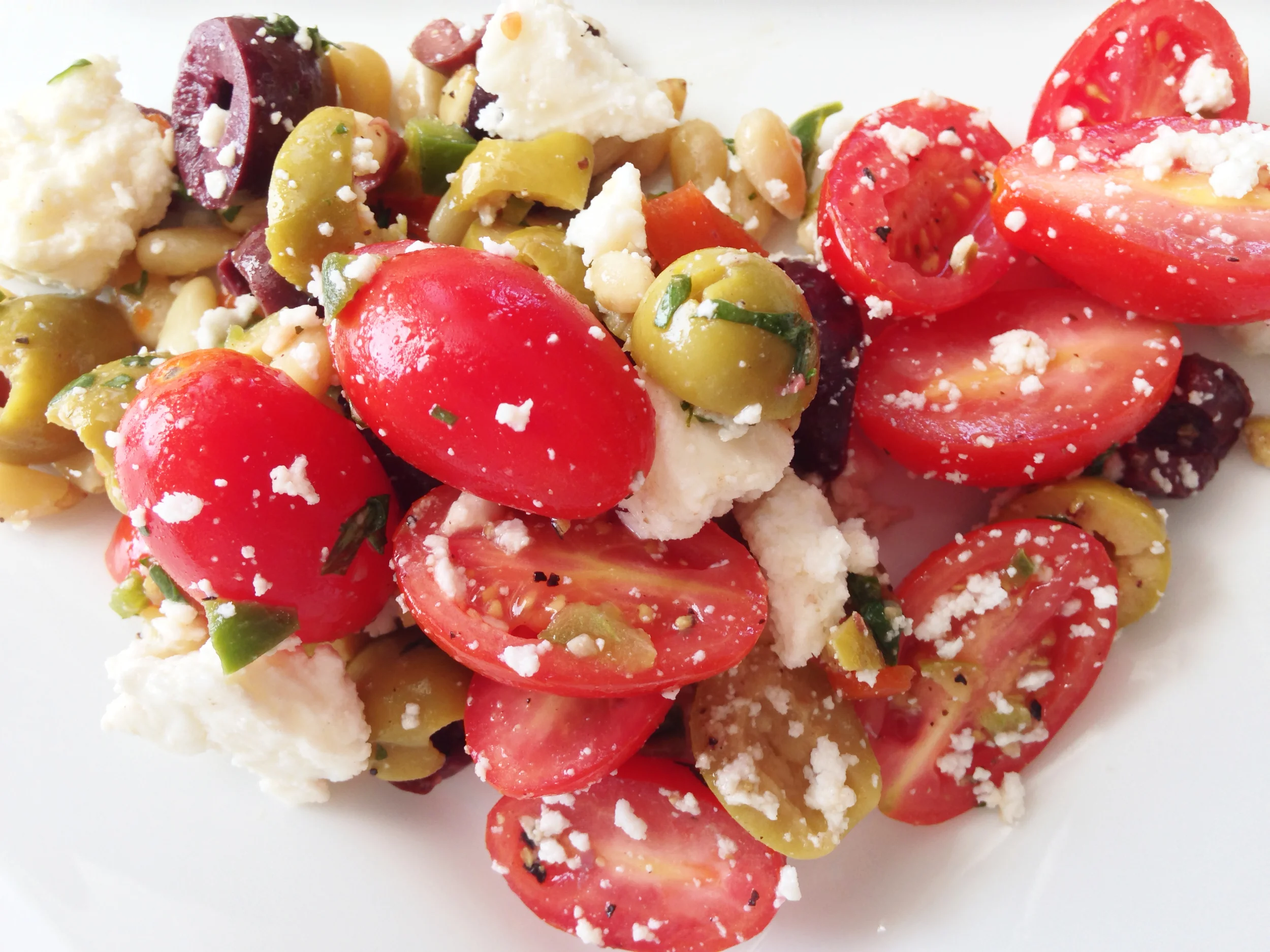 This dish actually reminds a bit of a greek antipasto salad, except that it's meatless and hints towards Mexican roots. There's queso fresco instead of feta, jalapeño in place of peperoncinni and the proud zing of some lime and cilantro added in there.