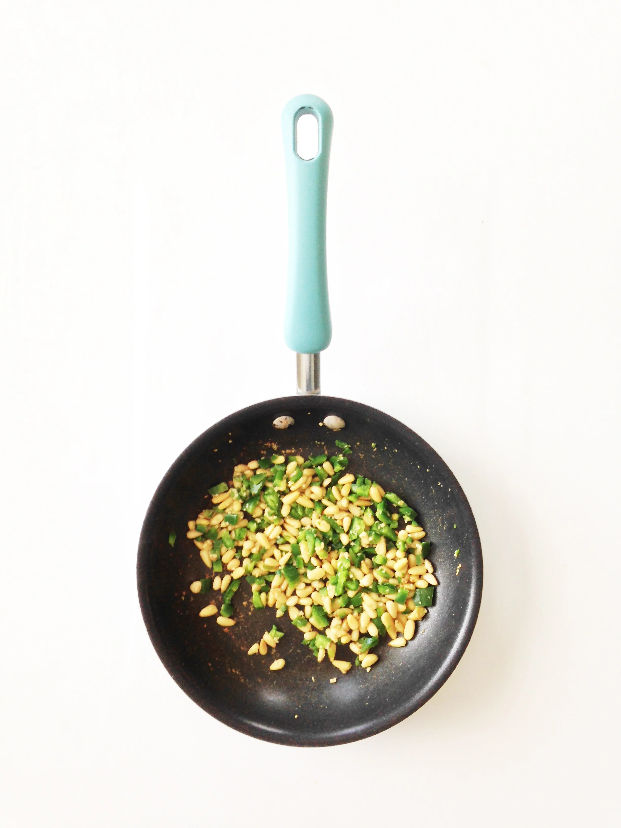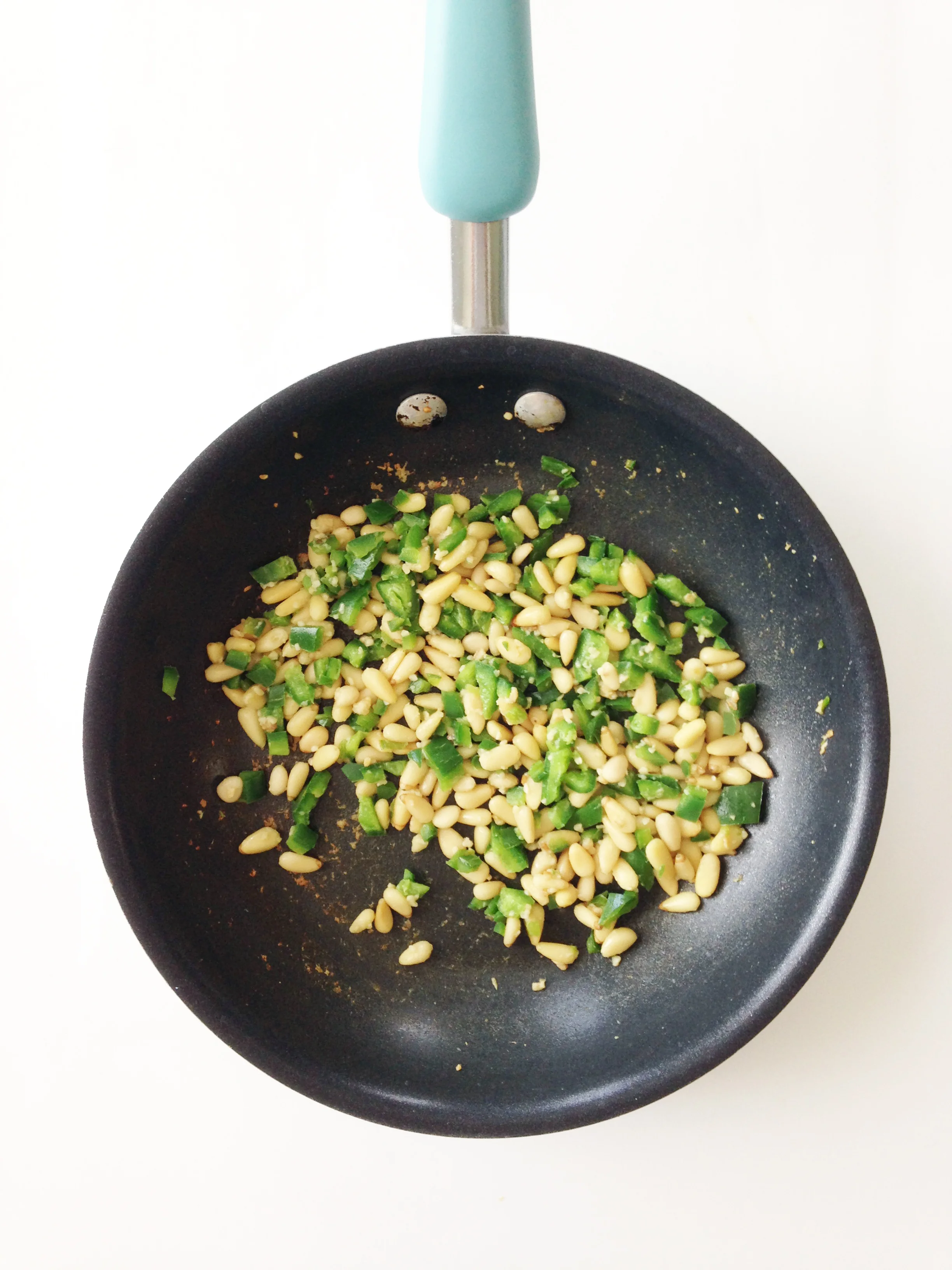 Place the pine nuts, jalapeño and garlic into a small pan and cook over medium heat just until the pine nuts are browning and the vegetables are becoming tender.