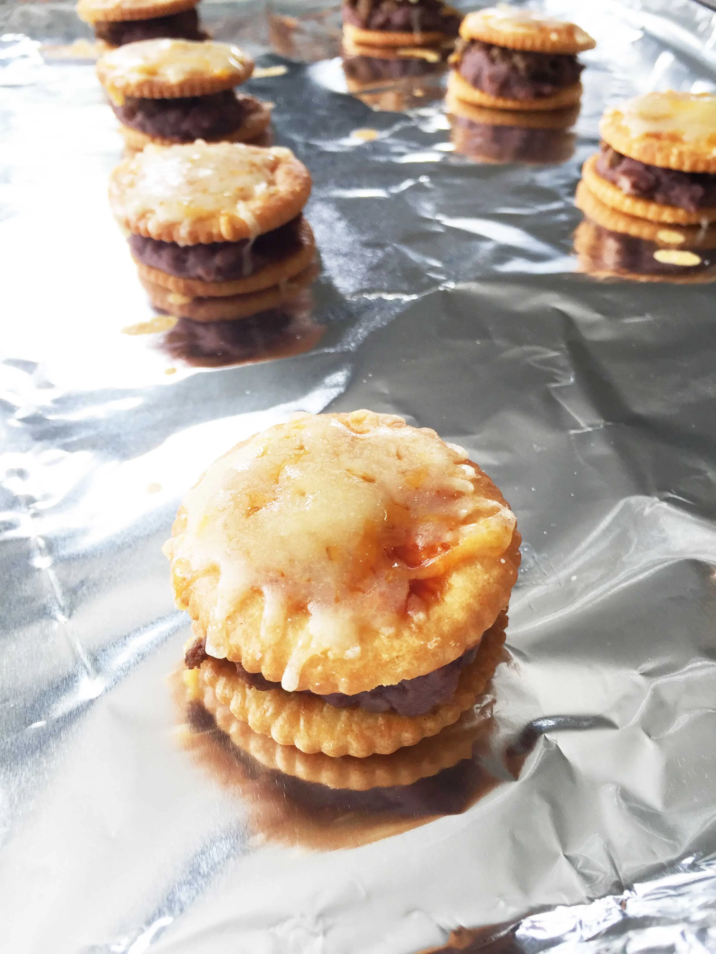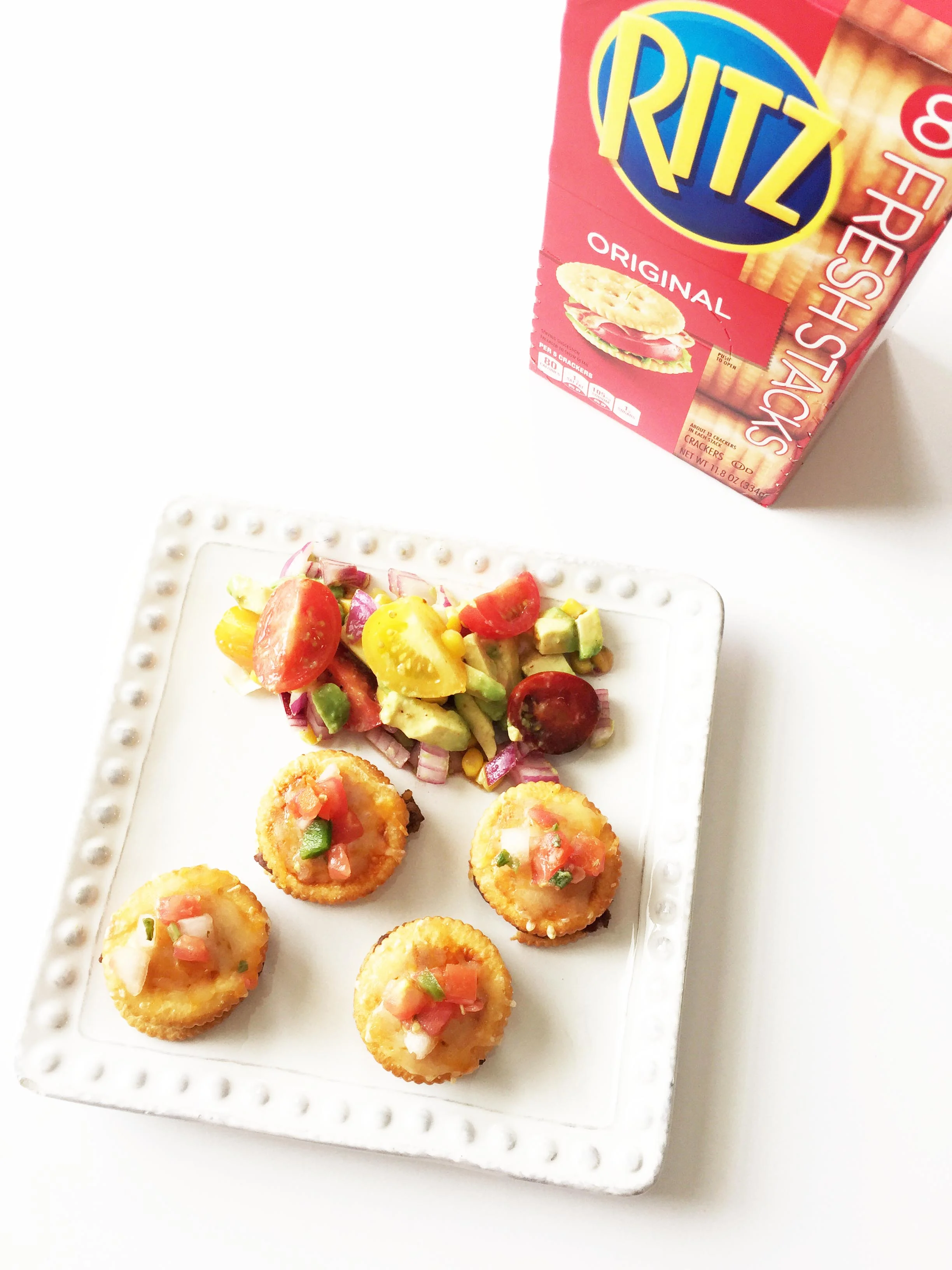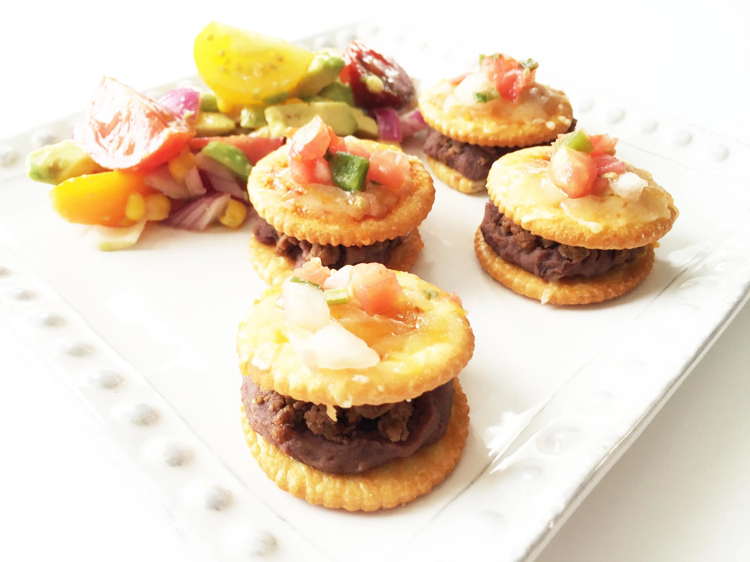To make these little bites better-for-you, I used reduced fat low sodium refried black beans as a base on the RITZ Original, followed by seasoned extra lean ground beef. With another cracker, a touch of red enchilada sauce, shredded cheese and a sprinkle of fresh pico and you have yourself a perfect little snack stack!
