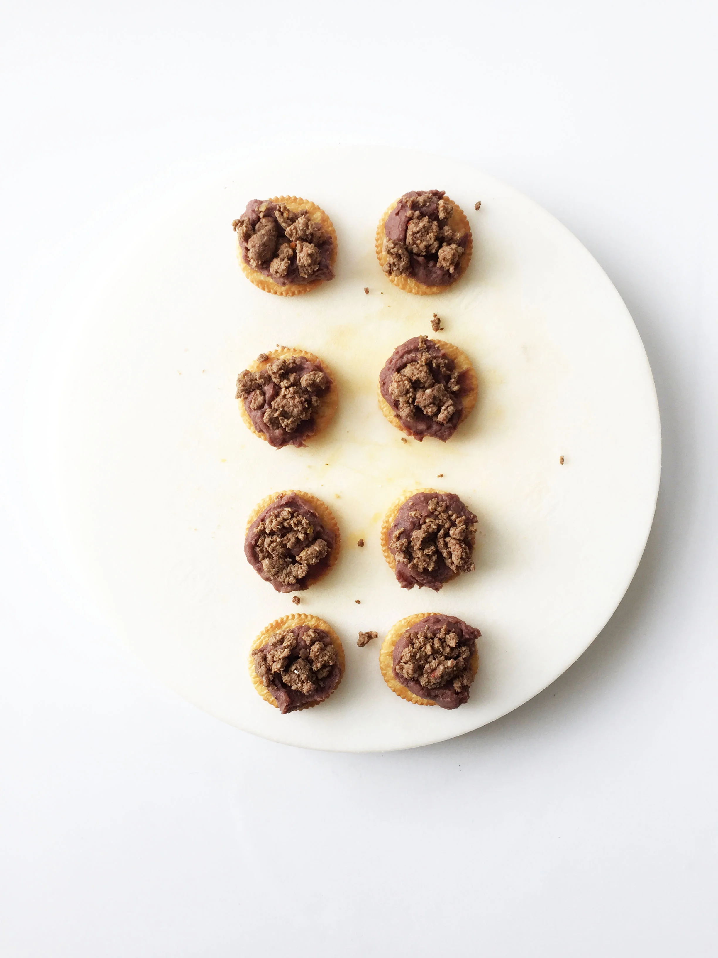Set 8 of the crackers out and top each with 1/2 tbsp. beans, and 1/2 Tbsp. of the seasoned beef.