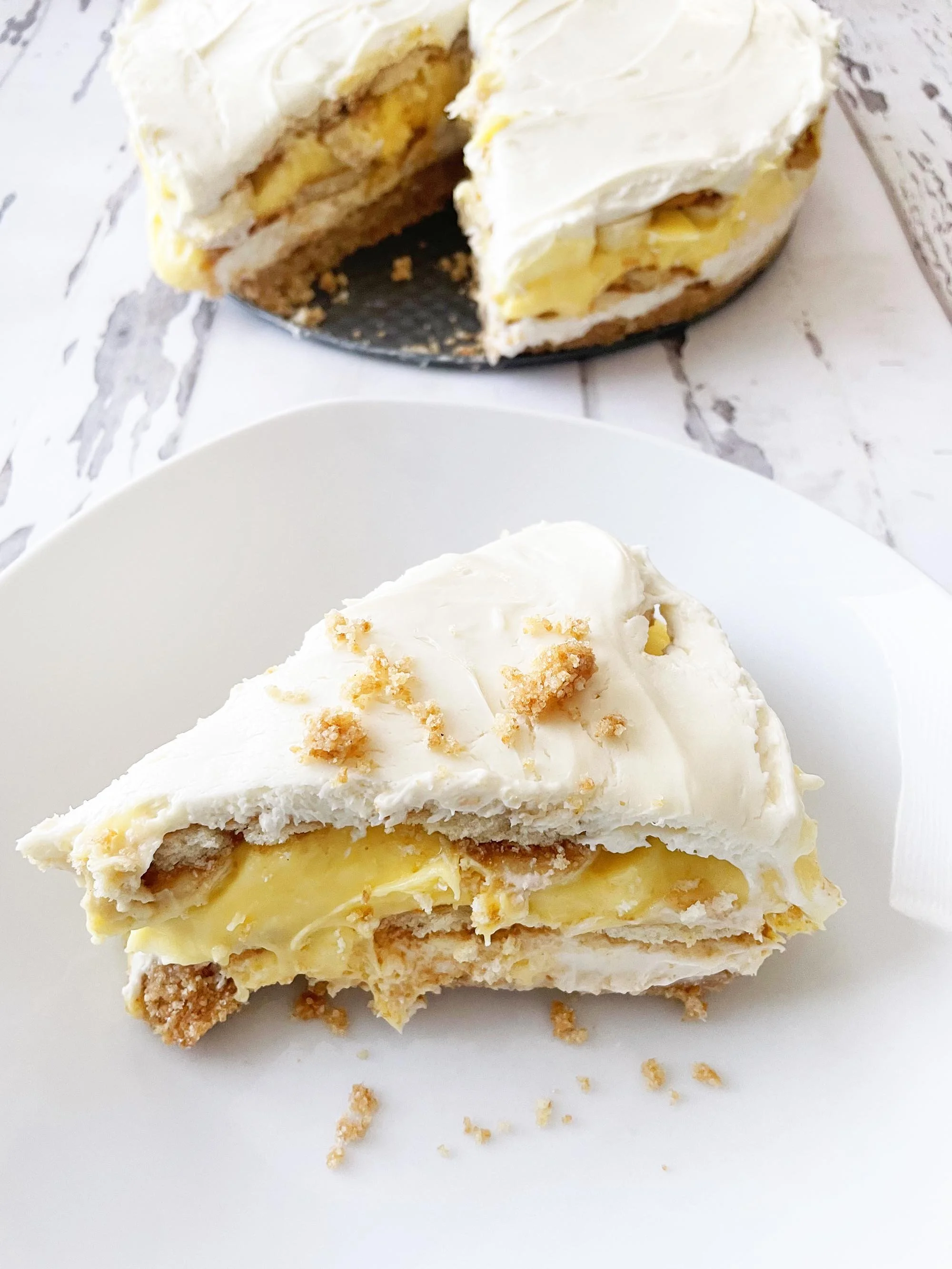 This irresistible treat begins with a delectable vanilla wafer crust, acting as a sturdy foundation, while encasing a rich and luxurious no bake cheesecake filling that is layered with the delightful natural sweetness of ripe, heavenly bananas and a banana pudding fulling. The sumptuous texture of the cheesecake works harmoniously with the smooth and creamy layer of banana pudding that gracefully envelops it.