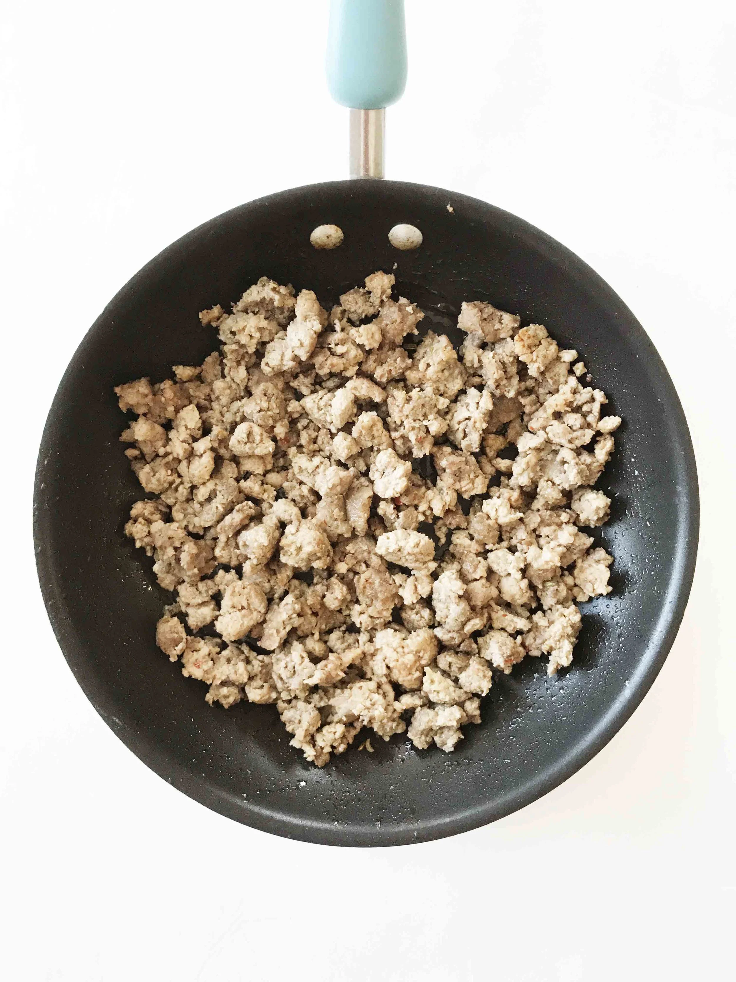 Brown the 1/2 Lb. Johnsonville Mild Italian Sausage (Ground or Links) and 1/2 Lb. Extra Lean Ground Turkey in the skillet over medium-high heat until cooked through.
