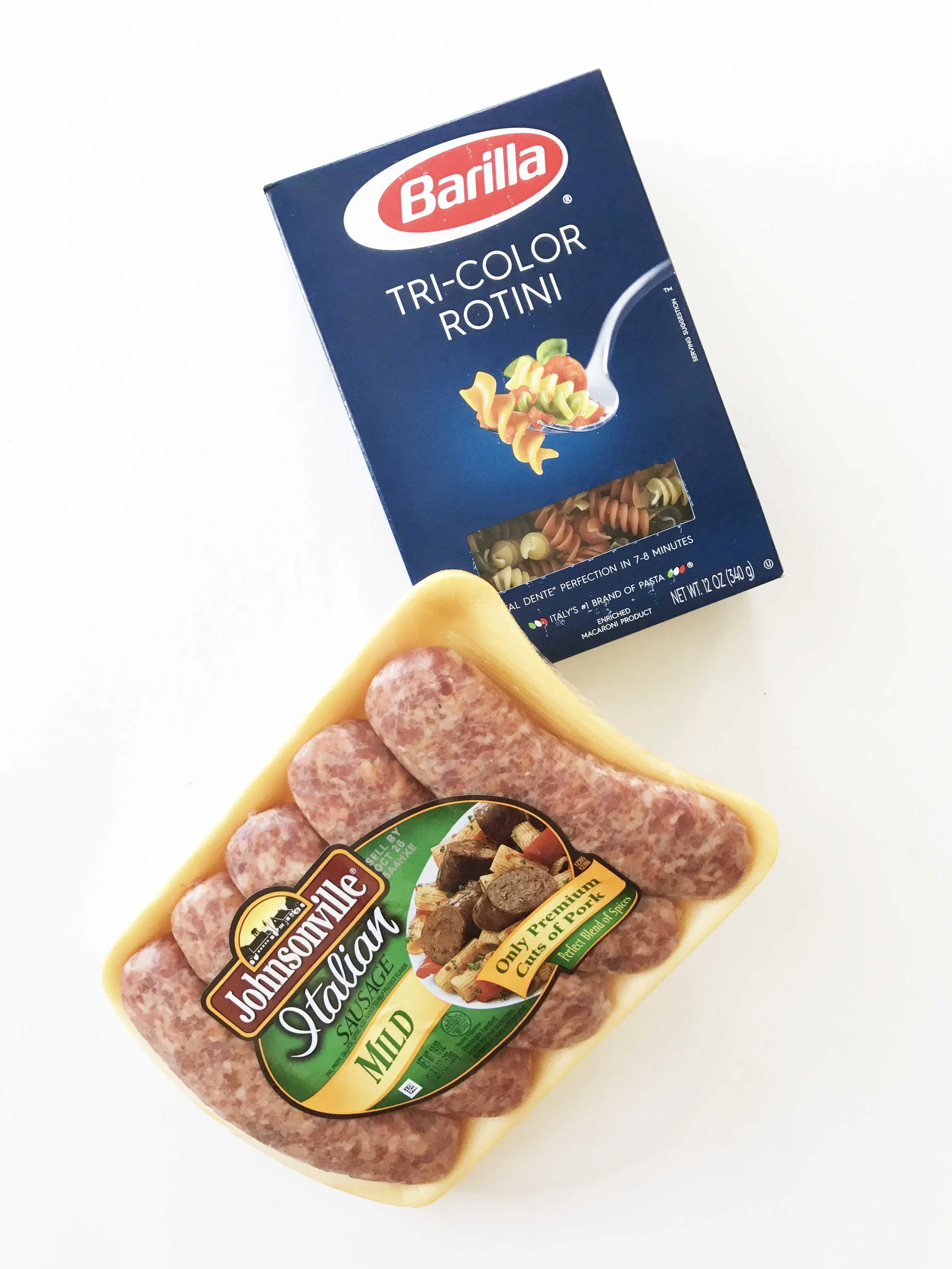 When I was out of town this weekend, I came across a Kroger store. So, naturally I had to stop by and check it out. While there, I picked up some Barilla Tri-Color Rotini and Johnsonville Mild Italian Sausage. (I told you, I've been on a pasta kick lately!) Did you know that Barilla is Italy's #1 brand of pasta? It makes this dinner (and any other) quick, easy, and completely versatile!