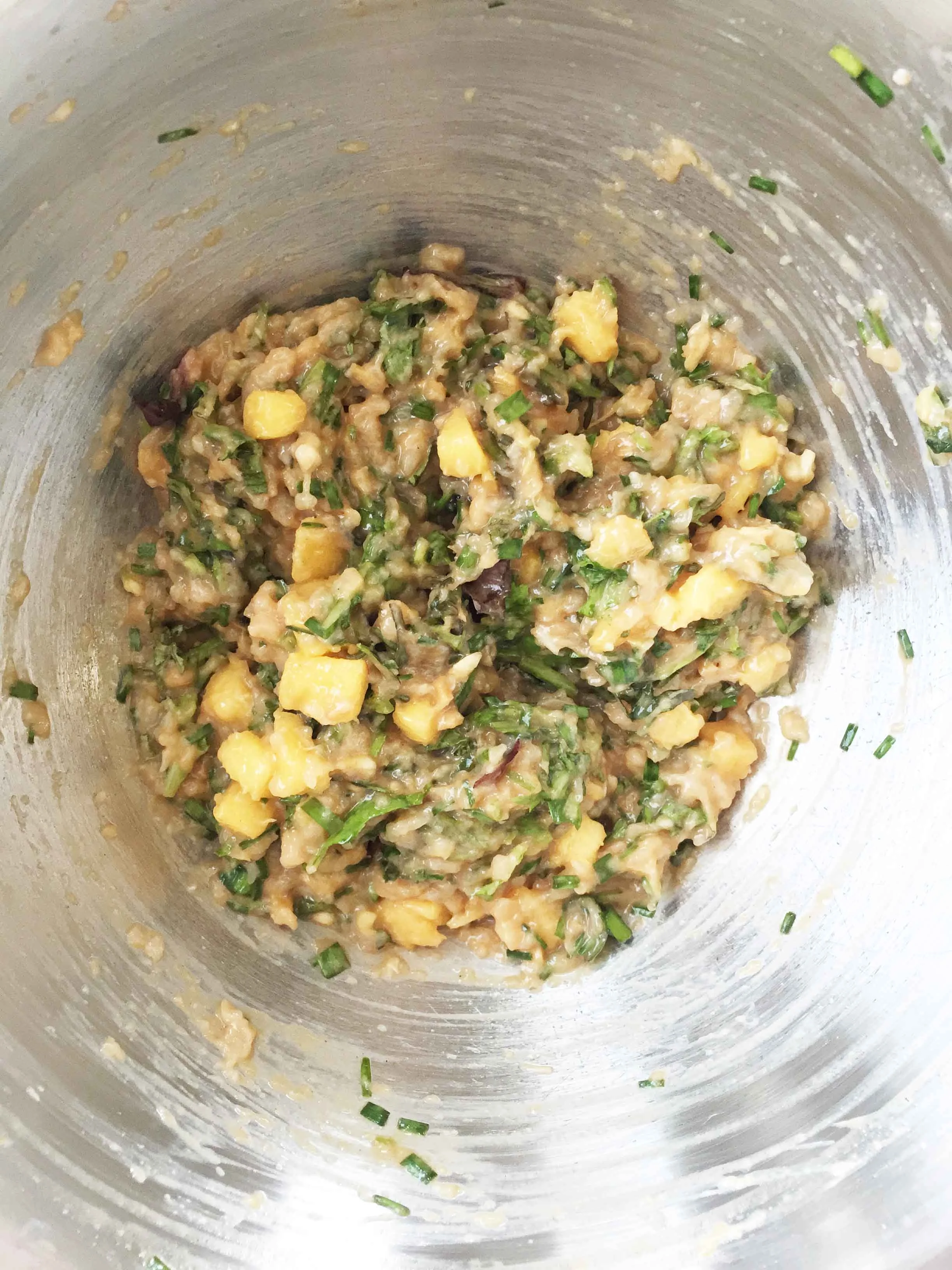 Combine the chicken, greens, peach, chives, ginger, garlic, sesame oil, hot sauce, vinegar, and pepper into a medium bowl until well blended.