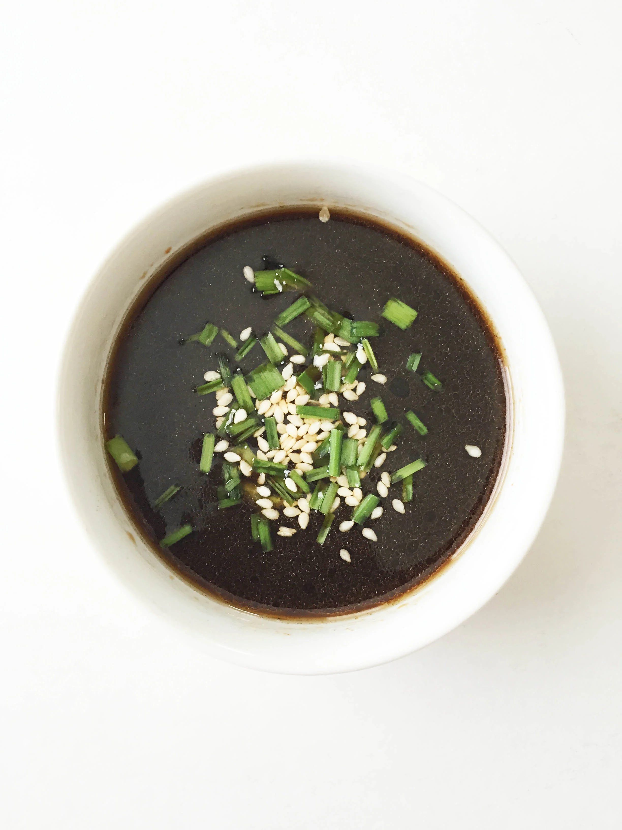 While the pan is getting hot, whisk together the ingredients for the spicy soy dipping sauce in a small bowl; set aside.