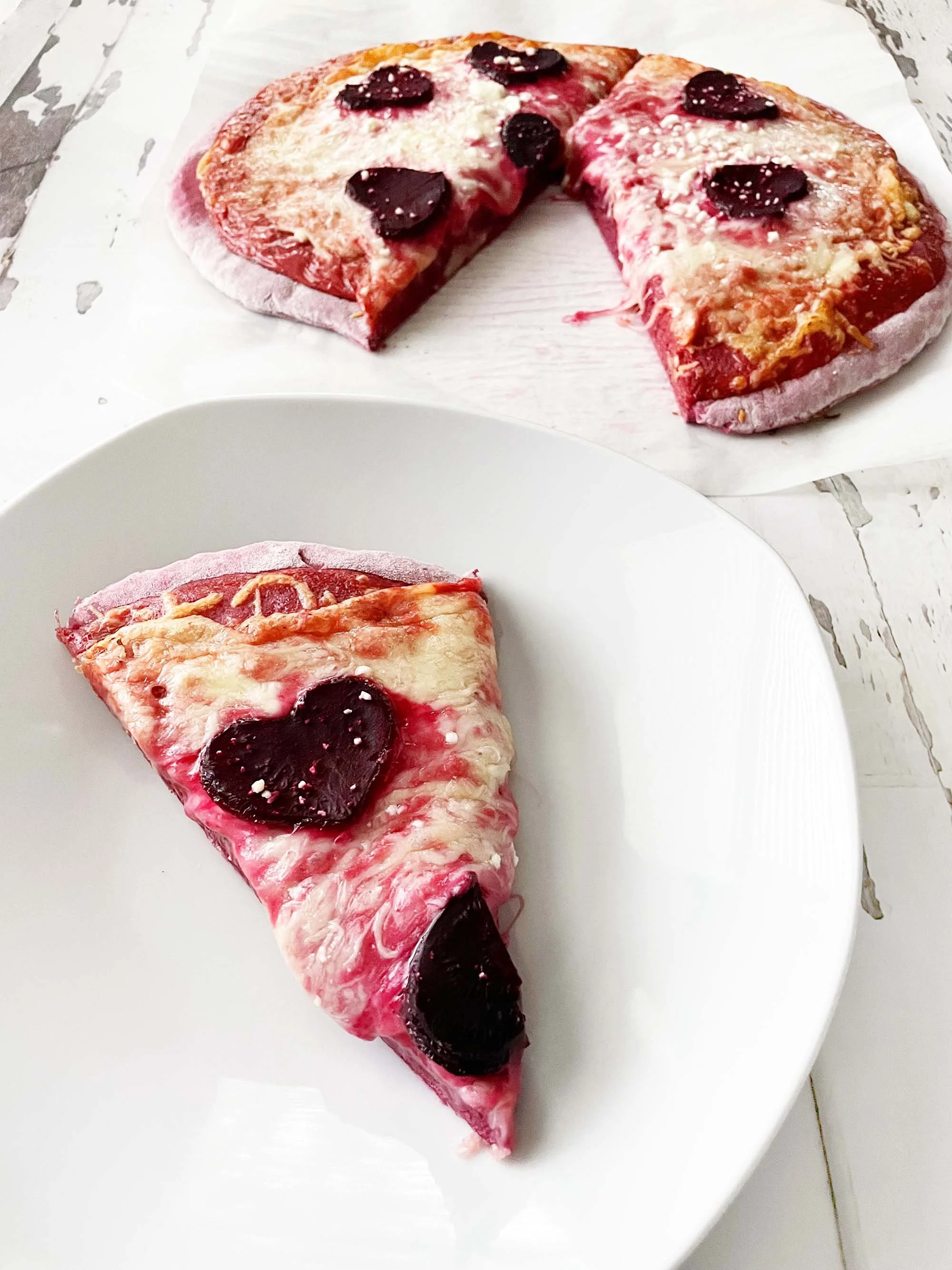 I decided to make a Valentine’s day pizza with this Pink Beet Pizza Dough, mixing some beet puree with an alfredo sauce and then topping that off with cheese and some heart shaped beet cut outs! This was a really tasty and pretty Valentine treat. Even my picky 13 kiddo scarfed on the pizza and didn’t complain once about any overpowering beet taste.